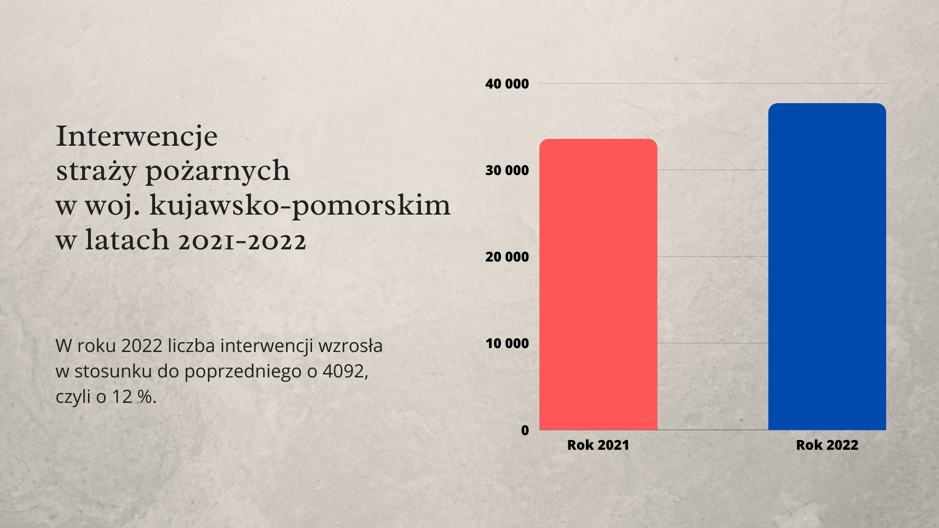 W 2022 r. w woj. kujawsko-pomorskim strażacy interweniowali 37 660 razy, to wzrost o ponad 4000 interwencji w stosunku do roku poprzedniego. To też największa liczba zdarzeń, odnotowana w ciągu 30-letniej historii Państwowej Straży Pożarnej.