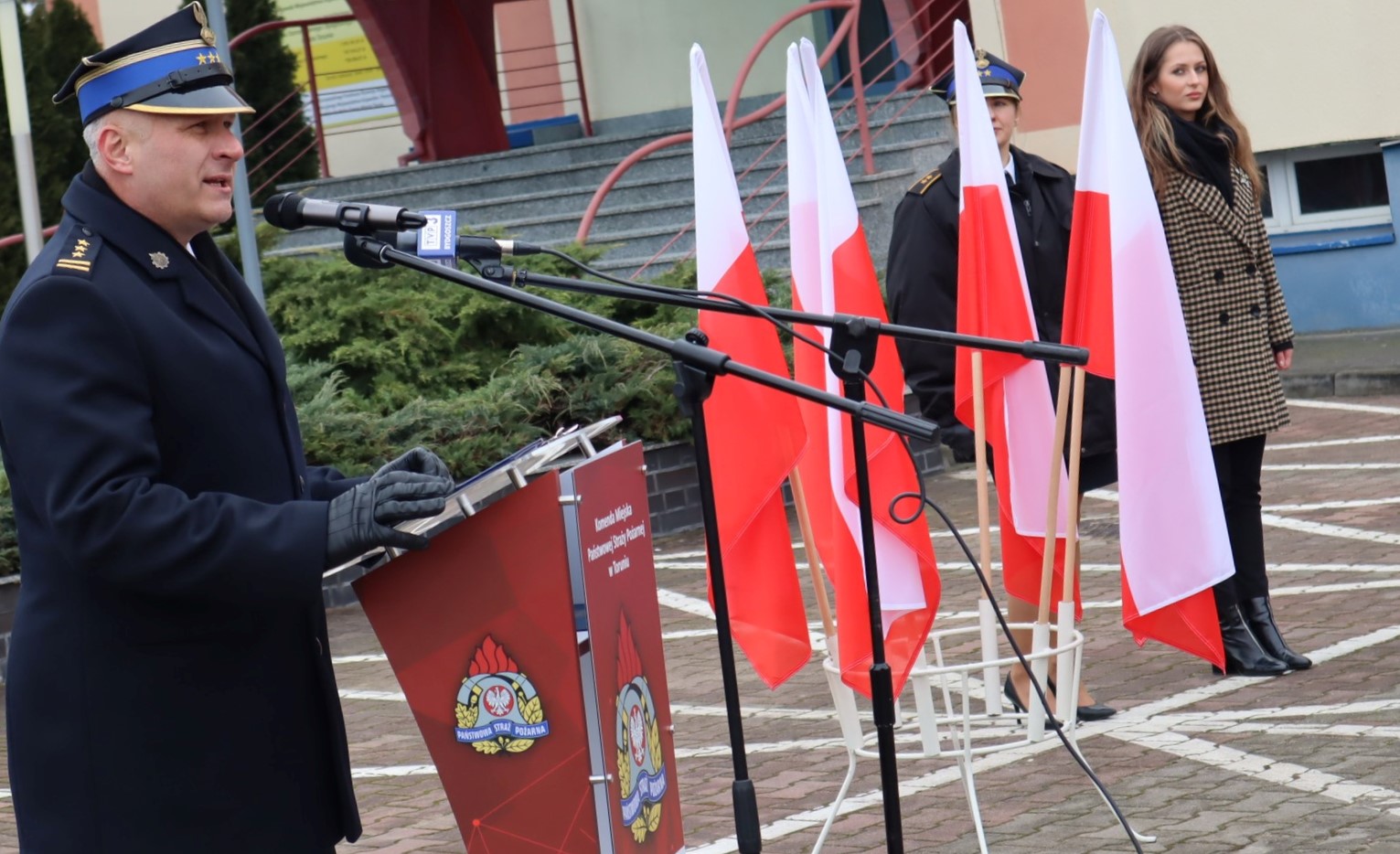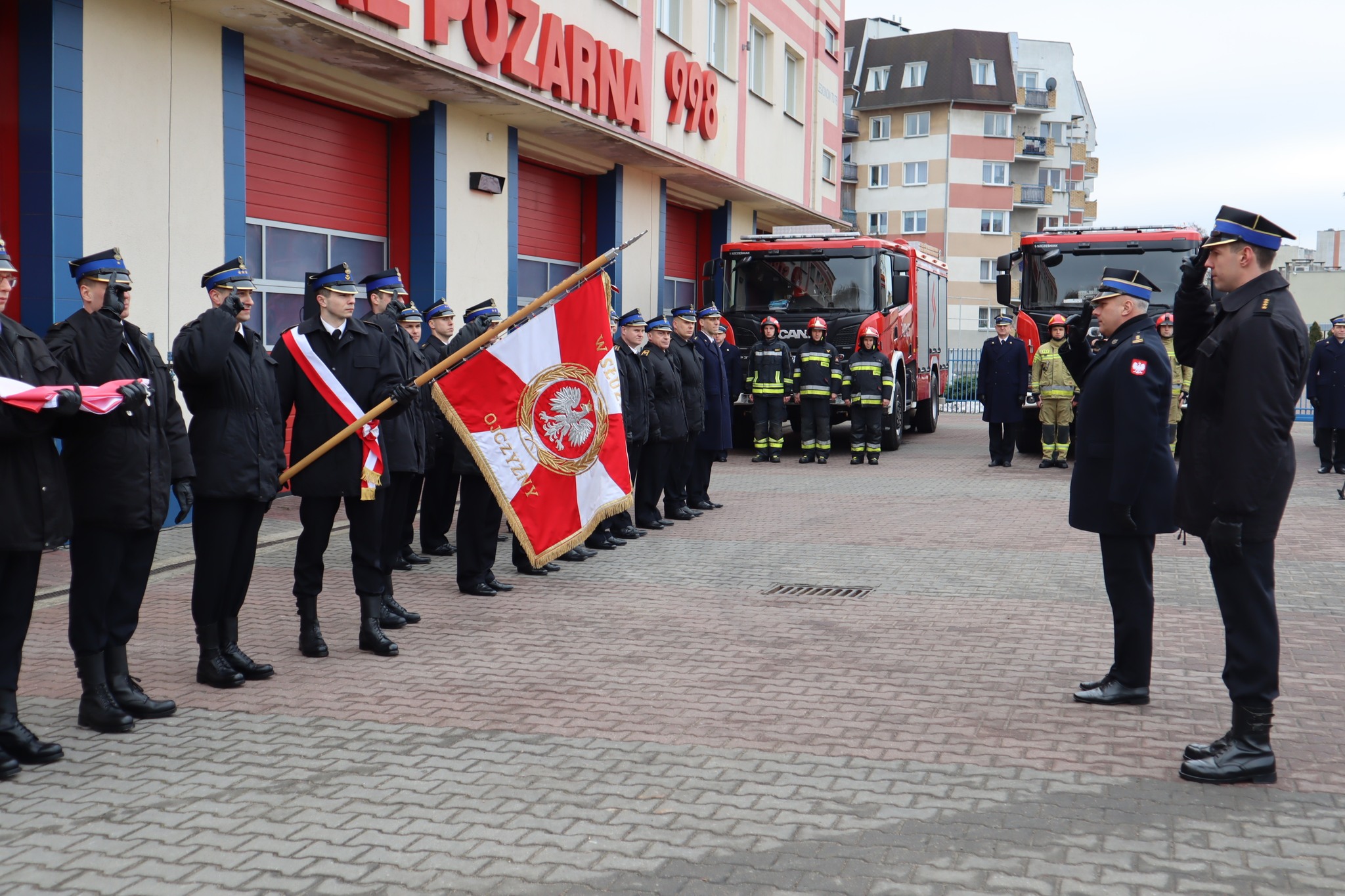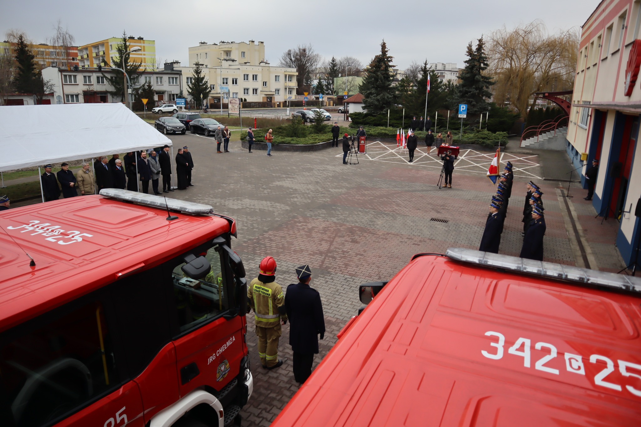 Uroczysta zbiórka w KM PSP w Toruniu - odznaczenia dla zasłużonych i nowe wozy do działań