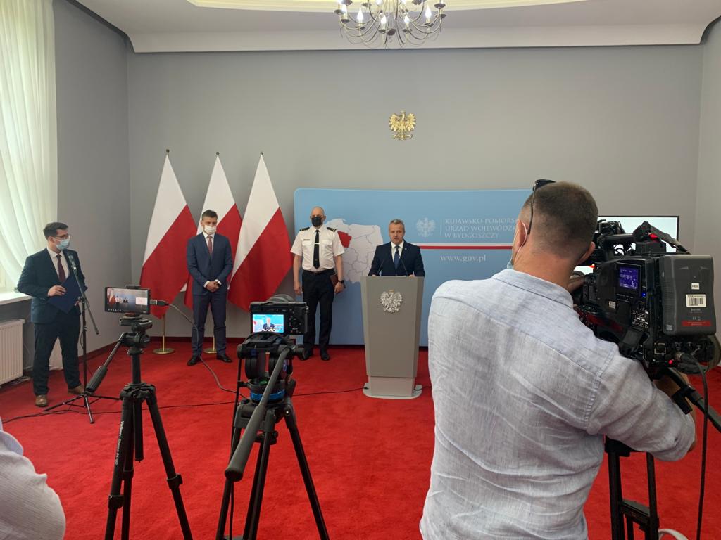 Konferencja prasowa z udziałem wojewody kujawsko-pomorskiego Mikołaja Bogdanowicza, Zastępcy Kujawsko-Pomorskiego Komendanta Wojewódzkiego PSP st. bryg. Sławomira Herbowskiego oraz Dyrektora Wydziału Bezpieczeństwa i Zarządzania Kryzysowego K-PUW w Bydgoszczy Rafała Rewolińskiego, rozpoczęła proces przejęcia rozmówców z numeru alarmowego 998 przez europejski numer ratowniczy 112.