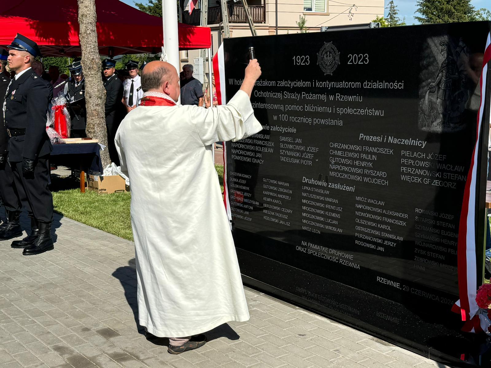 Po uroczystym przywitaniu gości przez Prezesa Zarządu Gminnego OSP w Rzewniu dh. Marka Skrzecza nastąpiło odczytanie rysu historycznego jednostki OSP w Rzewniu i uroczyste odsłonięcie i poświęcenie tablicy pamiątkowej.
