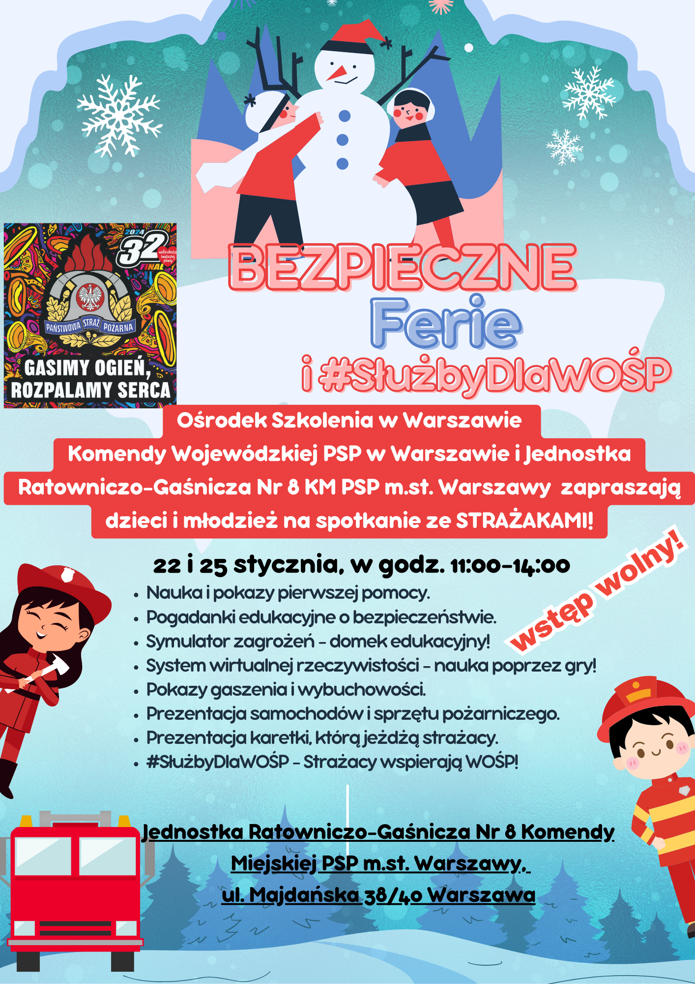 Ośrodek Szkolenia w Warszawie Komendy Wojewódzkiej PSP w Warszawie i Jednostka Ratowniczo-Gaśnicza Nr 8 Komendy Miejskiej PSP m.st. Warszawy serdecznie zapraszają dzieci i młodzież na spotkanie edukacyjne „Bezpieczne Ferie” i #SłużbyDlaWOŚP ze strażakami!