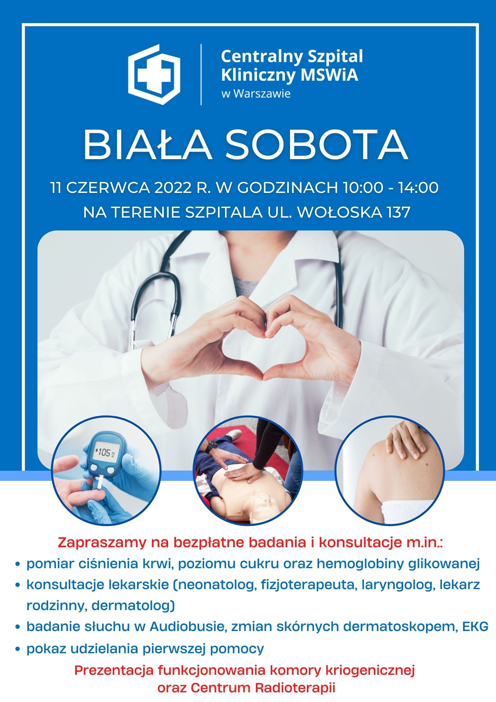 Podczas pikniku pn. „BIAŁA SOBOTA” będą mogli Państwo wziąć udział w bezpłatnych badaniach i konsultacjach lekarskich.