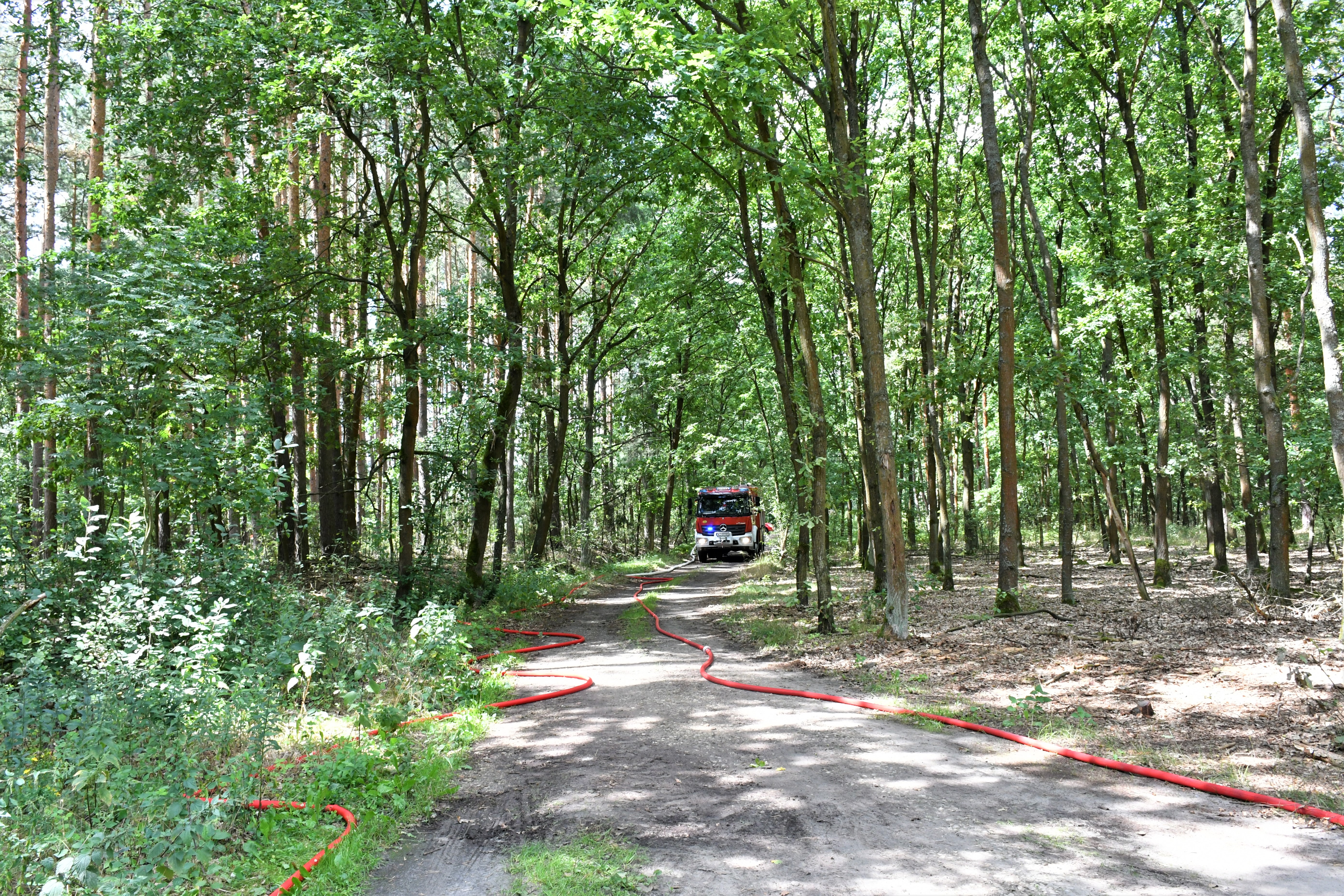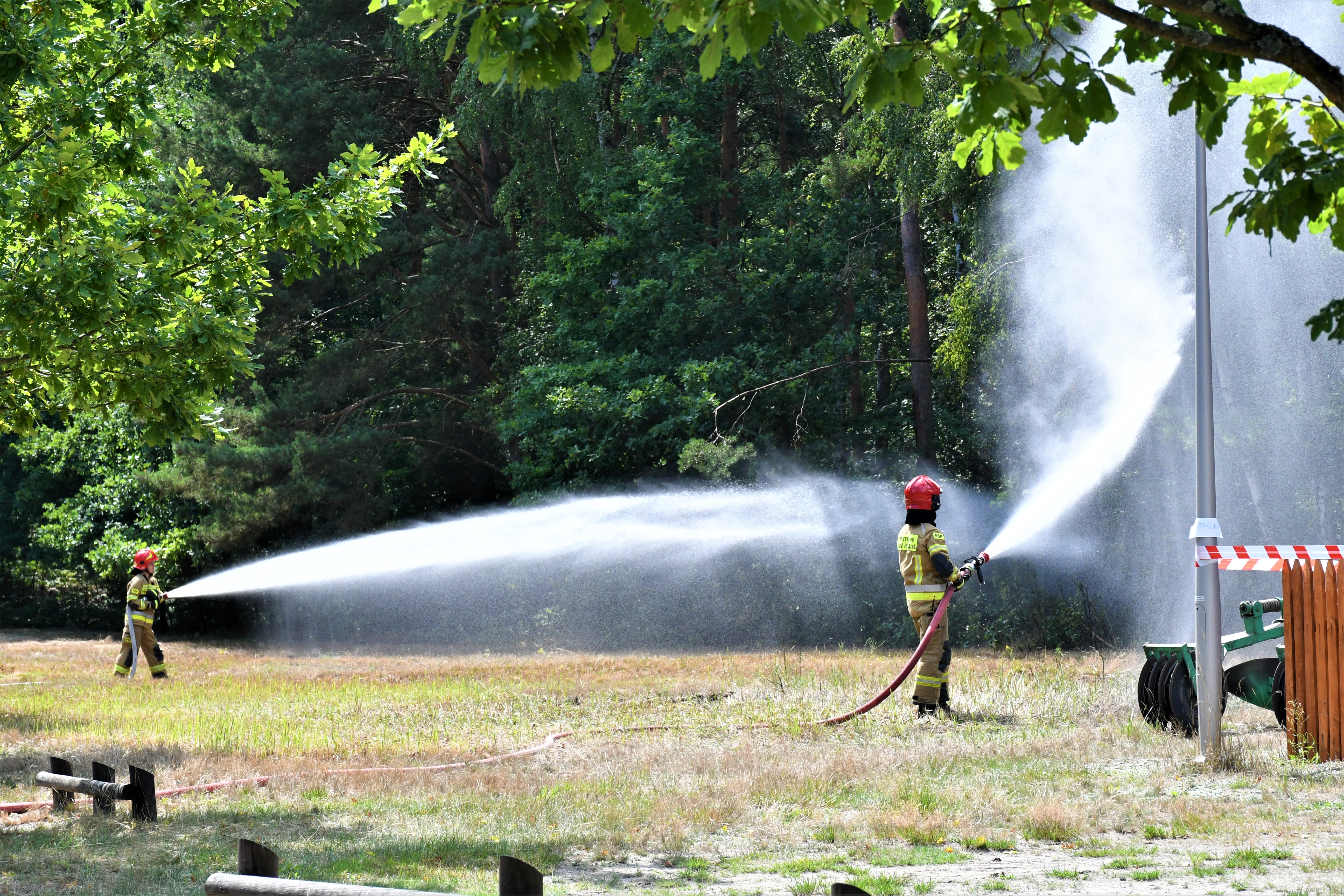 Do wykonania założeń zostało zadysponowanych 18 zastępów straży pożarnej z terenu województwa, w tym pojazdów specjalistycznych z pompami wysokiej wydajności, autocysterna, samochód wężowy. Takimi siłami udało się zbudować zaopatrzenie w wodę do celów gaśniczych na odcinku ponad dwóch kilometrów, podanie sześciu prądów wody na front pożaru oraz dwóch w obronie skansenu. Dzięki zasilaniu z niewyczerpalnego źródła wody oraz sieci hydrantowej udało się osiągnąć stały wydatek wody na wszystkich liniach gaśniczych, zgodnie z założeniami.