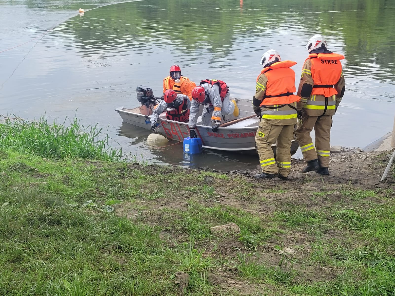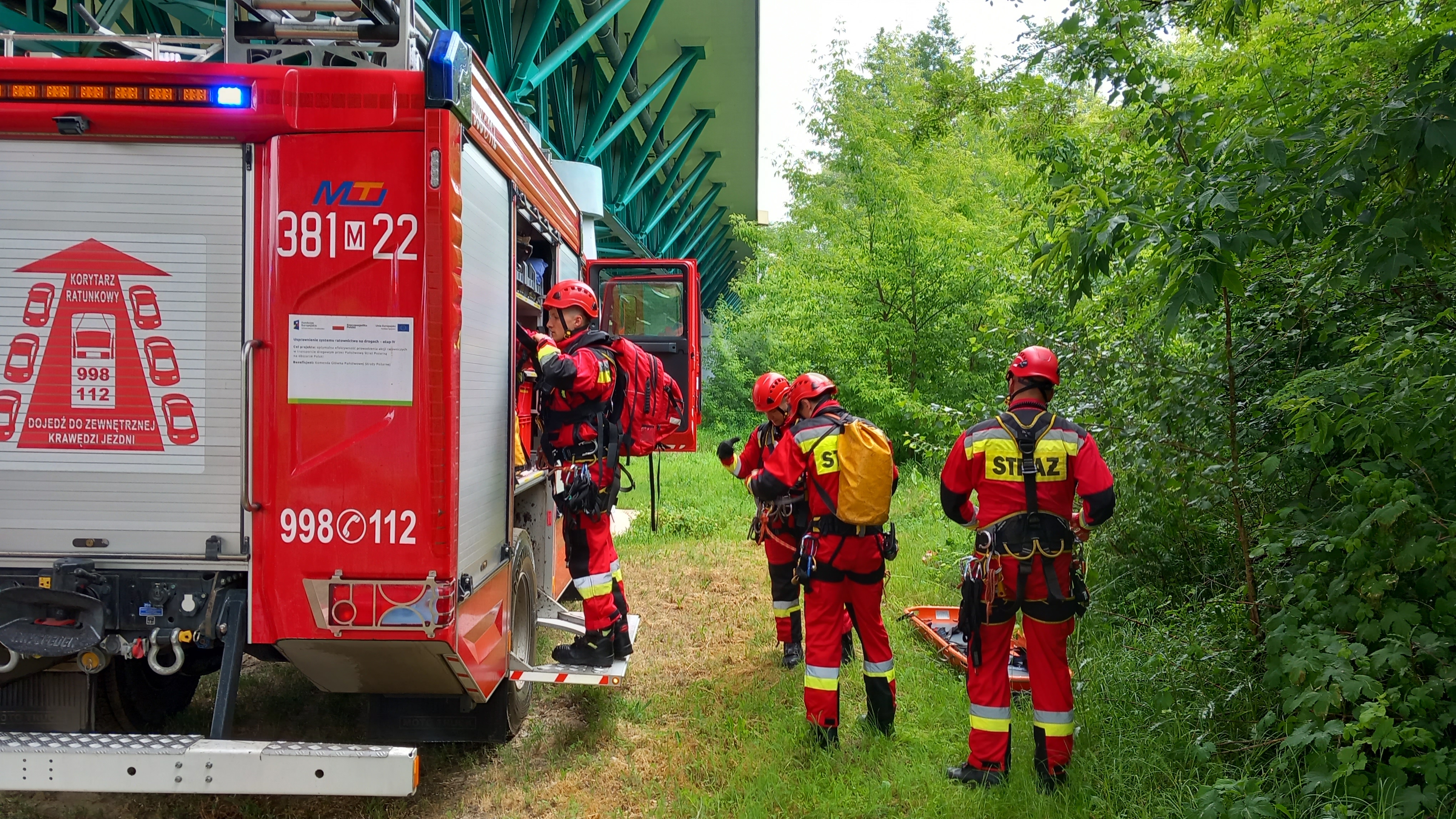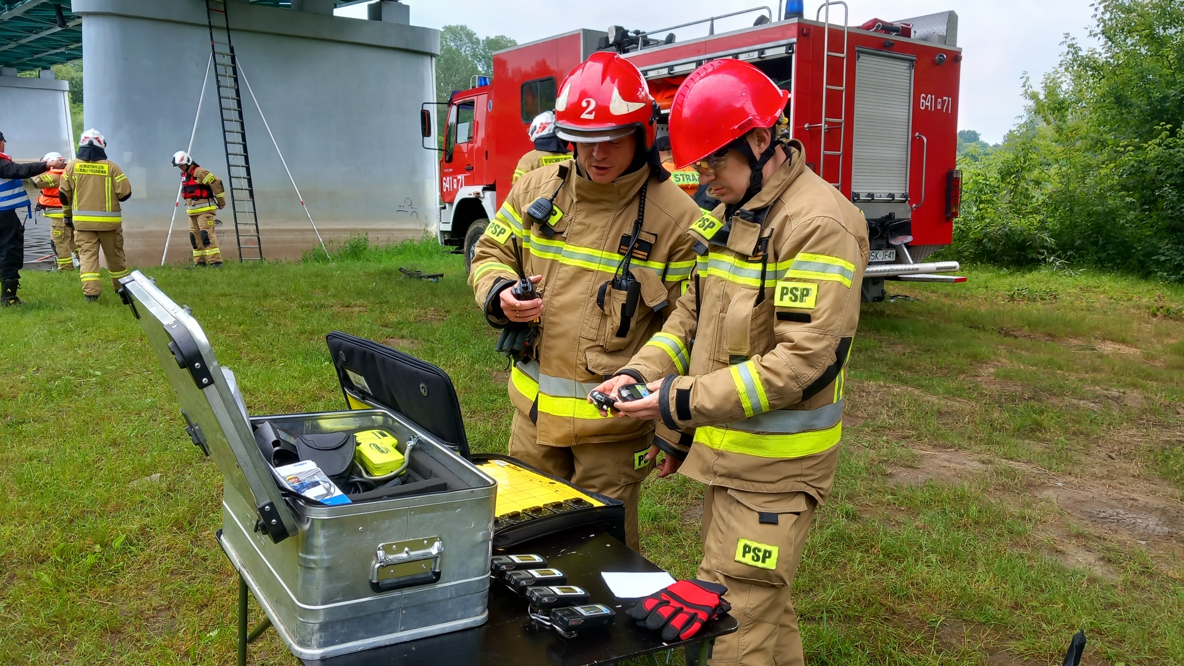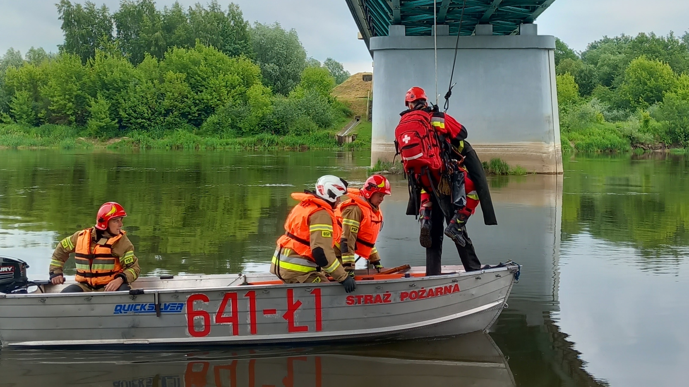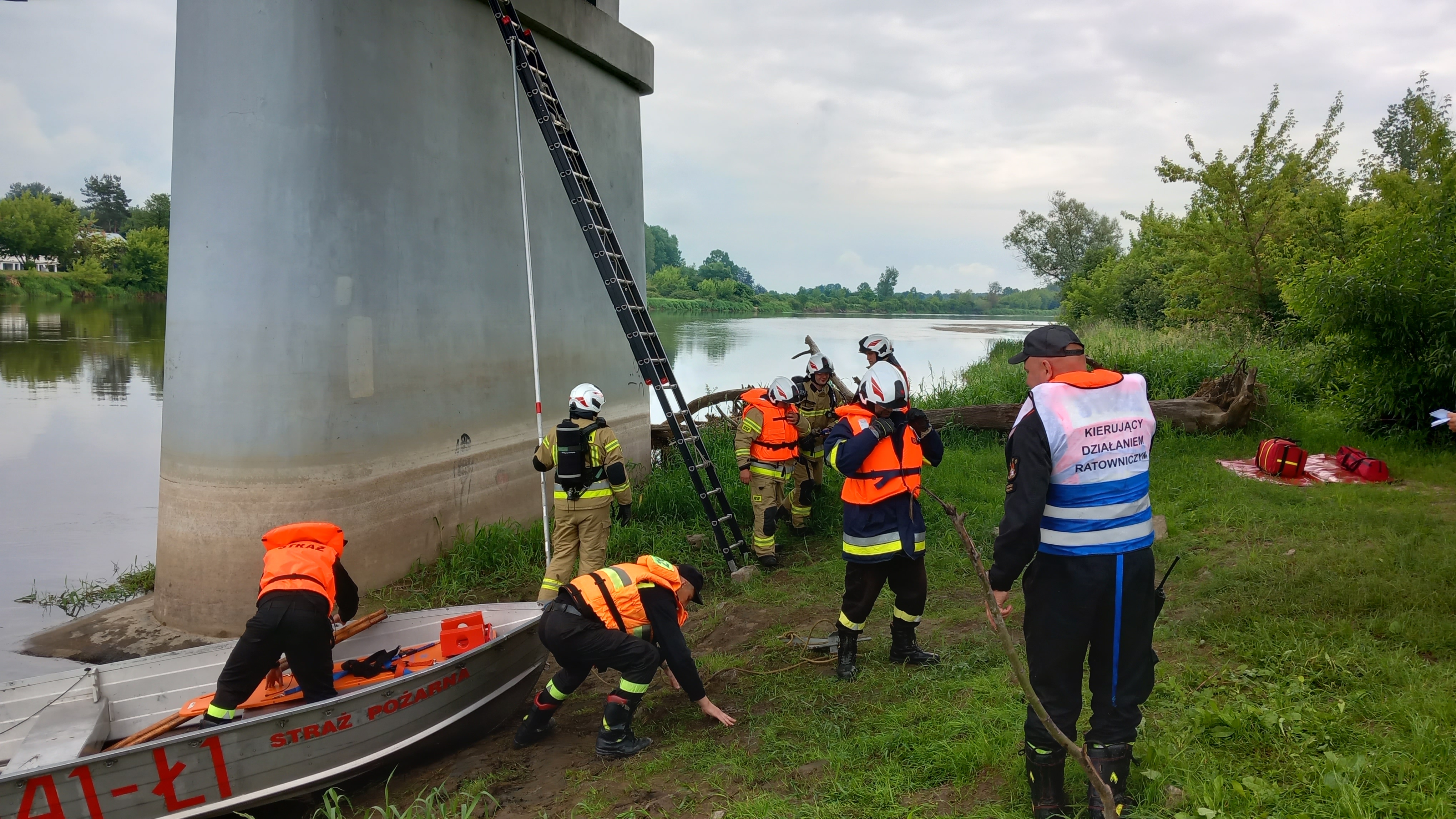 Strażacy OSP i PSP docierają pod most i zabezpieczają działania. Ratownicy SGRChem-Eko przeprowadzają pomiary i określają czy jest bezpiecznie oraz czy doszło do uwolnienia substancji w wodzie. Ratownicy SGRW przemieszczają się po konstrukcji mostu i przy wykorzystaniu odpowiedniego sprzętu i technik linowych docierają do poszkodowanego i przygotowują go do ewakuacji na łódź ratowniczą.