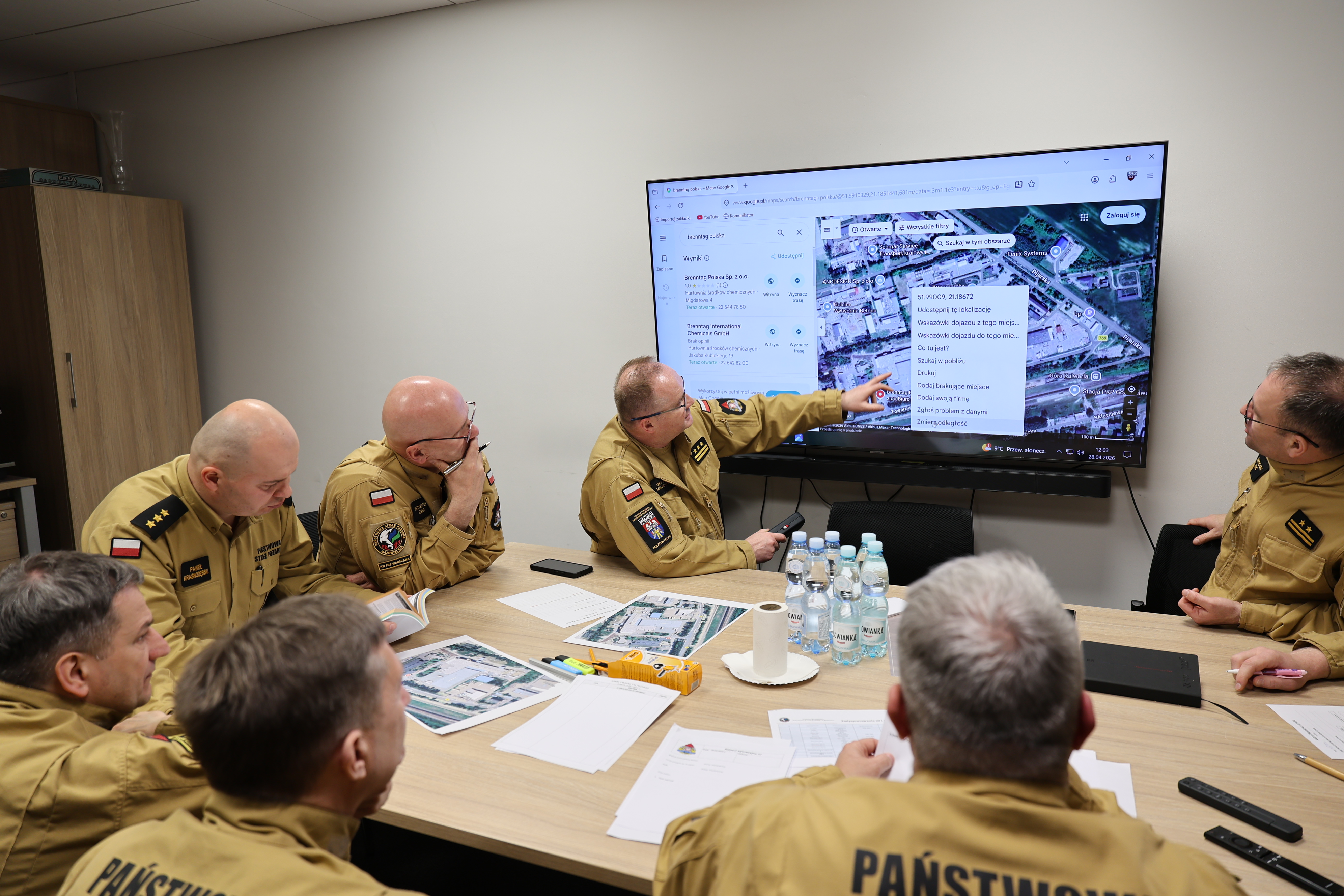 Przygotowując się bezpośrednio do ćwiczenia praktycznego, omówiono specyfikę pracy sztabu w kontekście działań ratowniczych na terenie zakładów dużego ryzyka wystąpienia poważnej awarii przemysłowej.