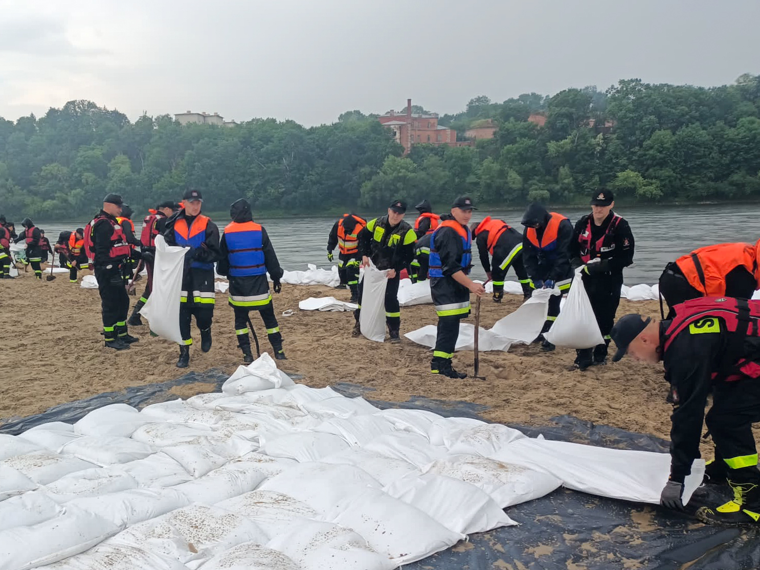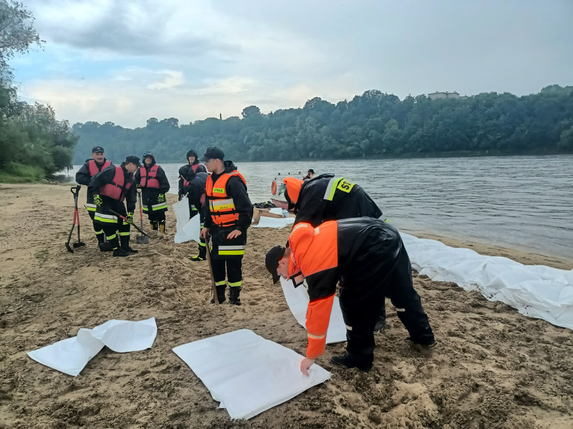 - podwyższenie linii brzegowej o 60 cm (utworzenie wału) na odcinku 50 m za pomocą zapór oraz worków z piaskiem;