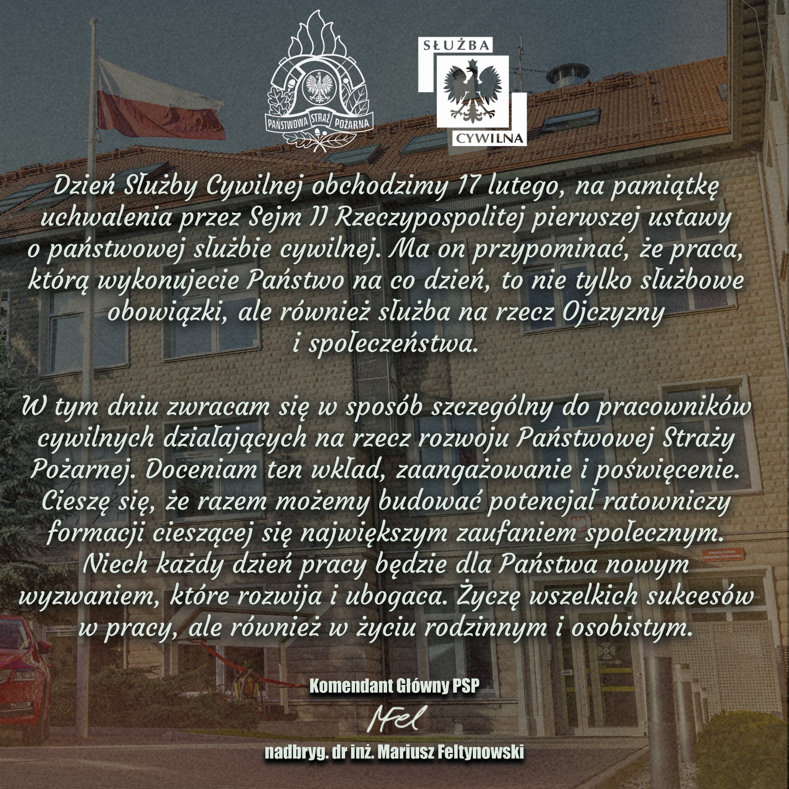 W tym dniu zwracam się w sposób szczególny do pracowników cywilnych działających na rzecz rozwoju Państwowej Straży Pożarnej. Doceniam ten wkład, zaangażowanie i poświęcenie. Cieszę się, że razem możemy budować potencjał ratowniczy formacji cieszącej się największym zaufaniem społecznym. Niech każdy dzień pracy będzie dla Państwa nowym wyzwaniem, które rozwija i ubogaca. Życzę wszelkich sukcesów w pracy, ale również w życiu rodzinnym i osobistym.