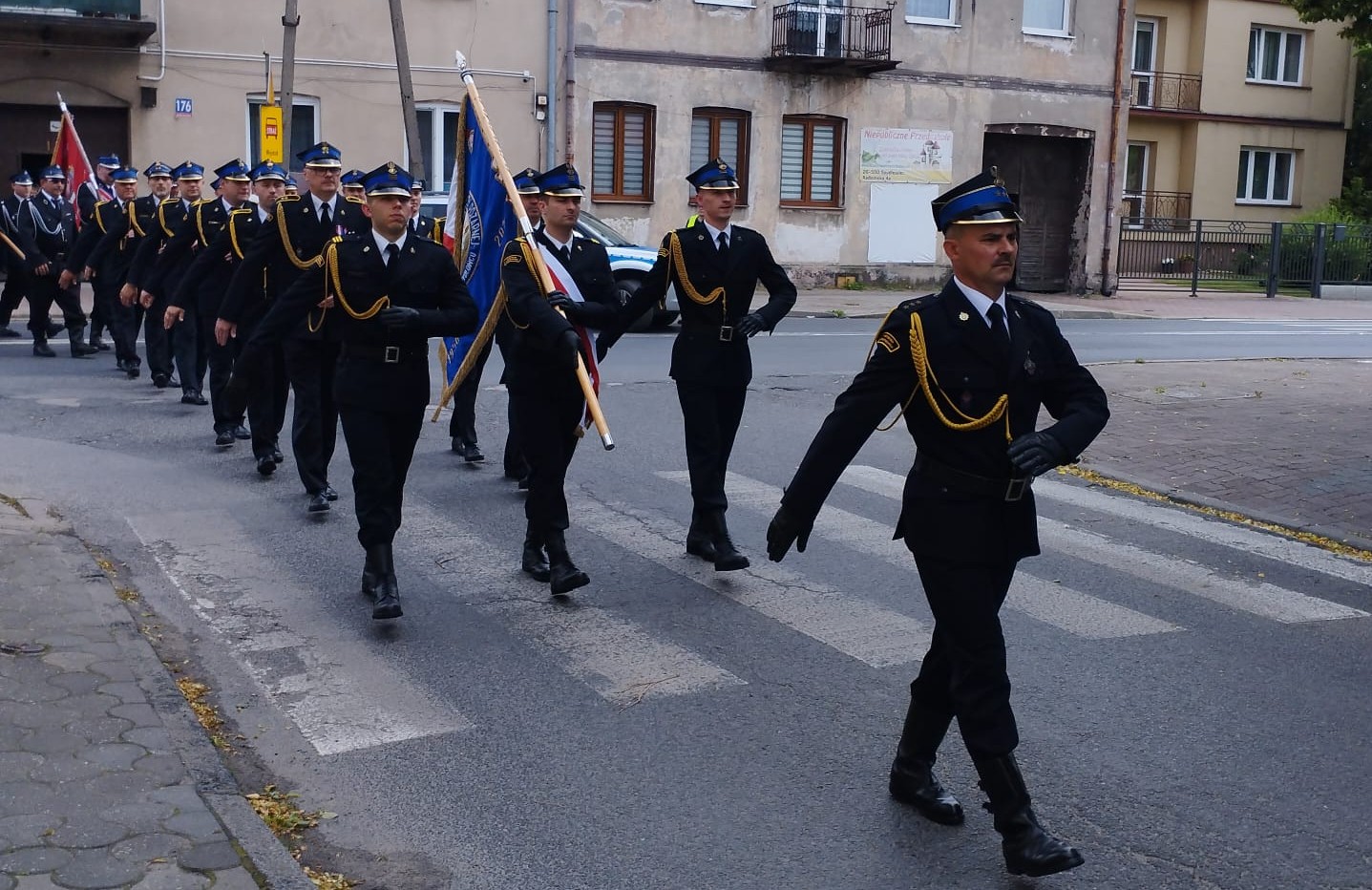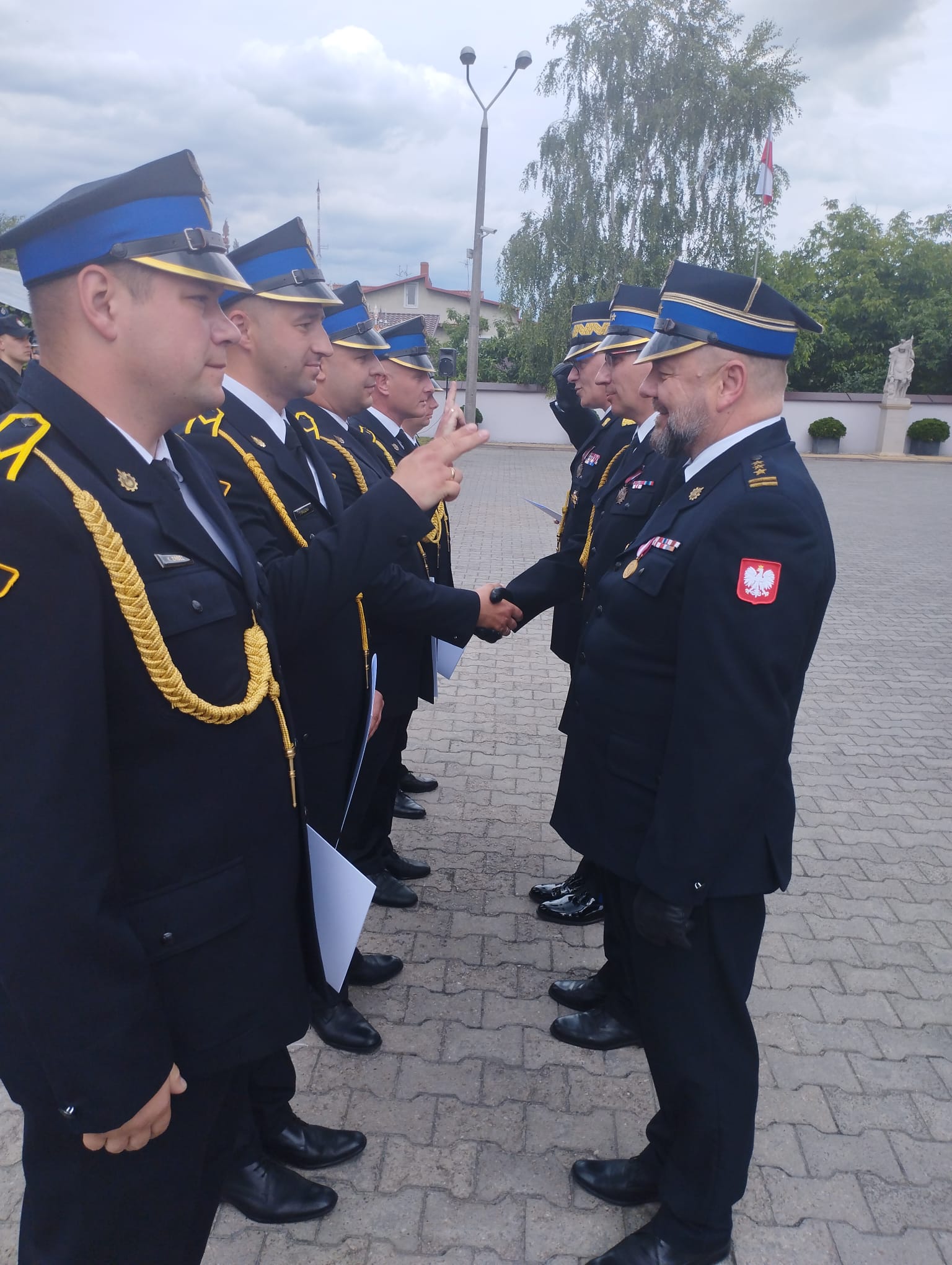 Następnie uczestnicy przemaszerowali na plac przed Komendą Powiatową, gdzie dowódca uroczystości st. kpt. Robert Rycerski złożył meldunek Zastępcy Komendanta Głównego PSP – nadbryg. Pawłowi Frysztakowi. Kolejnym punktem apelu było uroczyste podniesienie flagi Państwowej oraz odegranie hymnu narodowego.