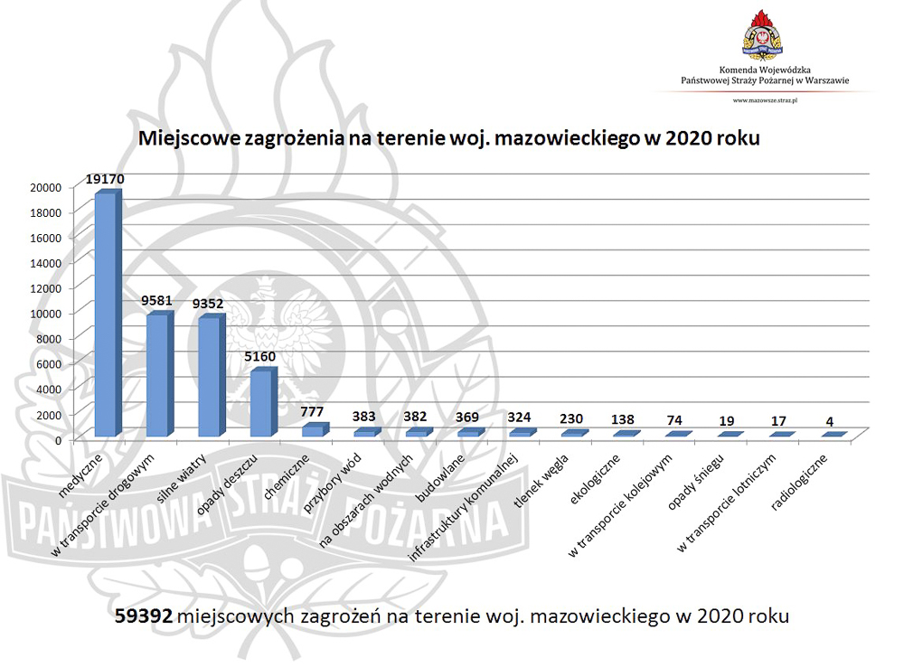 W 2020 roku mazowieccy strażacy uczestniczyli w usuwaniu aż 59392 miejscowych zagrożeń. Największą grupą zdarzeń były działania o charakterze medycznym, w tym walka z pandemią koronawirusa to 14913 interwencji oraz izolowane zdarzenia ratownictwa medycznego to 506 interwencji.