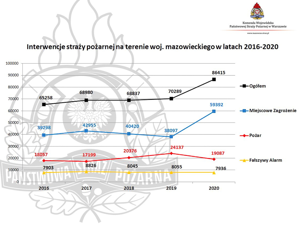 86415 razy interweniowali mazowieccy strażacy w 2020 roku, w tym przy 19087 pożarach, 59392 miejscowych zagrożeniach oraz 7936 fałszywych alarmach. To aż, o 16126 zdarzeń więcej niż w 2019 roku. Na tak dużą liczbę interwencji w minionym roku, miało wpływ zaangażowanie straży pożarnej w walkę z pandemią koronawirusa (14913 zdarzeń). W ostatnich pięciu latach notuje się tendencję wzrostu liczby interwencji straży pożarnych na terenie woj. mazowieckiego.