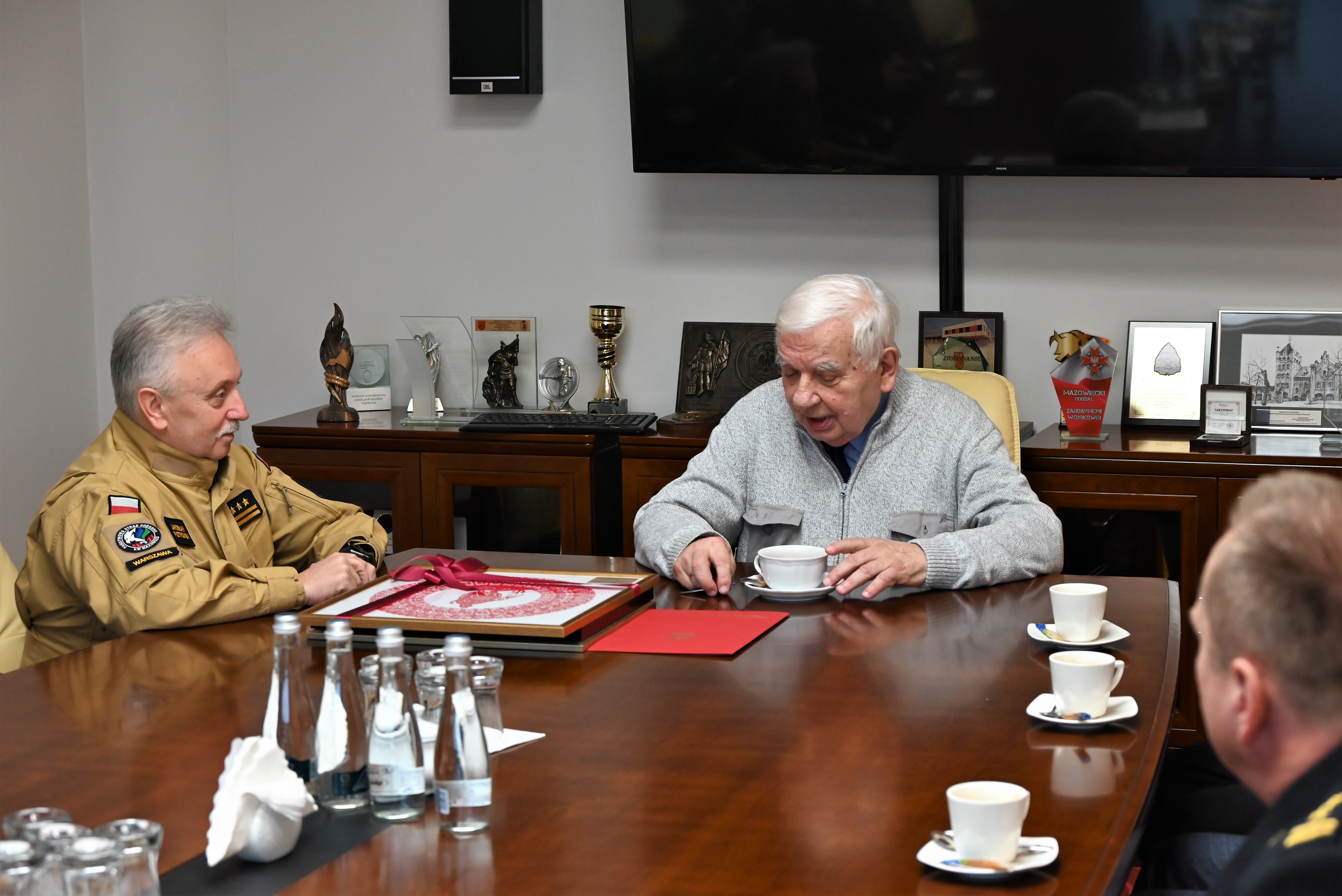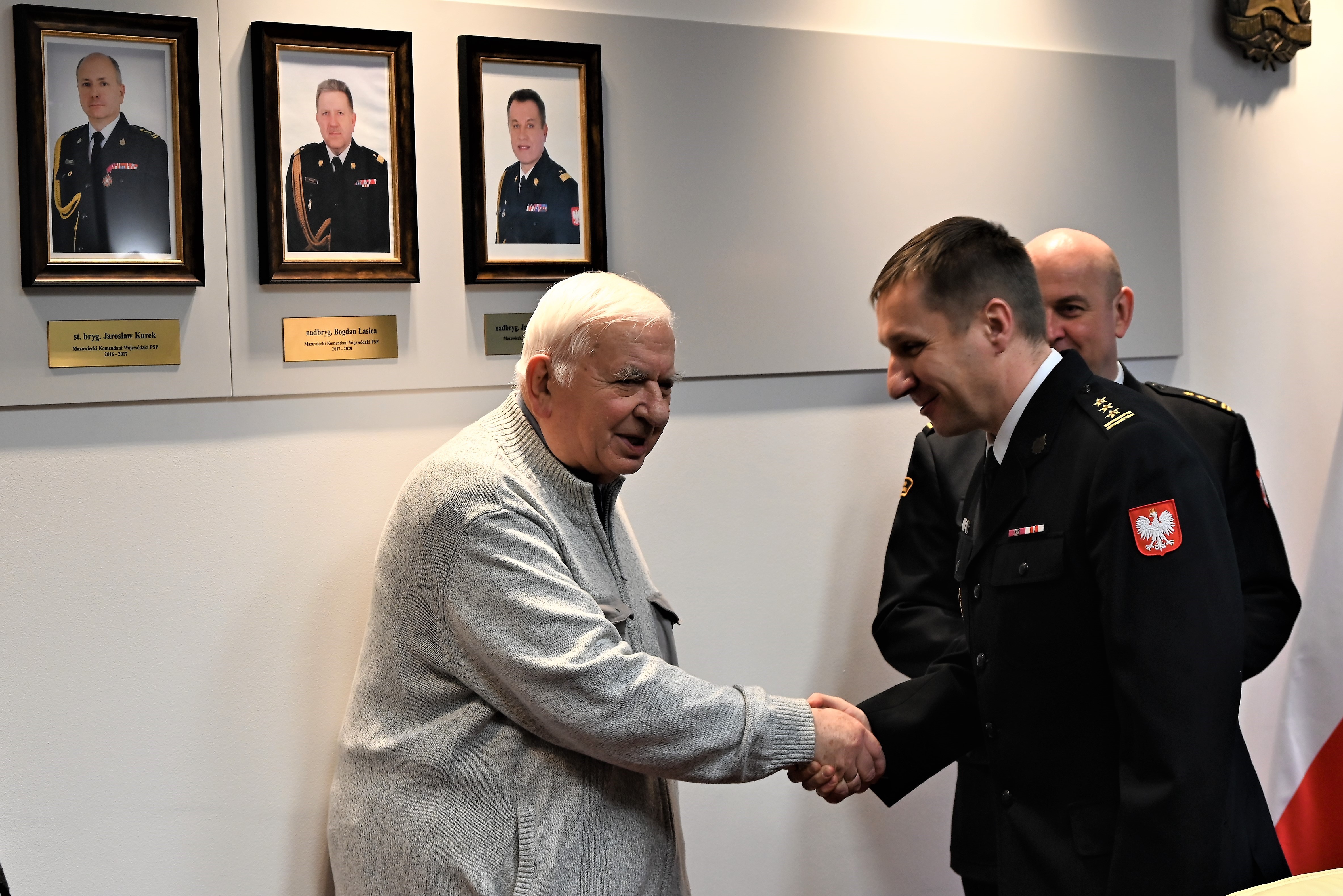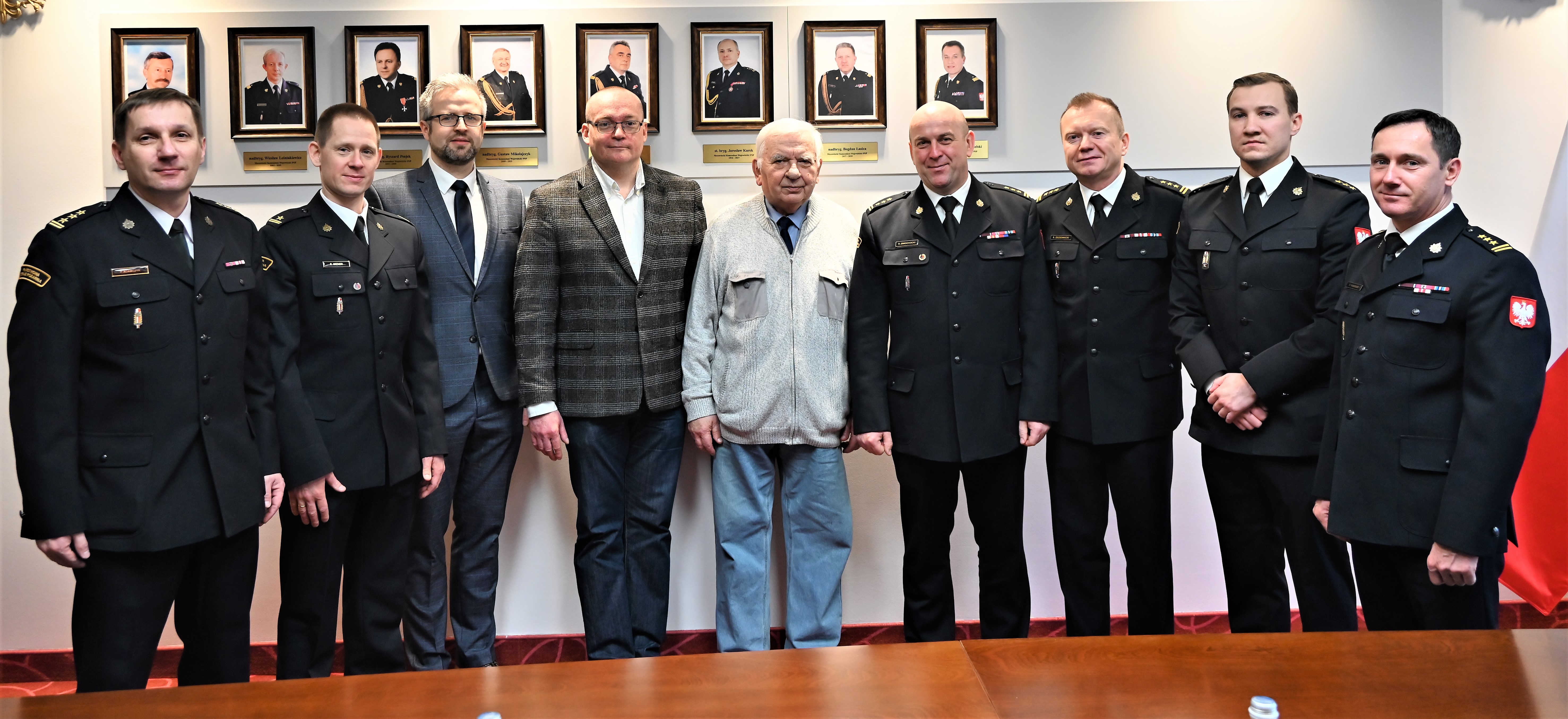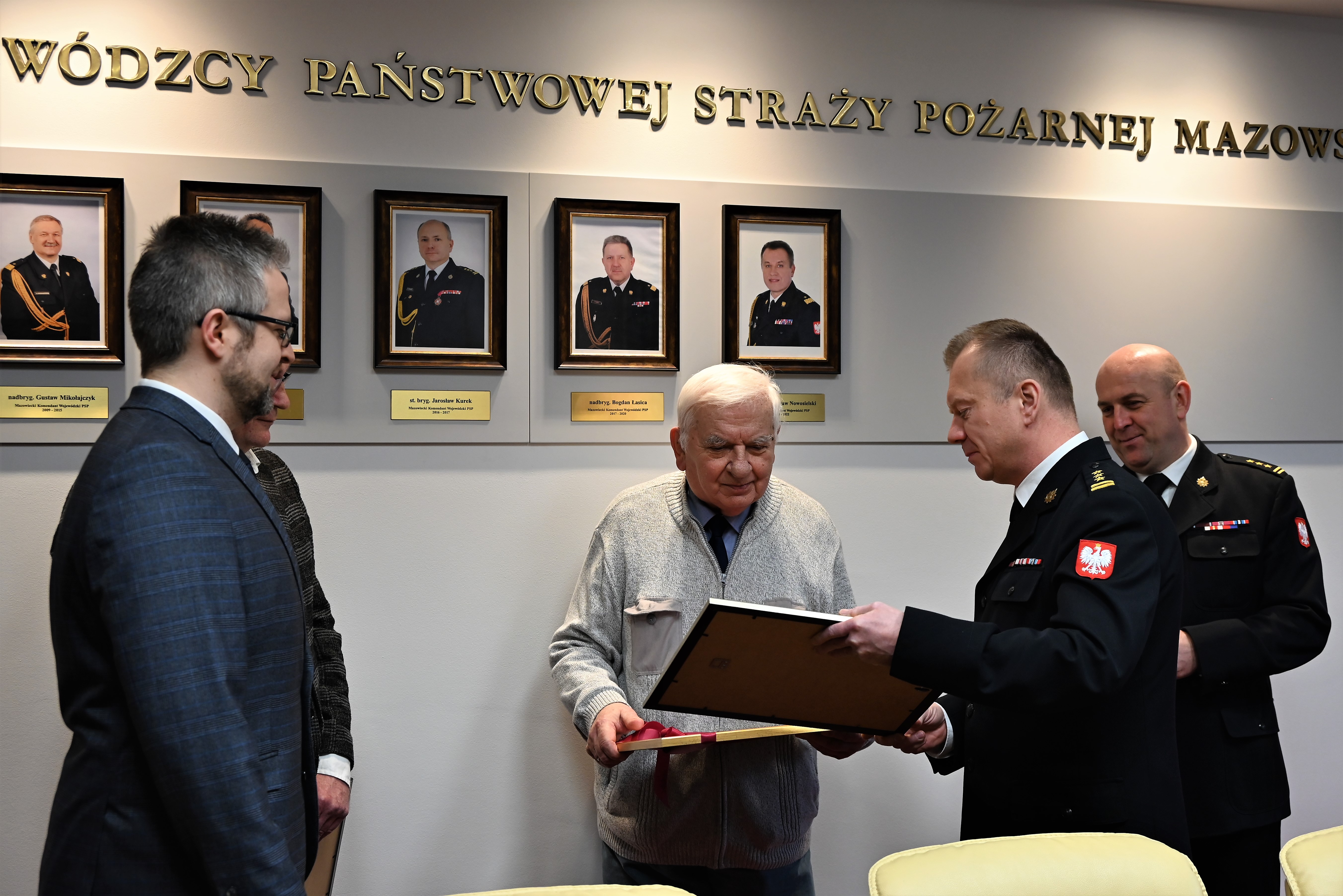 Z tej okazji Mazowiecki Komendant Wojewódzki st. bryg. Jarosław Piotrowski wraz z Zastępcą Mazowieckiego Komendanta Wojewódzkiego PSP st. bryg. Rafałem Zimochockim oraz funkcjonariuszami KW PSP w Warszawie i Komendy Głównej PSP spotkali się z Jubilatem i złożyli serdeczne życzenia dobrego zdrowia i pomyślności.