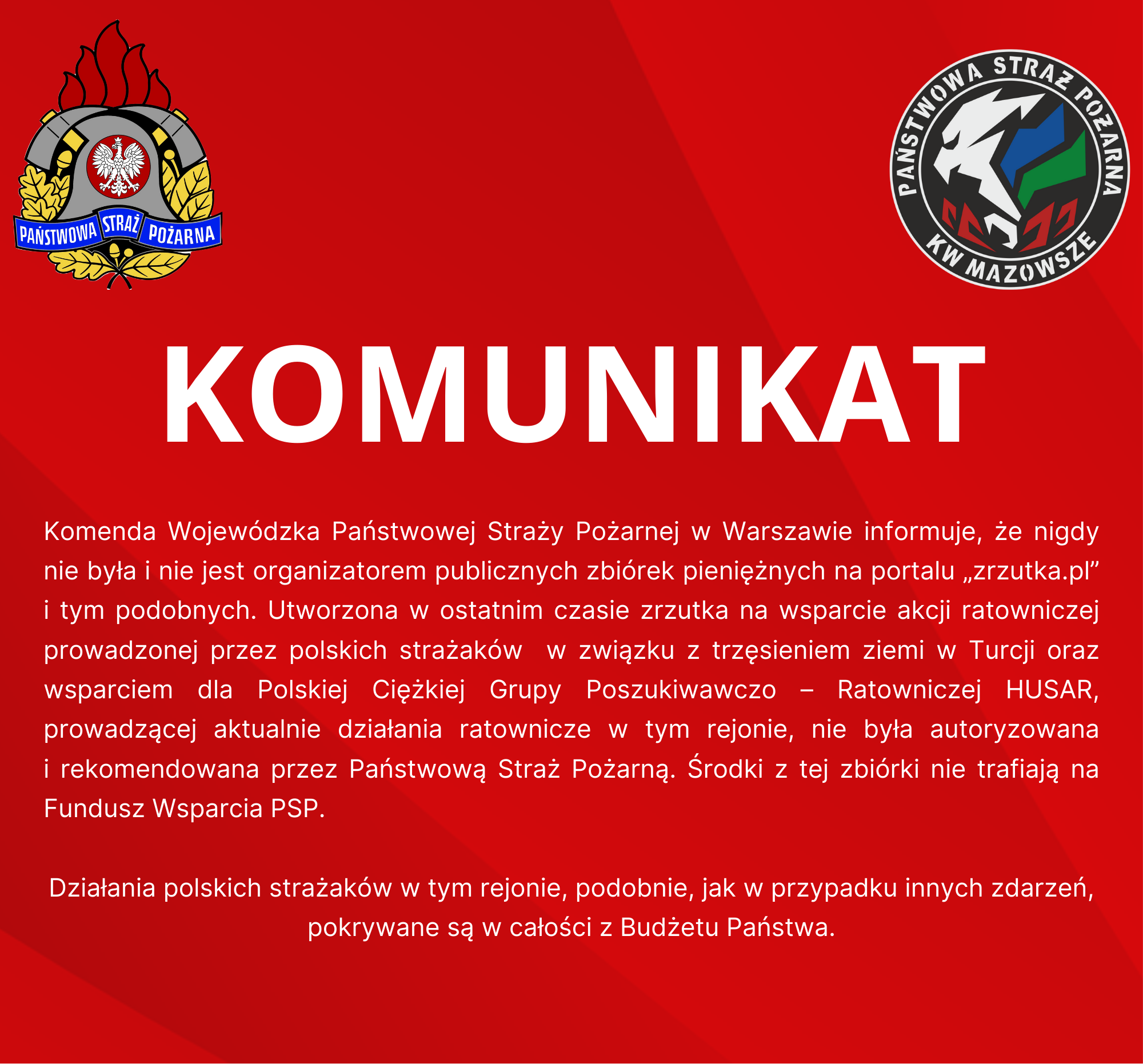 Komenda Wojewódzka Państwowej Straży Pożarnej w Warszawie informuje, że nigdy nie była i nie jest organizatorem publicznych zbiórek pieniężnych na portalu „zrzutka.pl” i tym podobnych. Utworzona