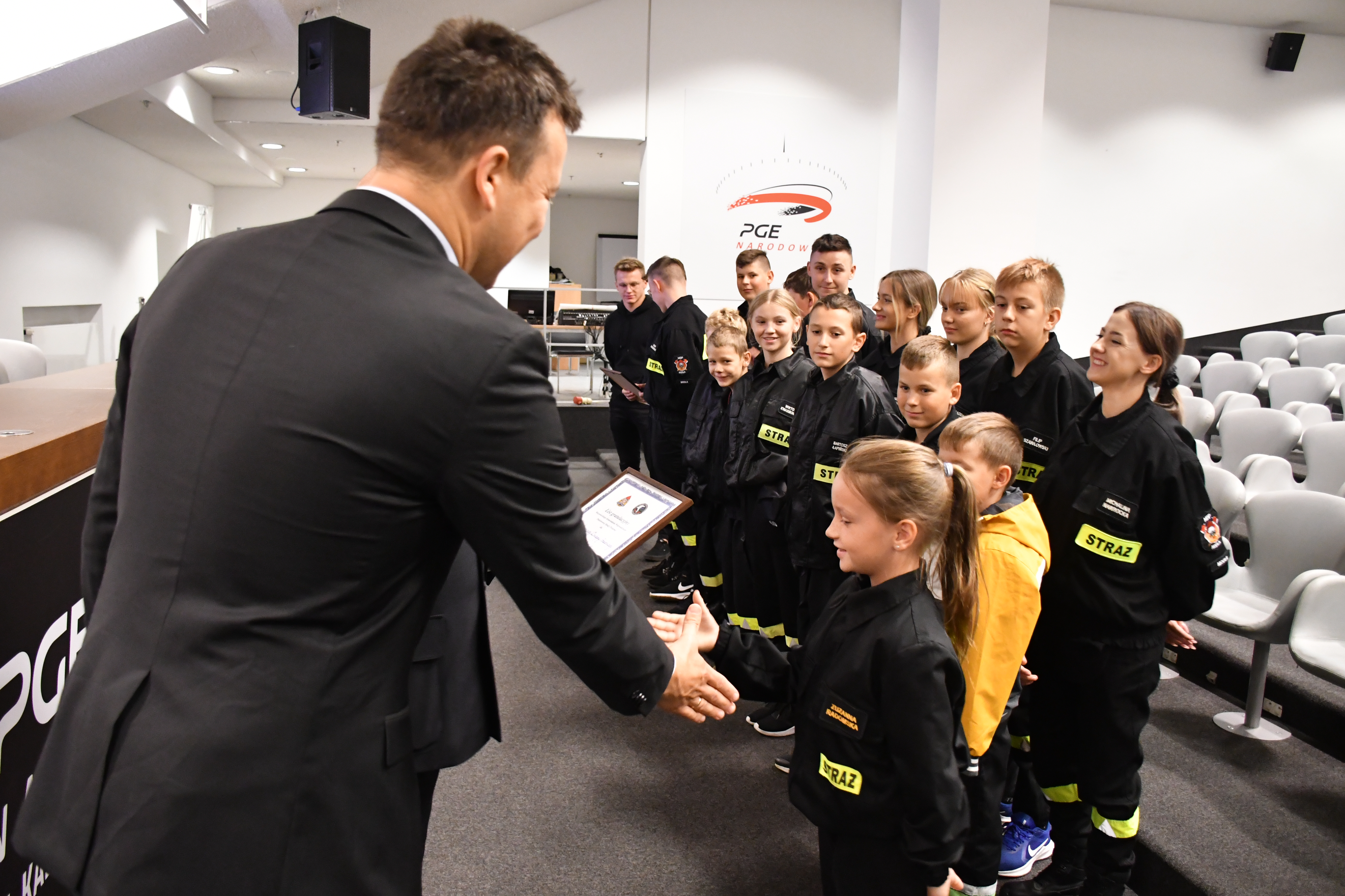w Modle, jako pierwsi w województwie, otrzymali ww. wyróżnienie. Odznakę, w imieniu Mazowieckiego Komendanta Wojewódzkiego PSP, wręczył st. bryg. Tomasz Cybul – Zastępca Mazowieckiego Komendanta Wojewódzkiego PSP w obecności gospodarza obiektu Pana Włodzimierza Doli – Prezesa Zarządu PGE Narodowy.