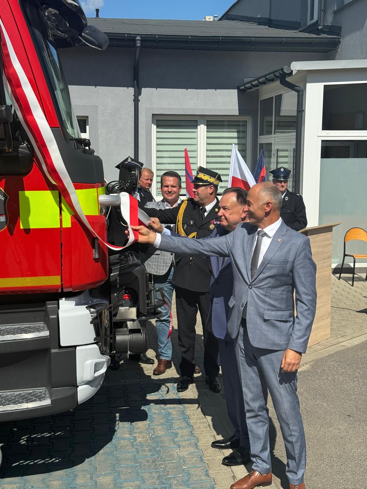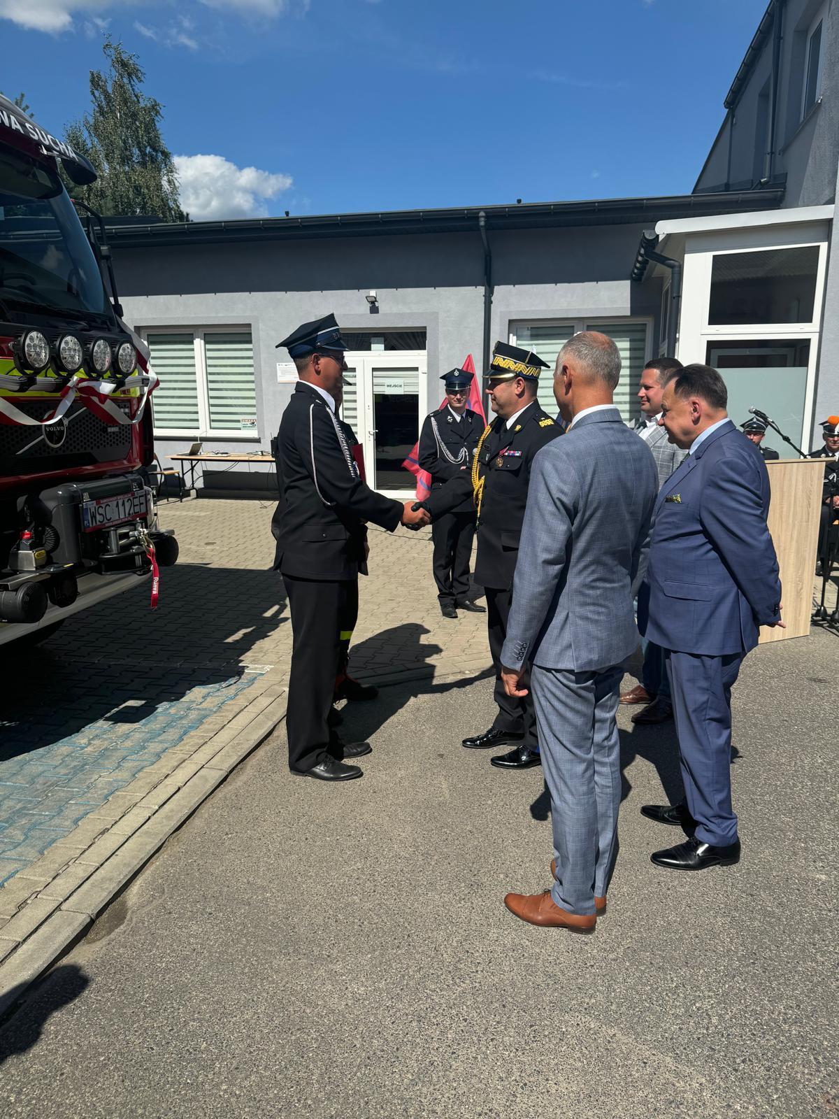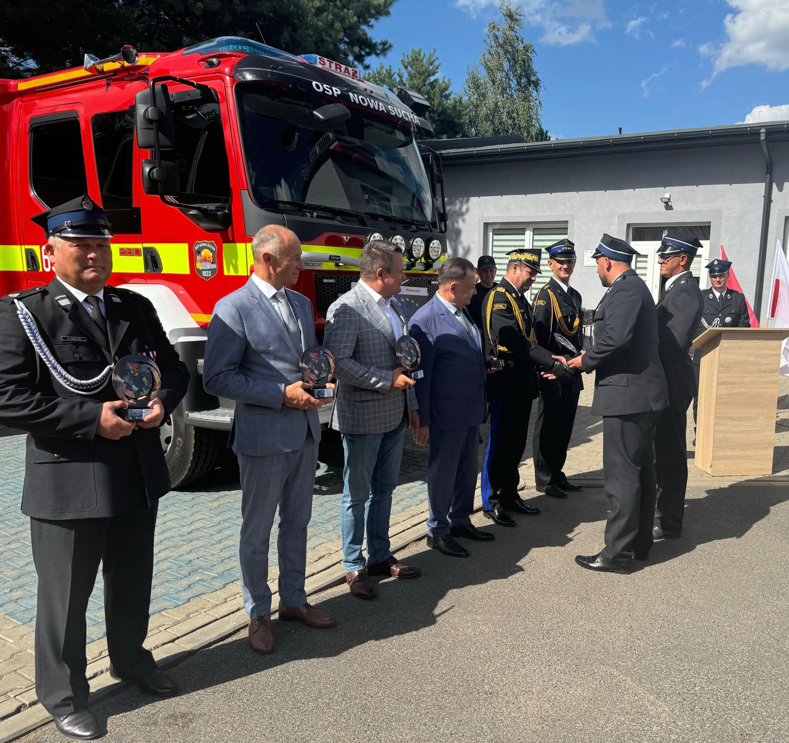 Uroczystego wręczenia aktu przekazania samochodu pożarniczego dokonali: Pan Mirosław Adam Orliński – Poseł na Sejm RP, Pan Adam Struzik – Marszałek Województwa Mazowieckiego, nadbryg. Artur Gonera – Mazowiecki Komendant Wojewódzki PSP, Pan Maciej Mońka - Wójt Gminy Nowa Sucha.