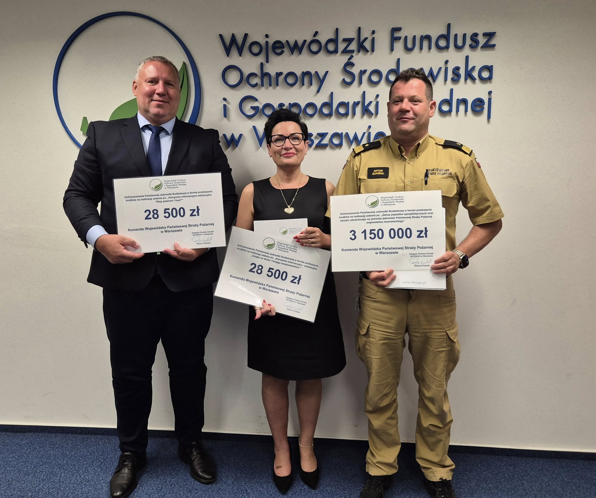 13 sierpnia 2025 r. w siedzibie Wojewódzkiego Funduszu Ochrony Środowiska i Gospodarki Wodnej w Warszawie, Mazowiecki Komendant Wojewódzki PSP – nadbryg. Artur Gonera oraz Główna Księgowa Komendy Wojewódzkiej PSP w Warszawie – st. ogn. Beata Polak, wspólnie z Wiceprezesem Zarządu WFOŚiGW w Warszawie – Panem Ryszardem Dziadakiem podpisali trzy umowy dotyczące działań edukacyjnych i inwestycyjnych.
