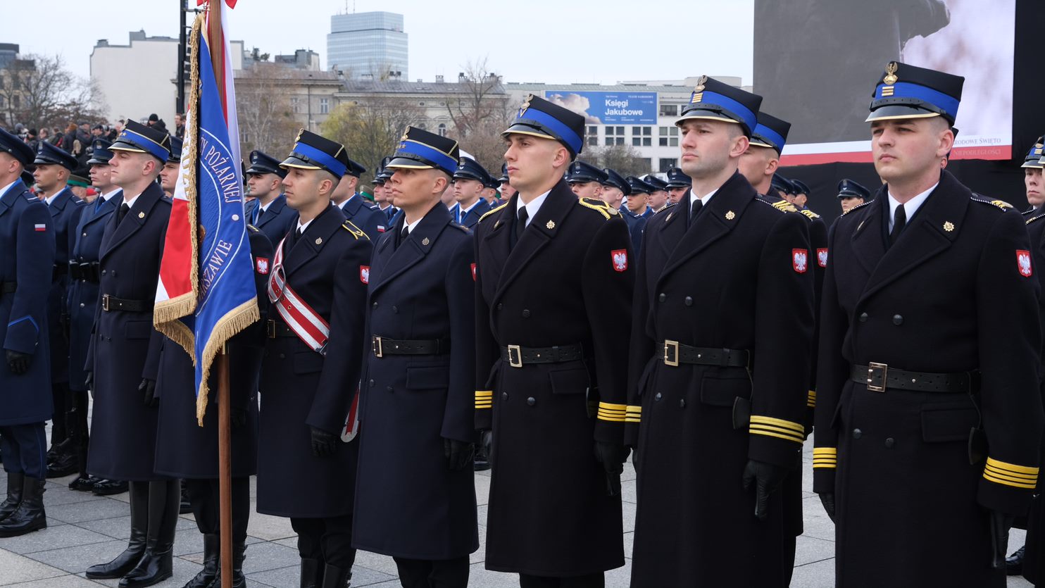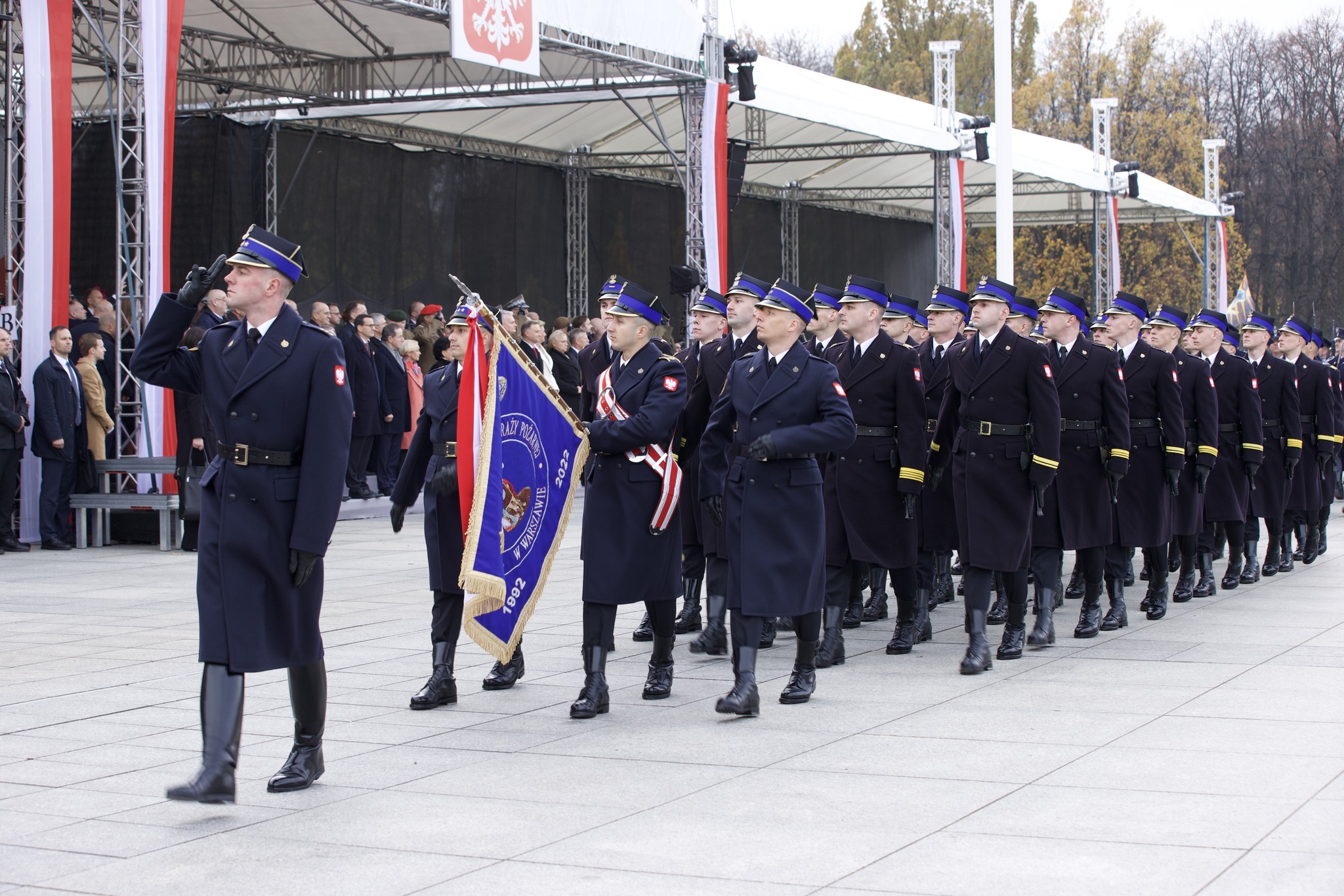 W uroczystości na Placu Marszałka Józefa Piłsudskiego uczestniczył Komendant Główny Państwowej Straży Pożarnej gen. brygadier Andrzej Bartkowiak, Zastępca Komendanta Głównego Państwowej Straży Pożarnej nadbryg. Adam Konieczny, p.o. Mazowiecki Komendant Wojewódzki Państwowej Straży Pożarnej