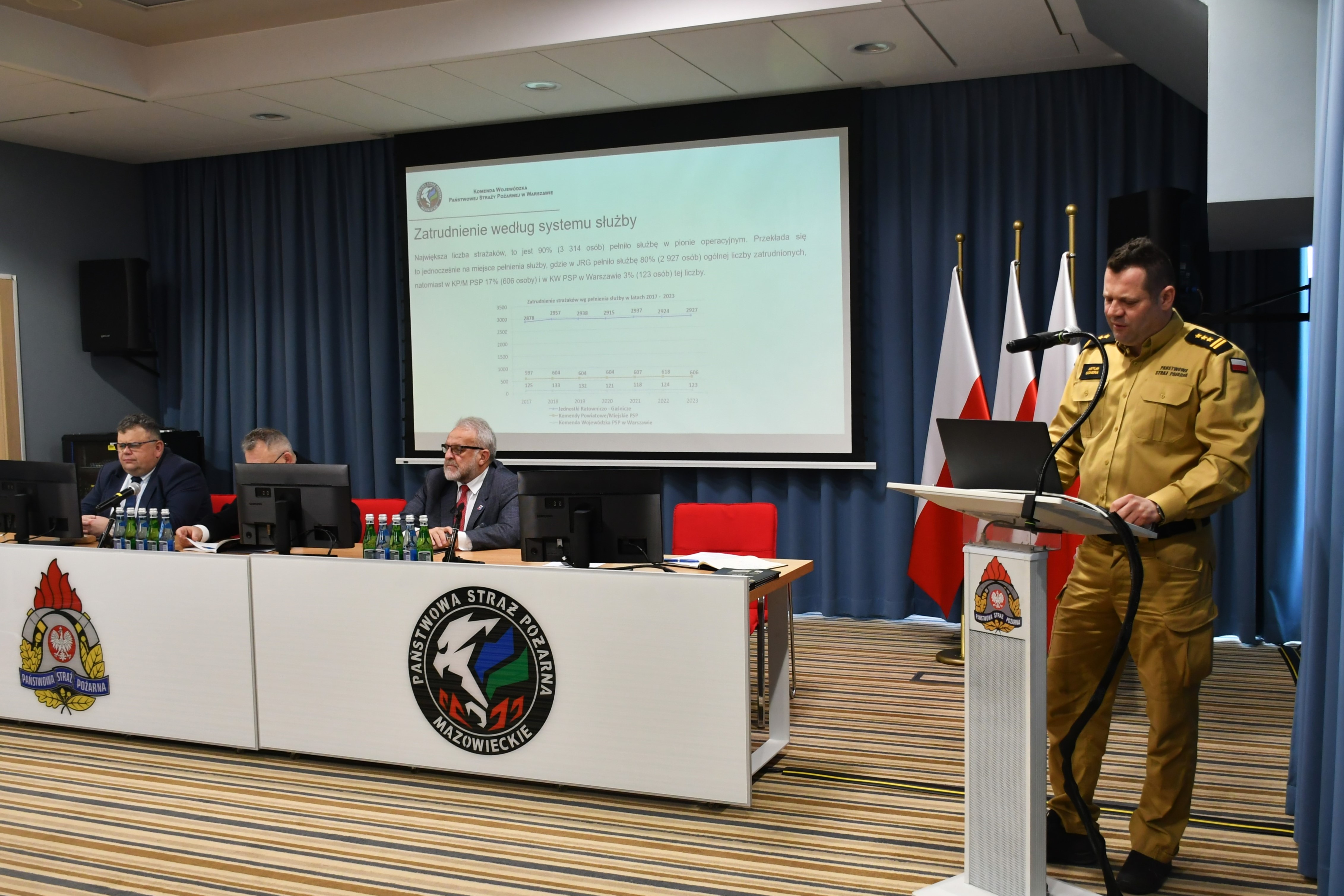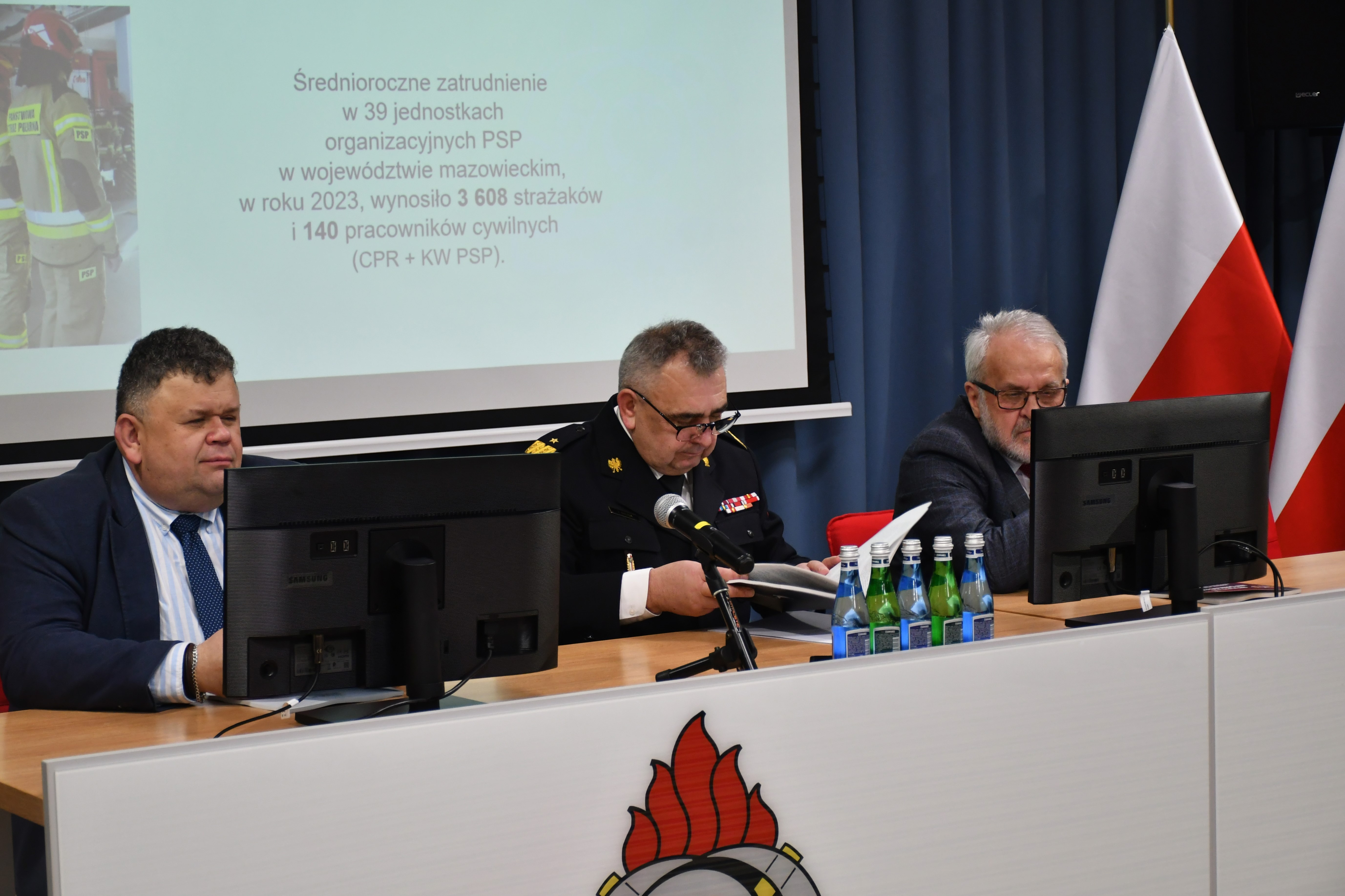 MKW PSP omówił strukturę organizacyjną mazowieckiej straży pożarnej, statystykę prowadzonych w 2023 roku akcji ratowniczych, realizację szkoleń i ćwiczeń, współpracę z innymi służbami i instytucjami, działalność nadzorczą i kontrolną oraz realizowane czynności kontrolno-rozpoznawcze. Zaprezentował także podsumowanie działalności logistycznej i technicznej, przedstawiając ilości zrealizowanych przetargów, zakupów oraz prowadzonych inwestycji. Z zakresu informatyki i łączności poinformował m.in. o przeprowadzonej w 2023 roku pełnej inwentaryzacji zasobów teleinformatycznych i radiokomunikacyjnych, a z zakresu finansowego – omówił zeszłoroczny budżet KW PSP w Warszawie i analizę budżetu komend powiatowych i miejskich PSP. Zaprezentował także działalność nowopowstałego (w 2023 roku) Wydziału Alarmowania i Współpracy z OSP.