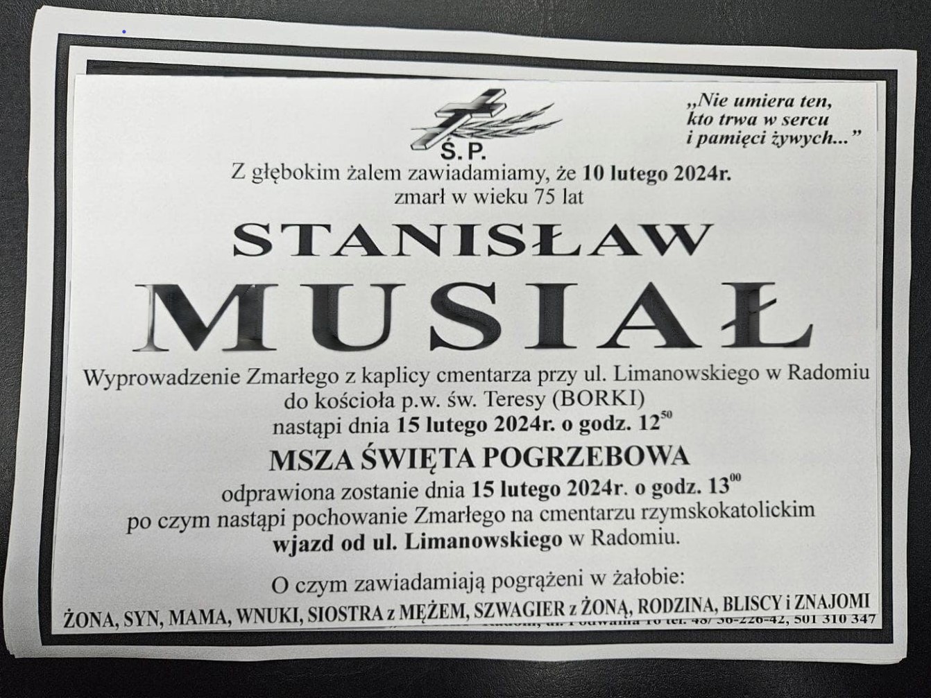 Msza Święta Pogrzebowa zostanie odprawiona w dniu 15 lutego 2024 r. o godzinie 13:00 w kościele p.w. św. Teresy (BORKI), po czym nastąpi pochowanie Zmarłego na cmentarzu rzymskokatolickim przy ul. Limanowskiego w Radomiu.