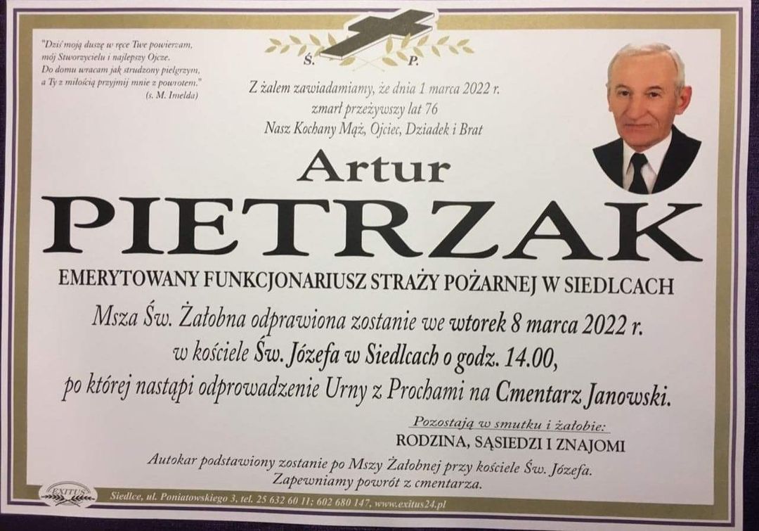 Z głębokim żalem zawiadamiamy, że 1 marca 2022 roku zmarł st. bryg. w st. spocz. Artur Pietrzak, były Komendant Wojewódzki PSP w Siedlcach.