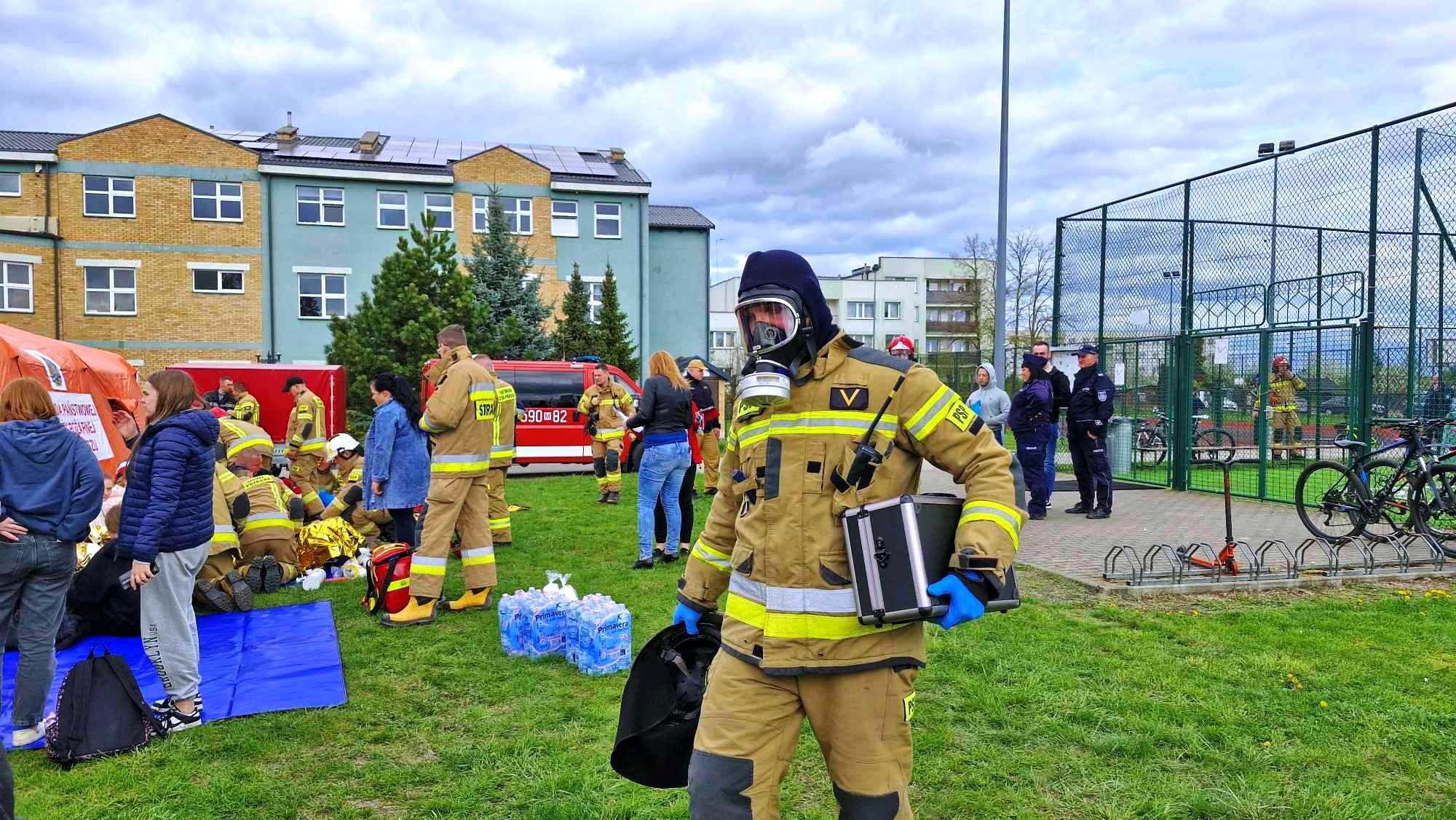 Strażacy zabezpieczeni w sprzęt ochrony układu oddechowego zostali wprowadzeni do budynku szkoły, w celu sprawdzenia czy wszyscy zostali ewakuowani oraz weryfikacji miernikami wielogazowymi czy nie występują stężenia niebezpiecznych substancji.