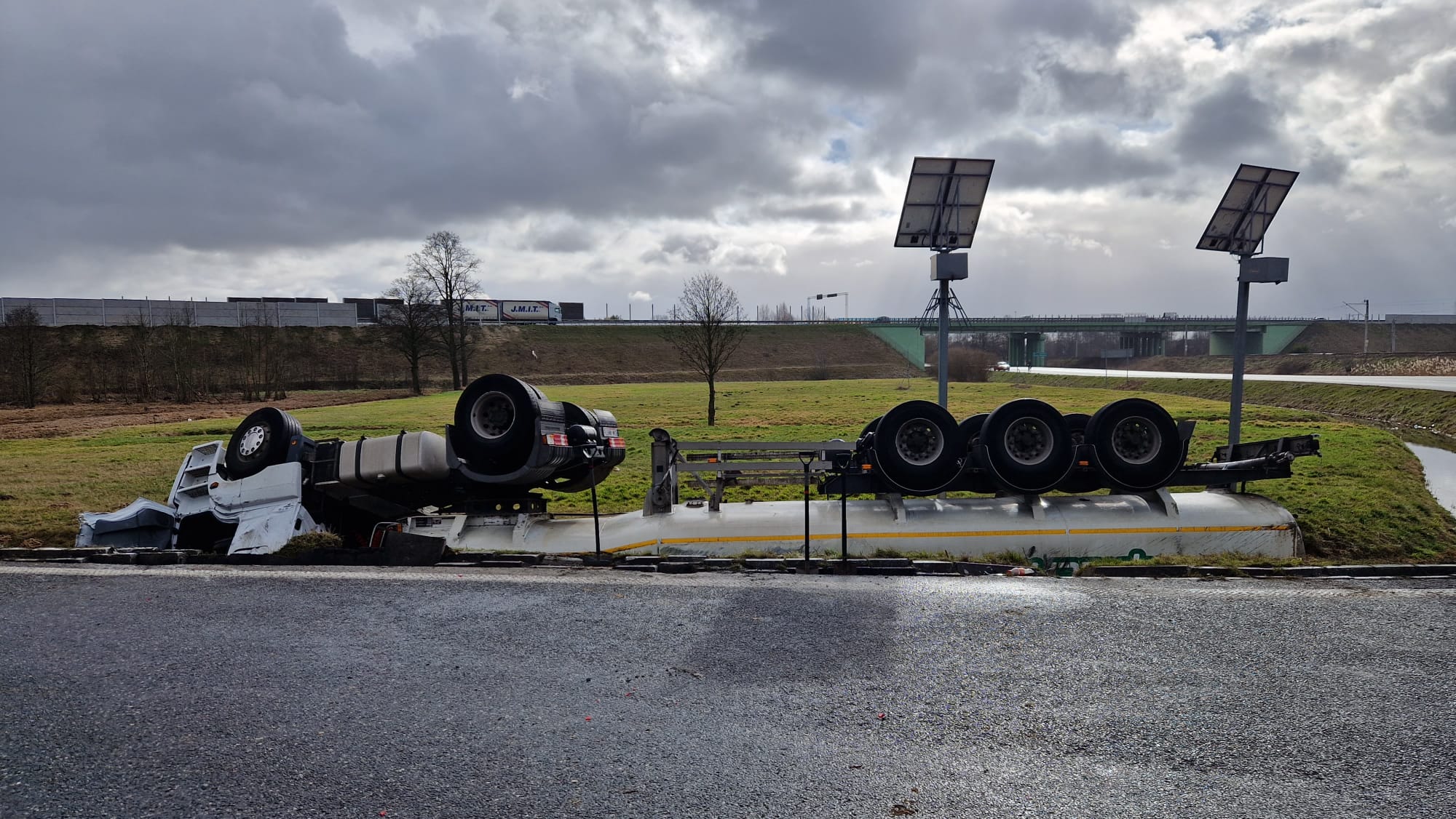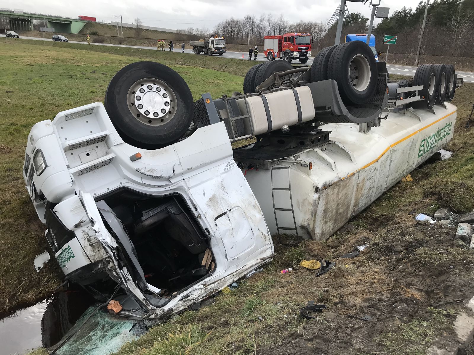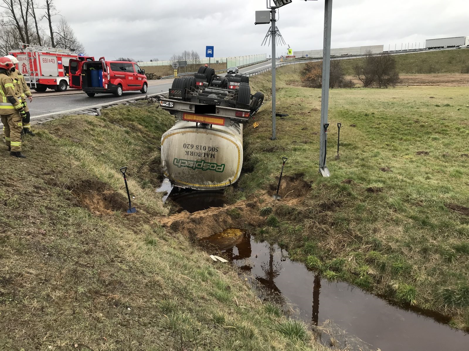 Po przybyciu na miejsce zdarzenia i przeprowadzeniu rozpoznania ustalono, że w rowie kołami do góry leży cysterna. Kierowca ciężarówki opuścił pojazd o własnych siłach. Ze zbiornika cysterny wyciekała ciecz, która według dokumentów transportowych, była bio-dodatkiem do oleju napędowego.