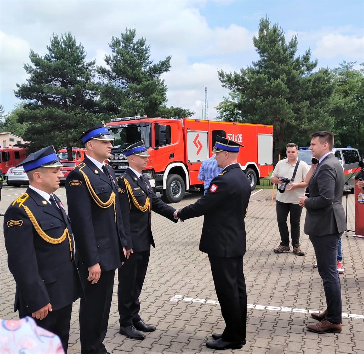 Po zakończeniu ceremonii odznaczeń i awansów, funkcjonariuszom Komendy Powiatowej PSP w Nowym Dworze Mazowieckim wręczone zostały akty przekazania oraz kluczyki do ciężkiego samochodu ratowniczo gaśniczego GCBA 11/60 oraz Mikrobusa SLBUS, dokonując tym samym uroczystego przekazania samochodu dla Komendy Powiatowej Państwowej Straży Pożarnej w Nowym Dworze Mazowieckim.