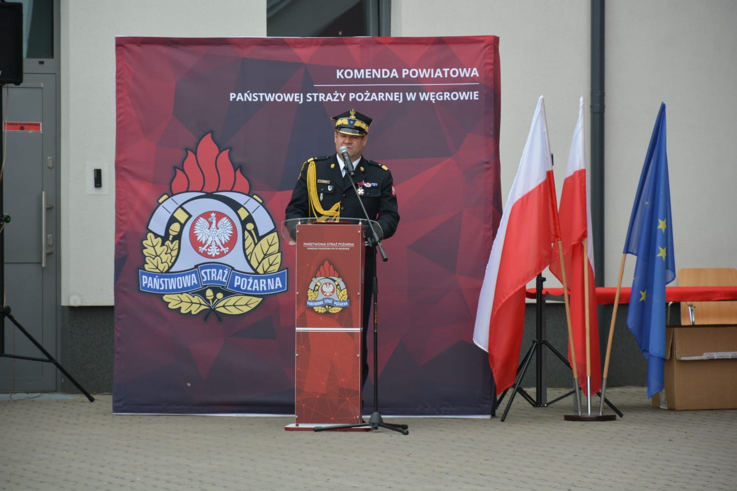 Po podniesieniu flagi państwowej i odegraniu hymnu państwowego, Komendant Powiatowy Państwowej Straży Pożarnej w Węgrowie mł. bryg. Mateusz Bieniak przywitał przybyłych gości oraz złożył życzenia z okazji Dnia Strażaka i podziękował funkcjonariuszom, pracownikom cywilnym oraz druhom Ochotniczych Straży Pożarnych za dotychczasową służbę i pracę na rzecz ochrony przeciwpożarowej. Słowa podziękowań zostały też skierowane w stronę samorządów za ogromne wsparcie naszej formacji.