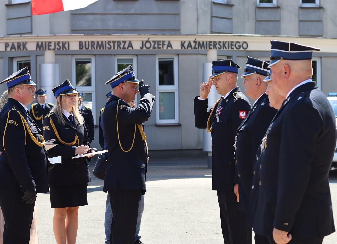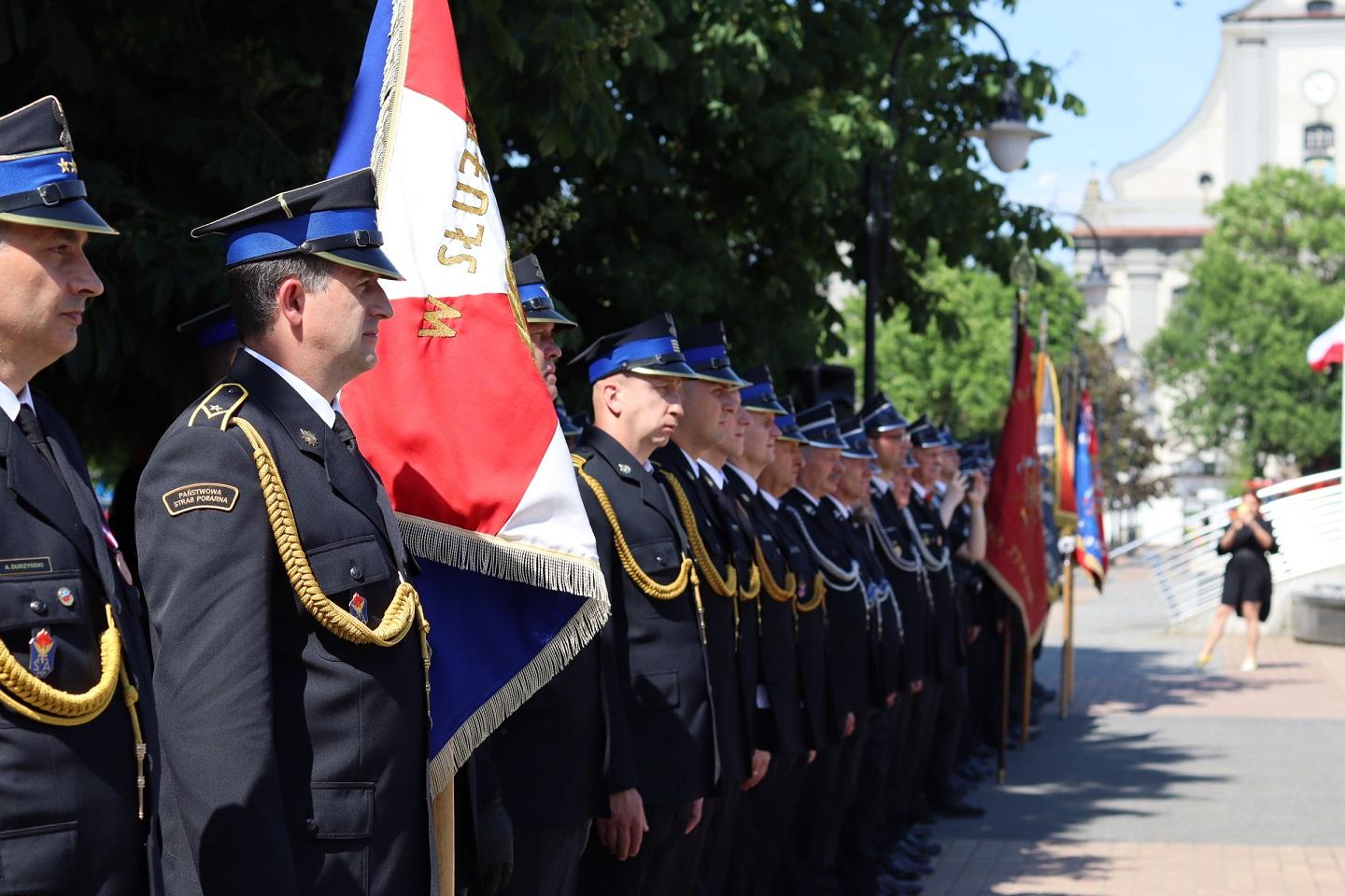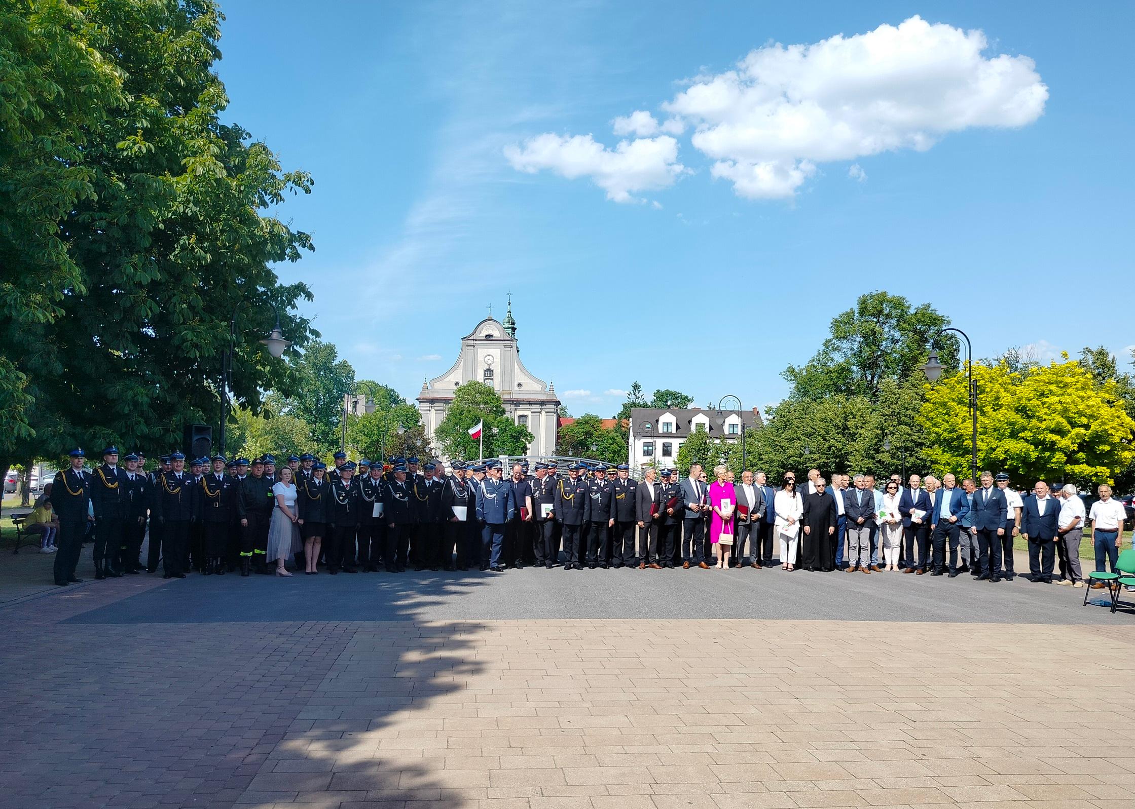 Przed rozpoczęciem uroczystej Mszy św. przedstawiciele samorządu i służb mundurowych złożyli wiązankę kwiatów pod pomnikiem Ofiar II Wojny Światowej. Po nabożeństwie pododdziały, poczty sztandarowe i zaproszeni goście przemaszerowali do pobliskiego parku miejskiego im. Burmistrza Józefa Kaźmierskiego na dalszą część obchodów. Uroczystość rozpoczęła się złożeniem meldunku Zastępcy Mazowieckiego Komendanta Wojewódzkiego PSP st. bryg. Maciejowi Bieńczykowi, który dokonał przeglądu i powitania pododdziałów. Następnie podniesiono flagę państwową wraz z odegraniem hymnu państwowego.