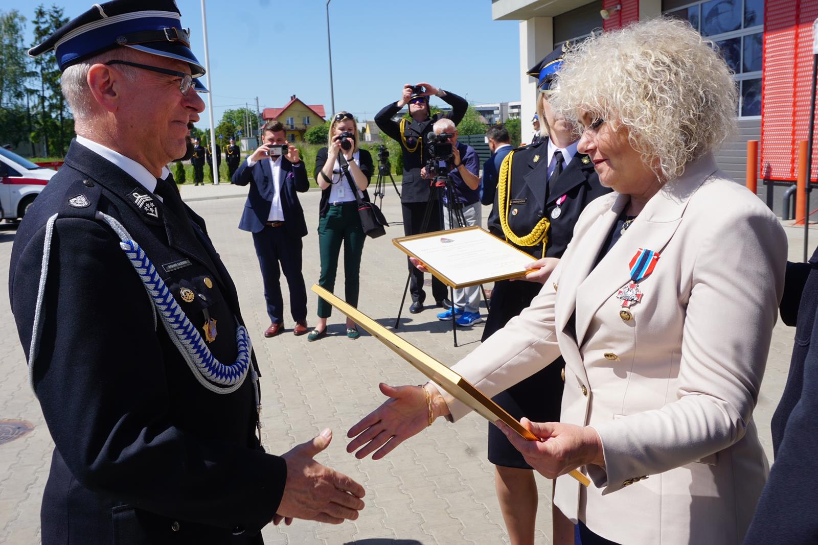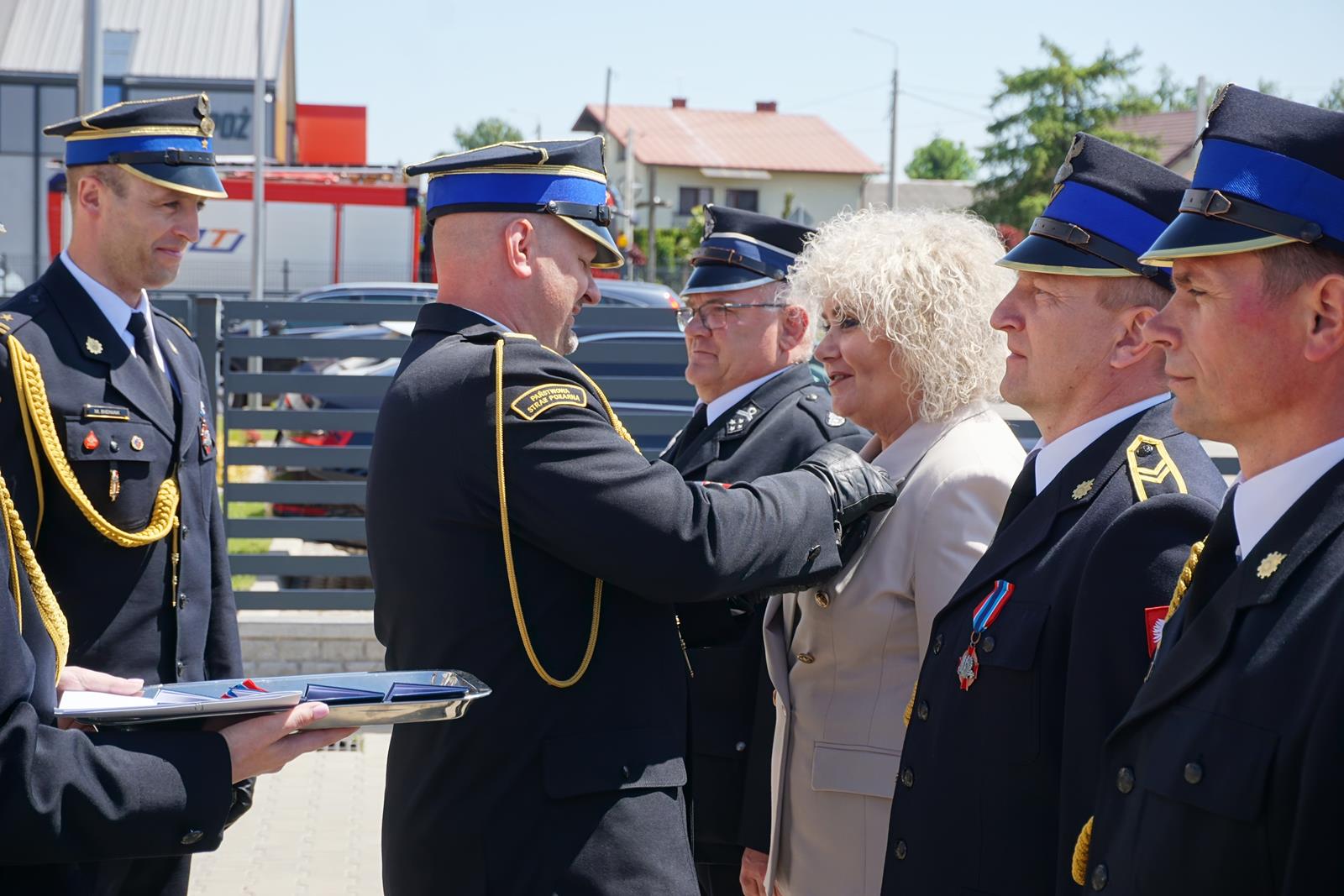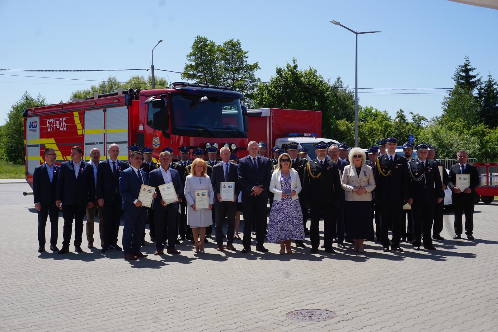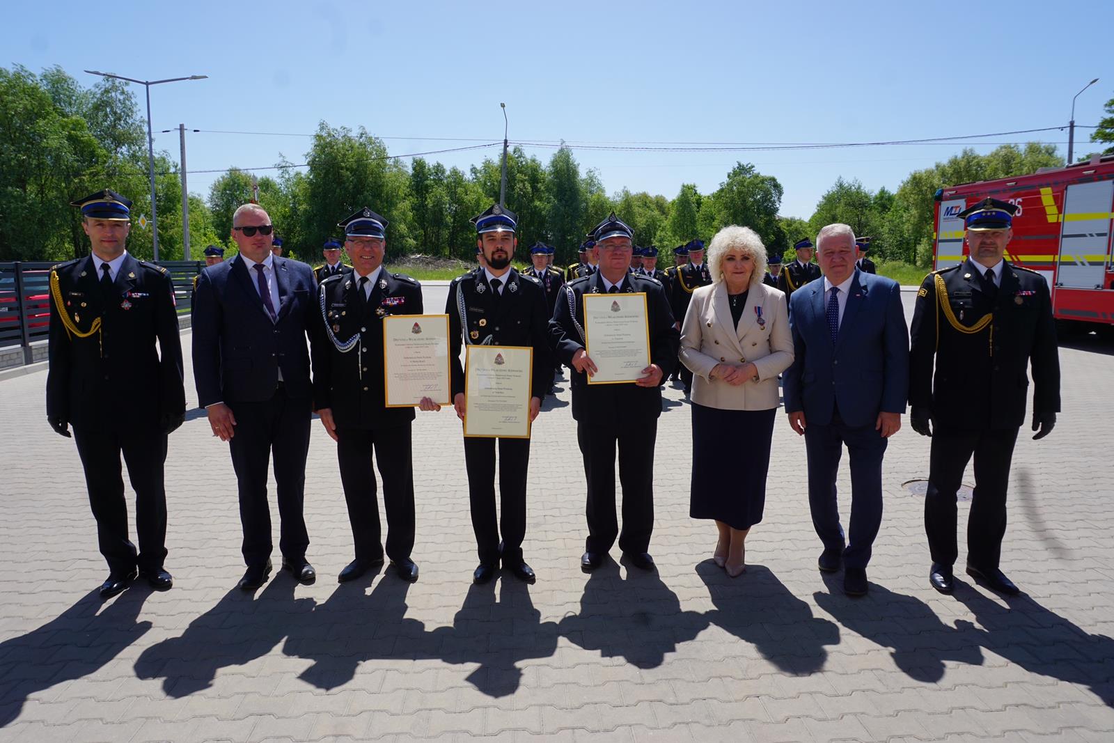 - Brązową Odznaką Zasłużony dla Ochrony Przeciwpożarowej odznaczona została Pani Maria Koc - Senator Rzeczypospolitej Polskiej oraz 3 strażaków,