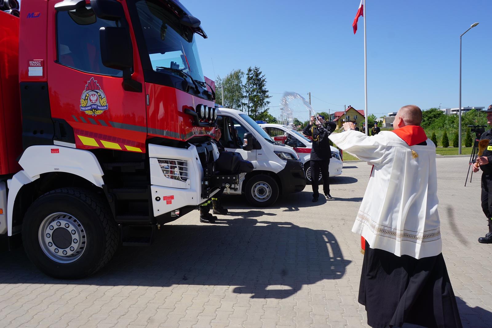 Kolejnym punktem uroczystości było przekazanie trzech nowych pojazdów pożarniczych dla Jednostki Ratowniczo-Gaśniczej PSP w Węgrowie, które poświęcił kapelan powiatowy ks. Andrzej Falkowski