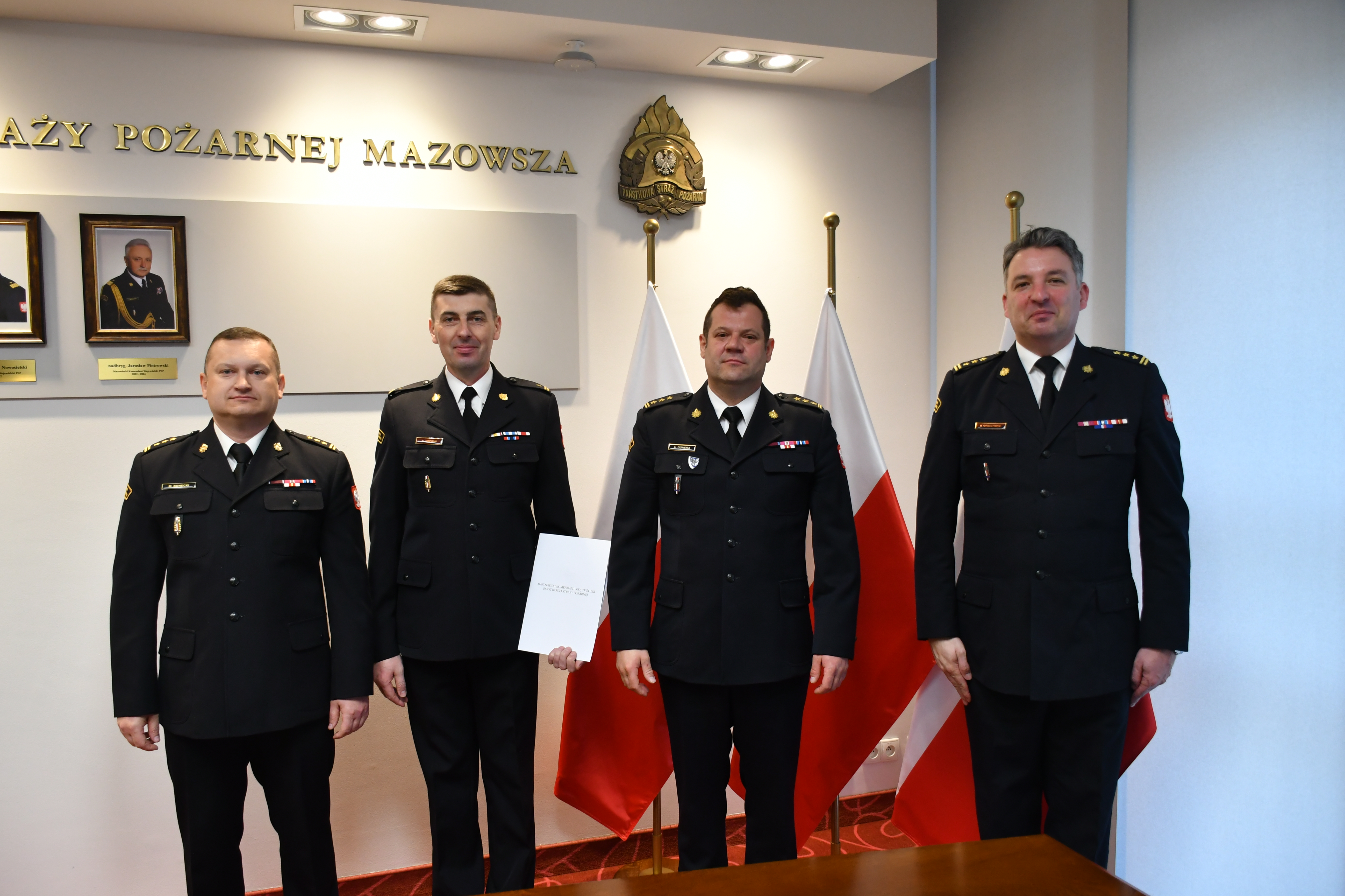 Uroczyste wręczenie decyzji personalnej odbyło się w siedzibie Komendy Wojewódzkiej PSP w Warszawie w obecności st. bryg. Roberta Nowakowskiego - Komendanta Powiatowego PSP w Powiecie Warszawskim Zachodnim oraz st. bryg. Marcina Koneckiego - Naczelnika Wydziału Kadr KW PSP w Warszawie.