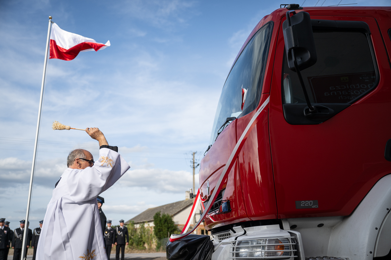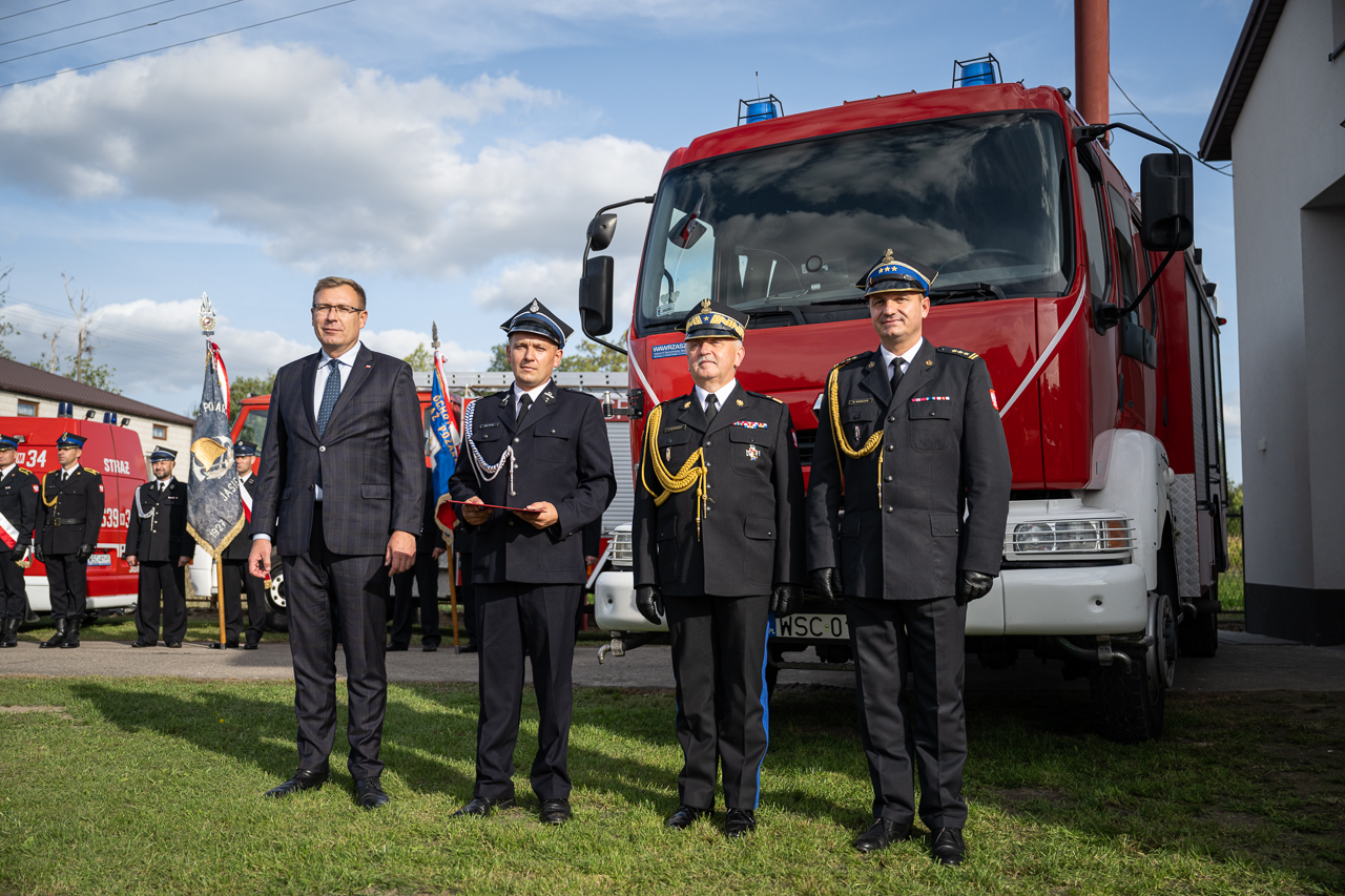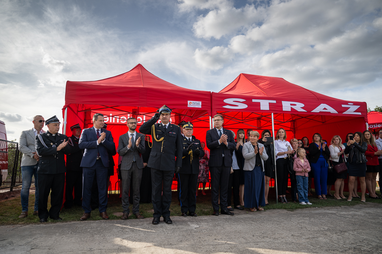Uroczystego wręczenia aktu przekazania pojazdu i kluczyków dokonali: Pan Maciej Małecki - Sekretarz Stanu w Ministerstwie Aktywów Państwowych, nadbryg. Jarosław Piotrowski - Mazowiecki Komendant Wojewódzki PSP oraz st. bryg. Maciej Bieńczyk – Komendant Powiatowy PSP w Sochaczewie.