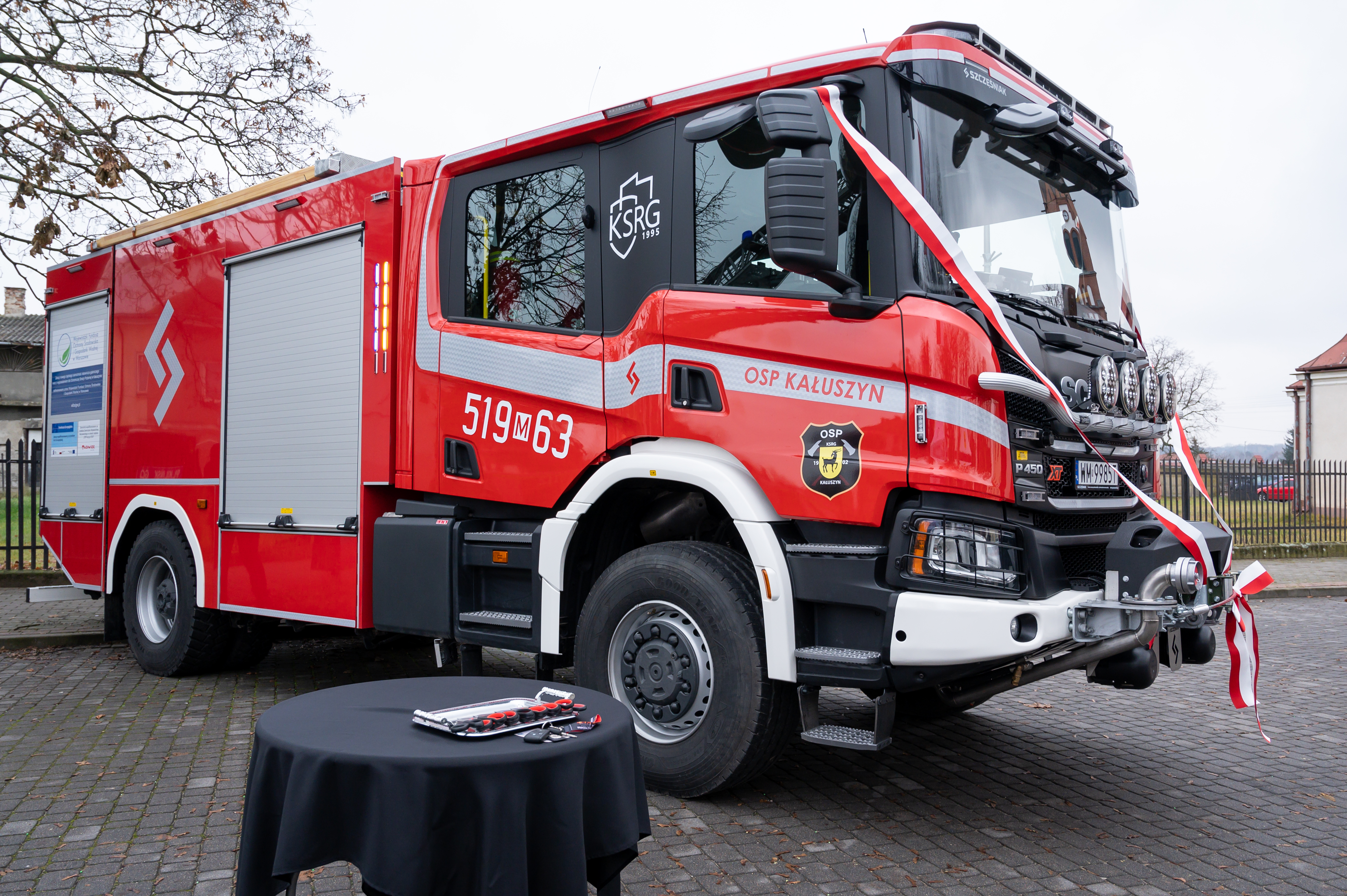 Do OSP w Kałuszynie trafił fabrycznie nowy, ciężki samochód ratowniczo-gaśniczy ze zbiornikiem wodnym o pojemności 7 m3 i autopompą o wydajności 40 hl/min. Zabudowę pojazdu na podwoziu marki Scania wykonała firma Szczęśniak.