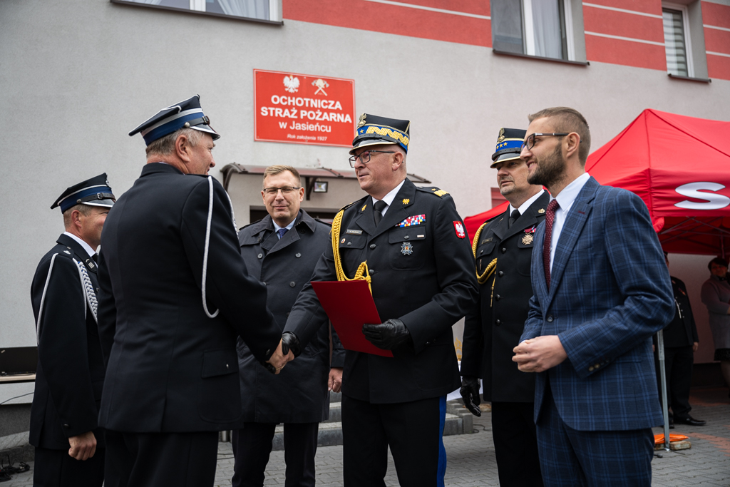 Uroczystego wręczenia aktu przekazania samochodu pożarniczego na ręce Prezesa OSP w Jasieńcu, dokonali: Pan Maciej Małecki - Sekretarz Stanu w Ministerstwie Aktywów Państwowych, nadbryg. Krzysztof Hejduk - Zastępca Komendanta Głównego PSP, st. bryg. Tomasz Cybul - Zastępca Mazowieckiego Komendanta Wojewódzkiego PSP oraz Wójt Gminy Rybno Pan Damian Jaworski.