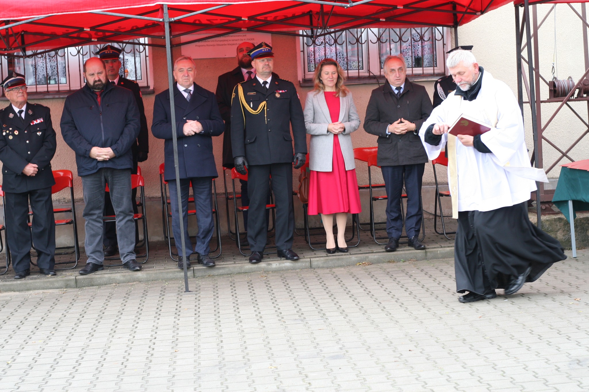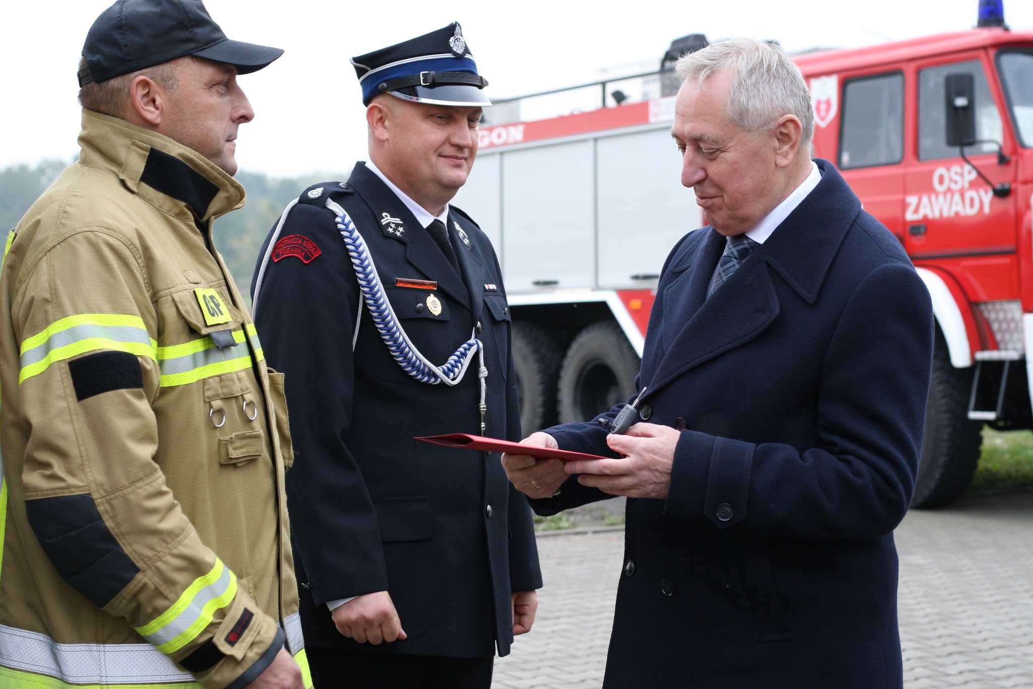 W dalszej kolejności uroczyście wręczono kluczyki i akt przekazania nowego samochodu ratowniczo-gaśniczego GBA Volvo Fl280 4x4 na ręce druha Prezesa OSP w Zawadach. Następnie proboszcz parafii św. Doroty w Zawadach ks. Bogusław Pomarański dokonał poświęcenia nowego nabytku.