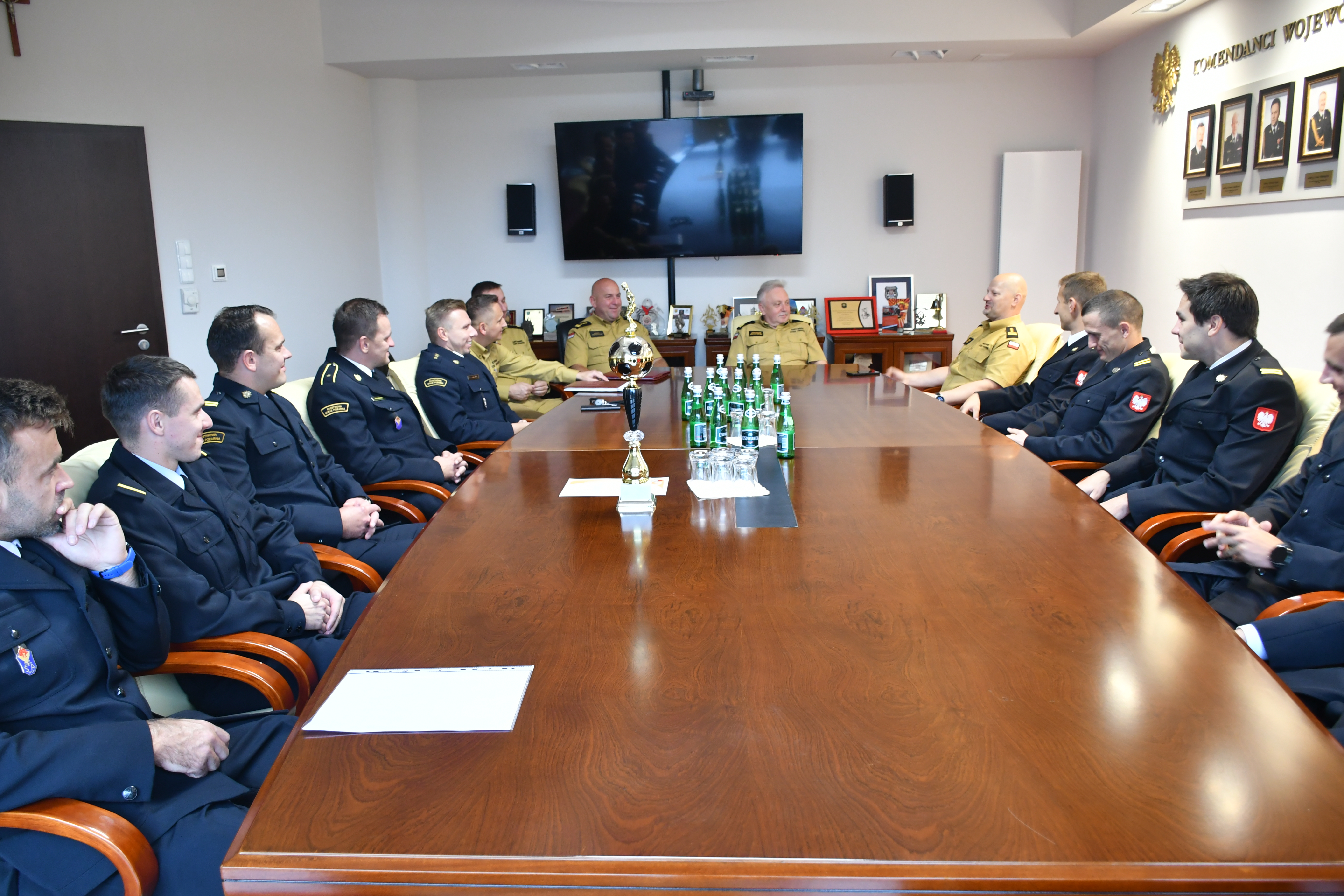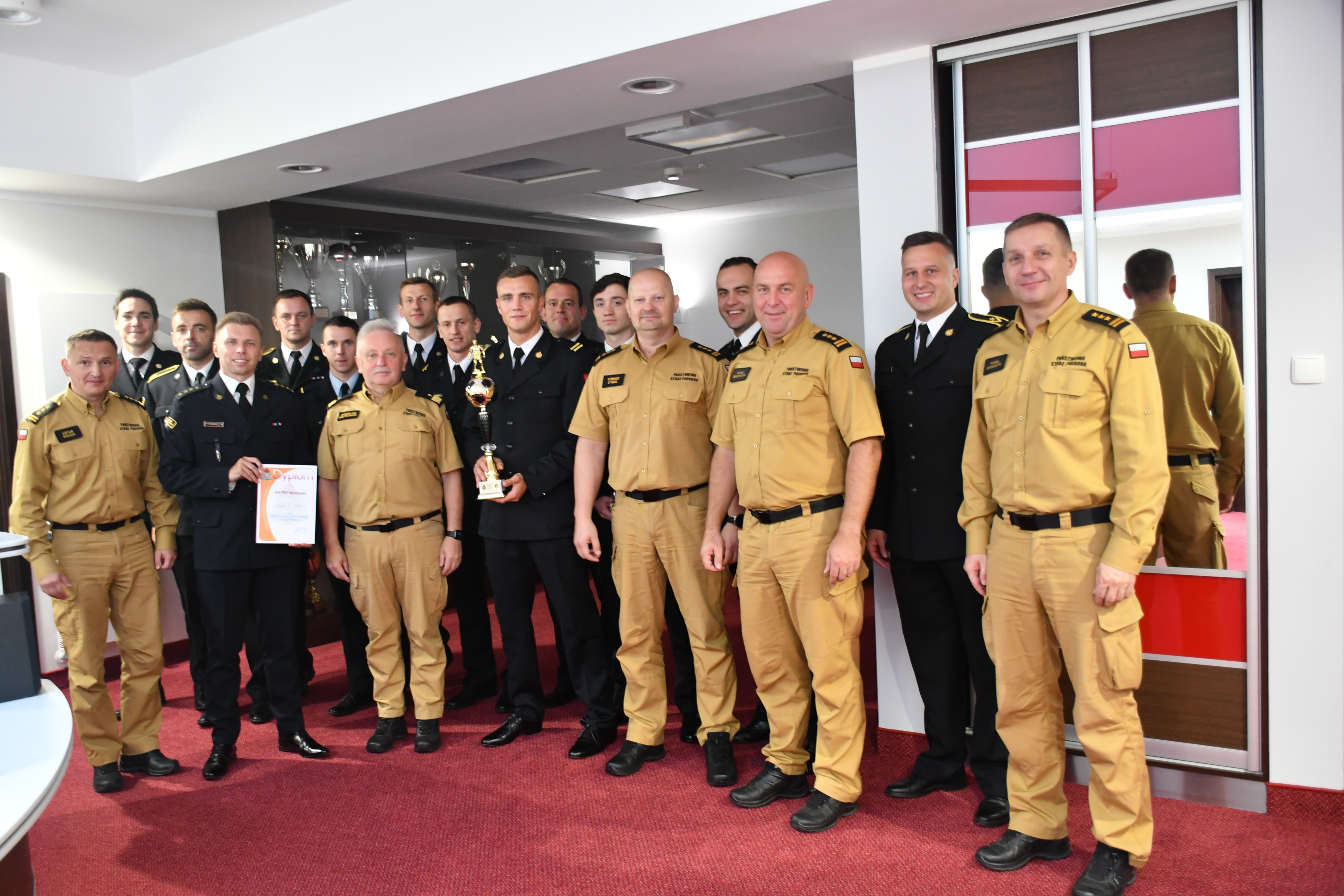 Podczas spotkania sportowcy przekazali zdobyte na mistrzostwach puchar i dyplom na ręce Mazowieckiego Komendanta Wojewódzkiego PSP.