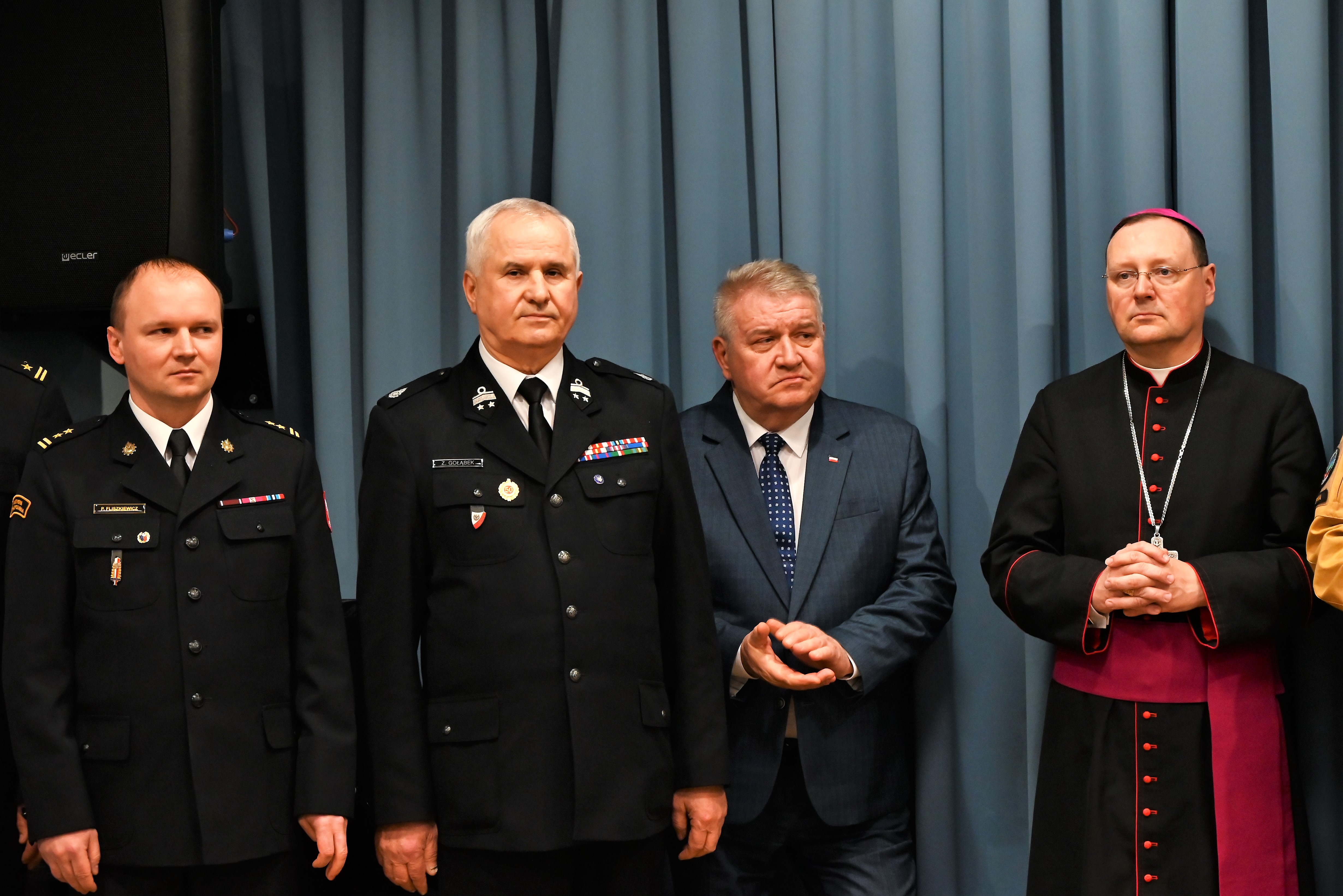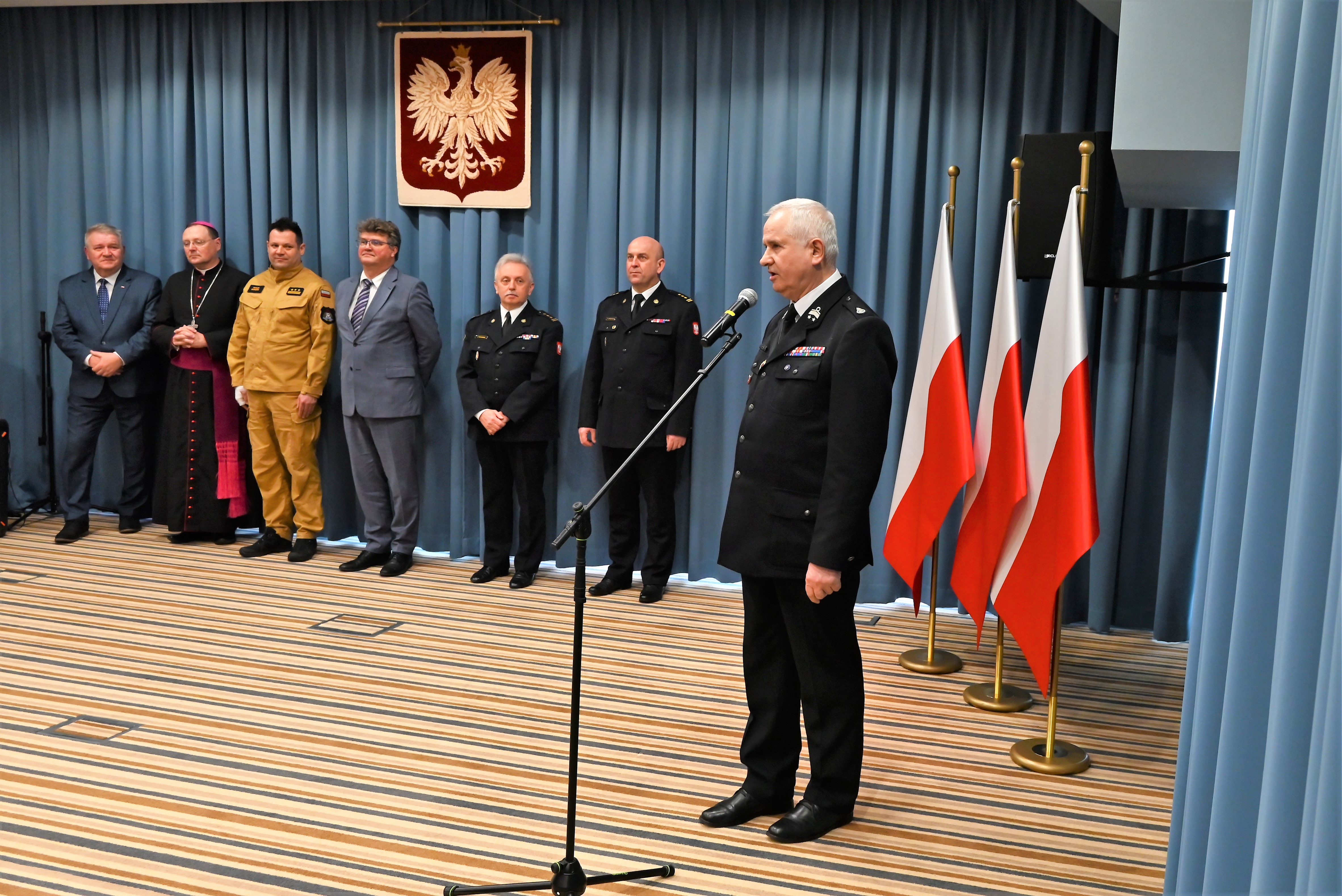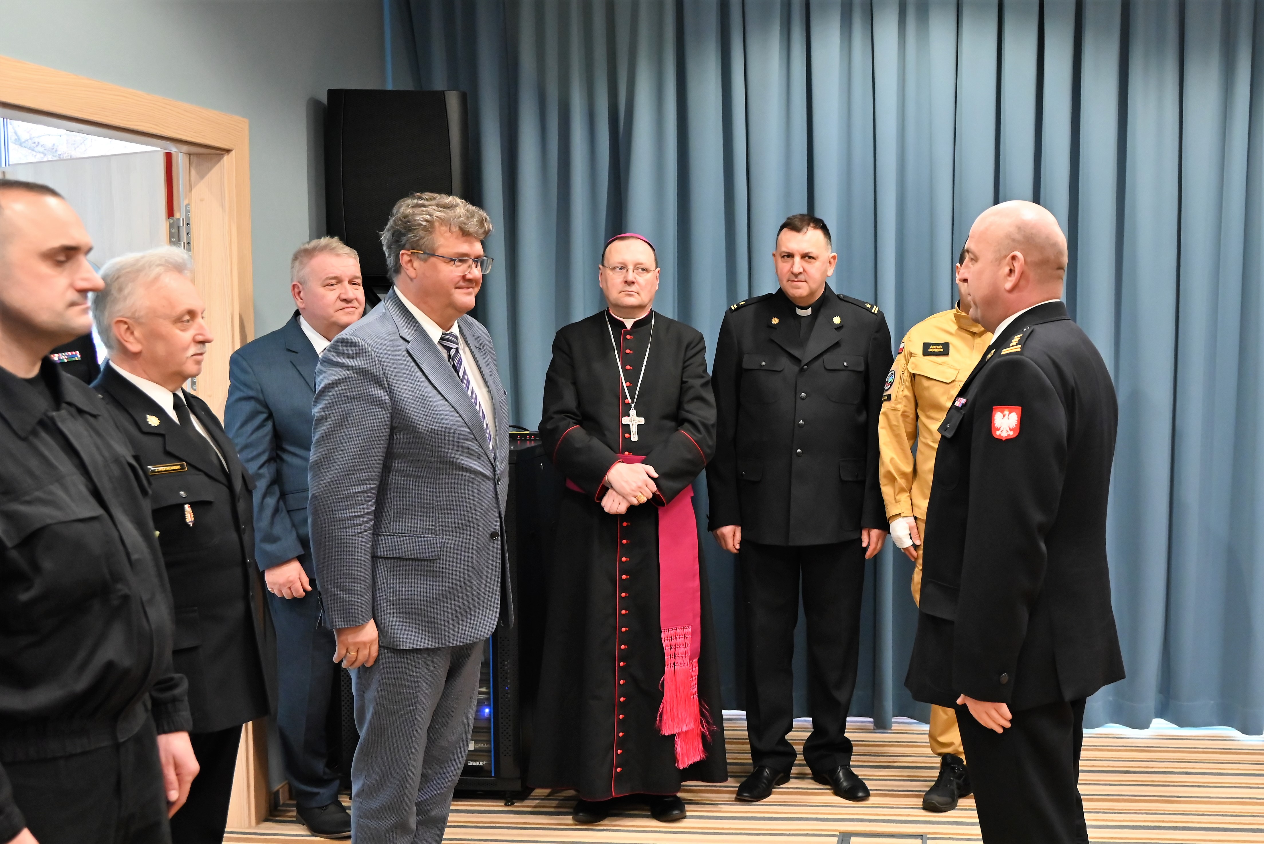 Gospodarz spotkania st. bryg. Jarosław Piotrowski Mazowiecki Komendant Wojewódzki PSP złożył zebranym najserdeczniejsze życzenia świąteczne. Następnie ks. Bp Jacek Grzybowski wygłosił refleksje na temat zbliżającego się Dnia Zmartwychwstania Pańskiego oraz poświęcił przygotowane pokarmy.