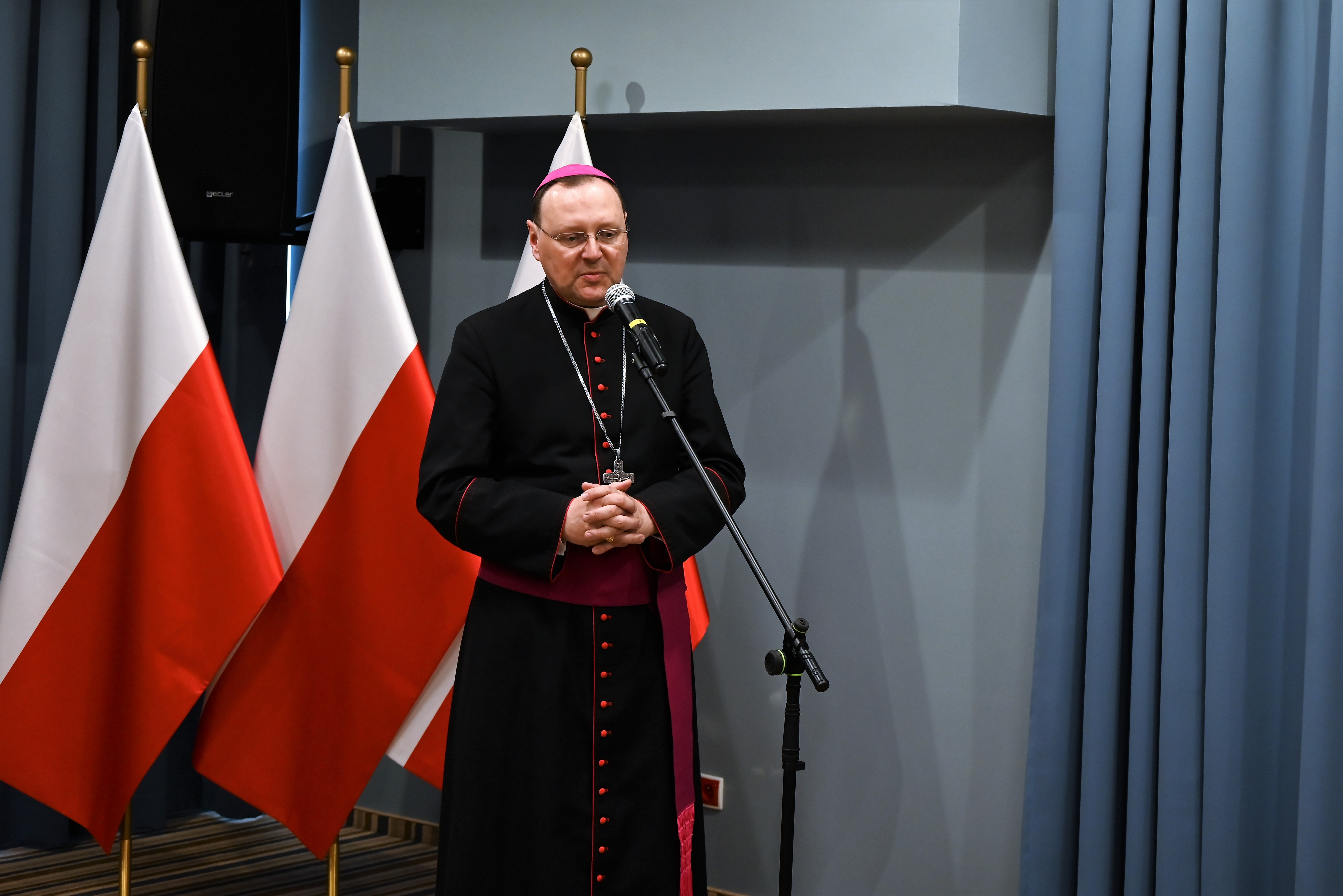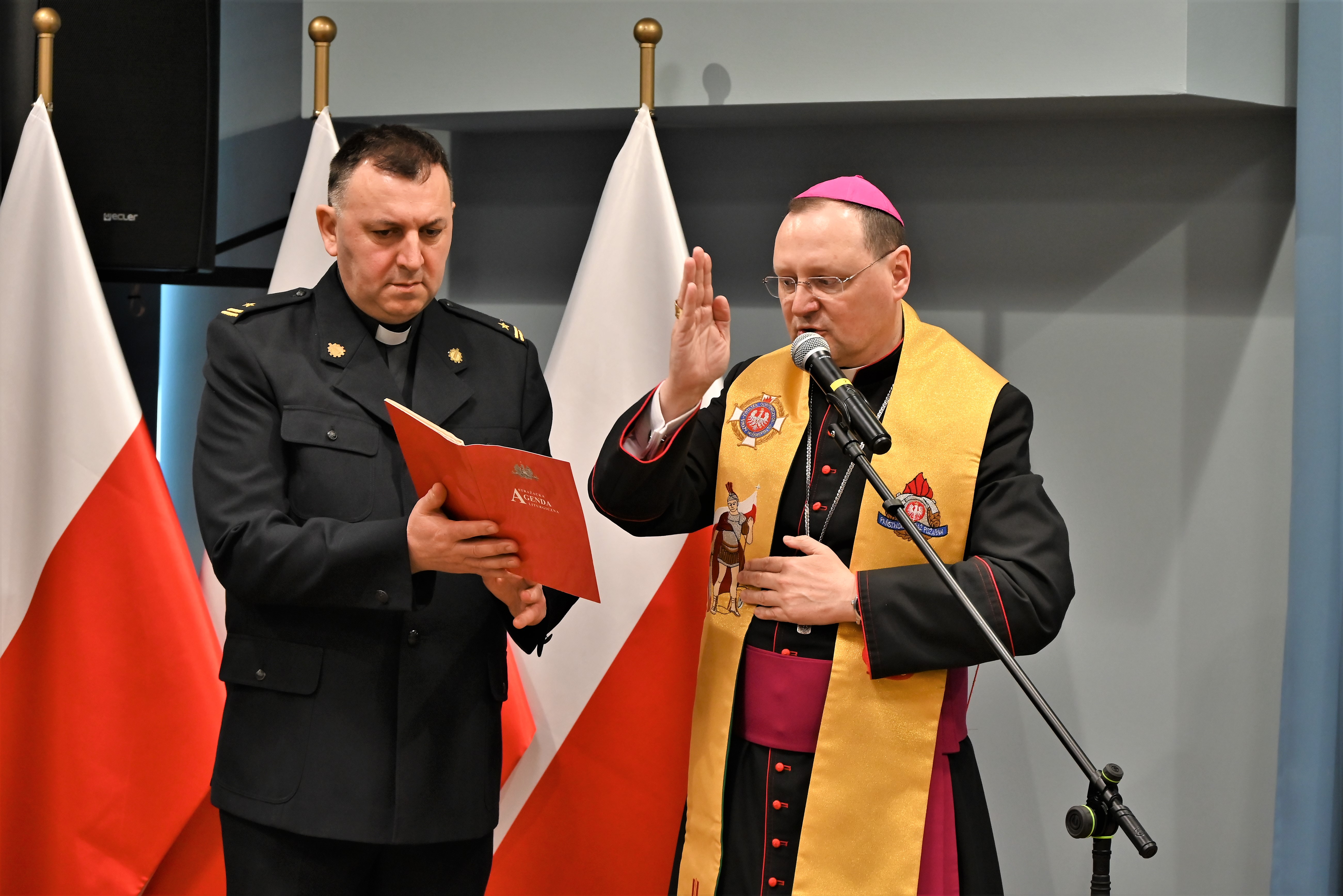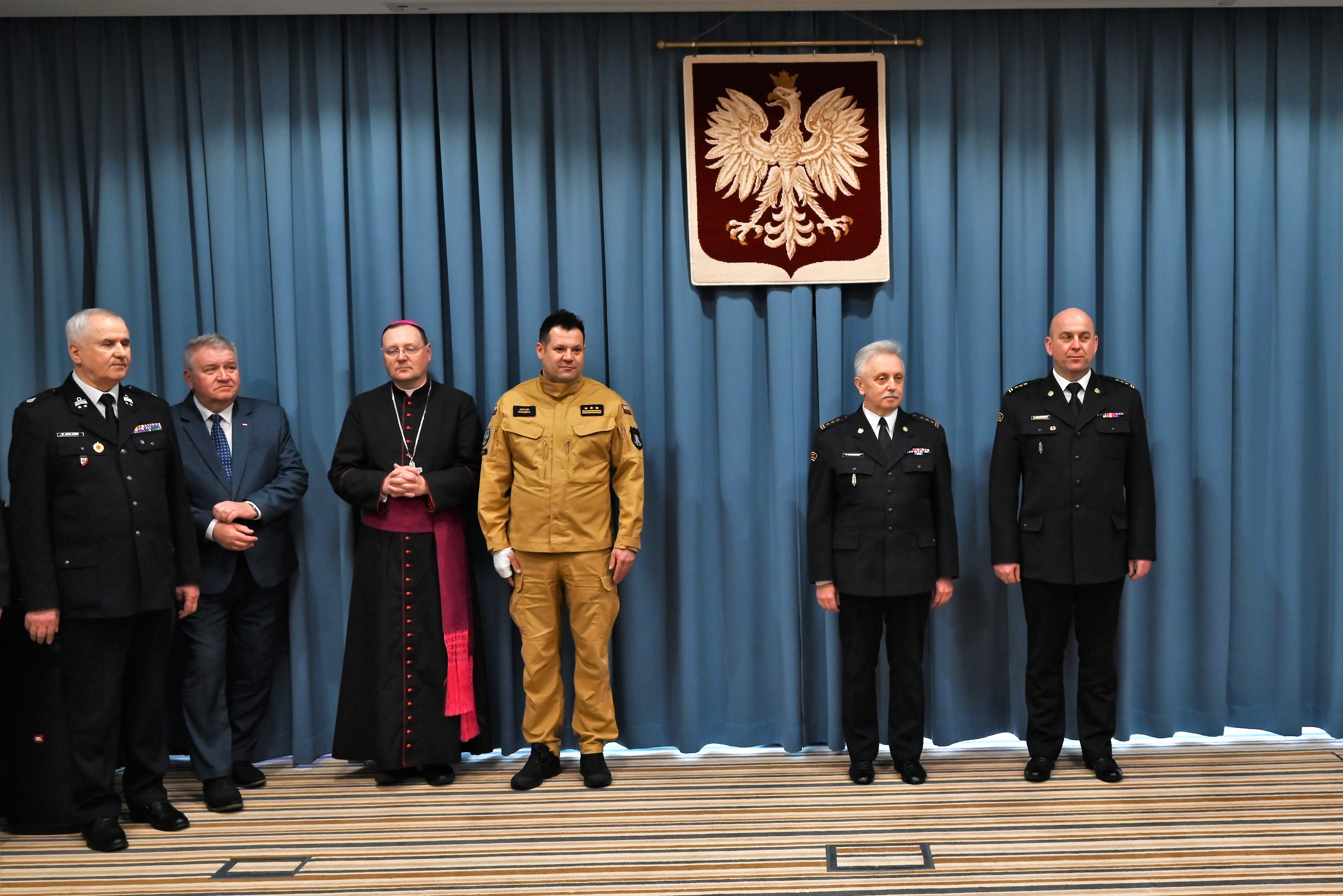 Gospodarz spotkania st. bryg. Jarosław Piotrowski Mazowiecki Komendant Wojewódzki PSP złożył zebranym najserdeczniejsze życzenia świąteczne. Następnie ks. Bp Jacek Grzybowski wygłosił refleksje na temat zbliżającego się Dnia Zmartwychwstania Pańskiego oraz poświęcił przygotowane pokarmy.