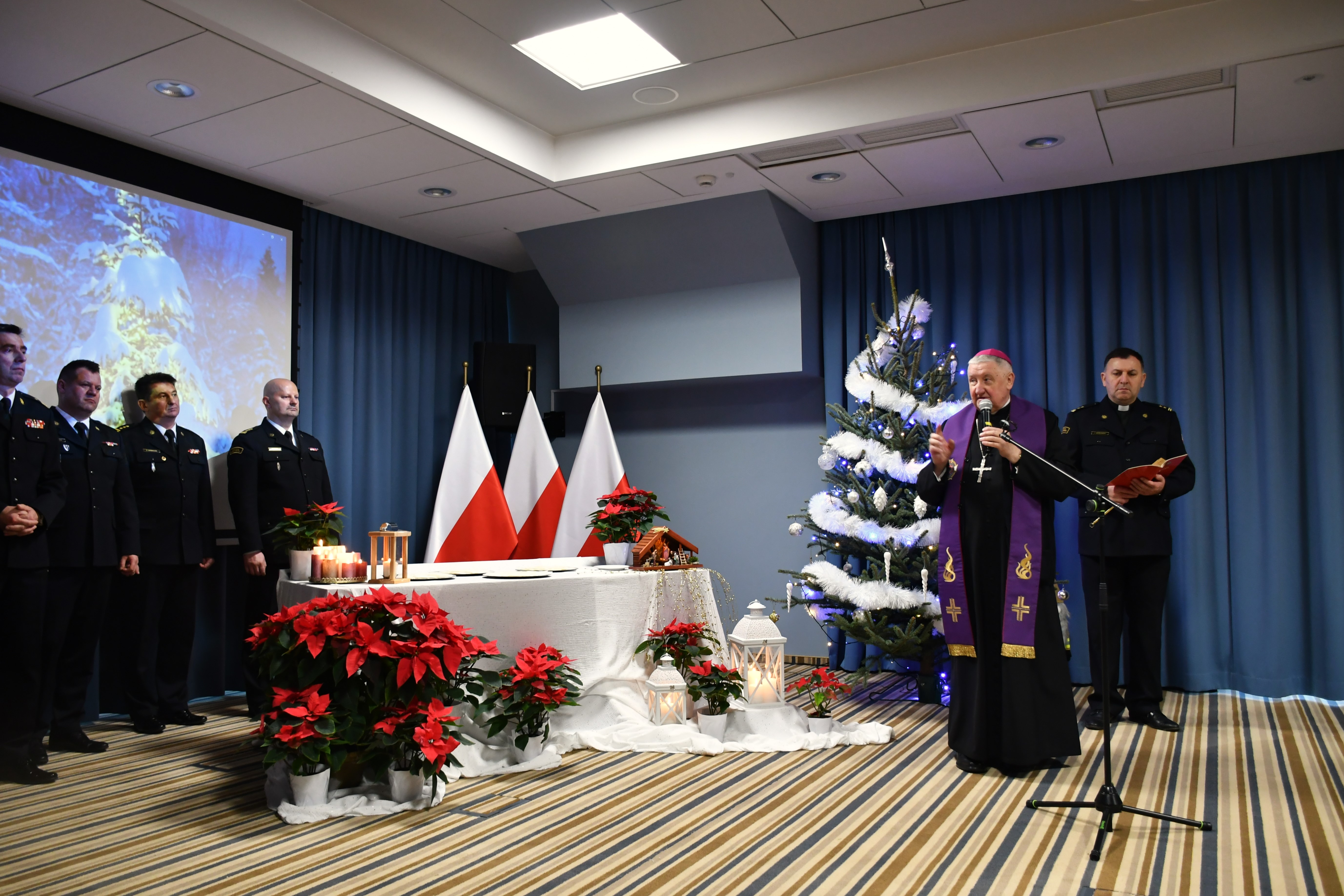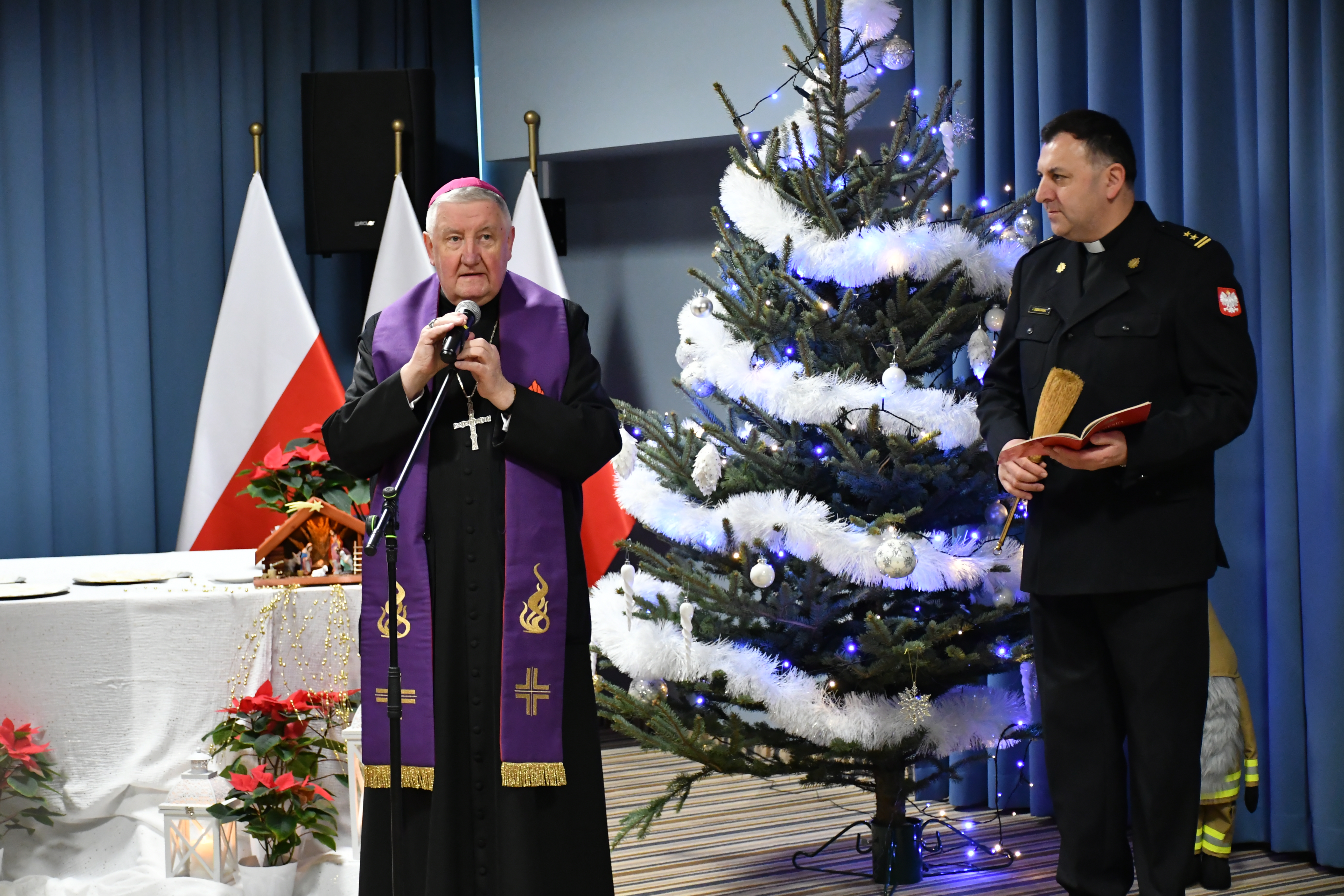 Jego Ekscelencja ks. Bp Romuald Kamiński – ordynariusz Diecezji Warszawsko-Praskiej w asyście ks. bryg. Jerzego Sieńkowskiego Kapelana Mazowieckich Strażaków przekazał Słowo Boże i pobłogosławił uczestników spotkania oraz poświęcił opłatek, którym podzielili się zgromadzeni.