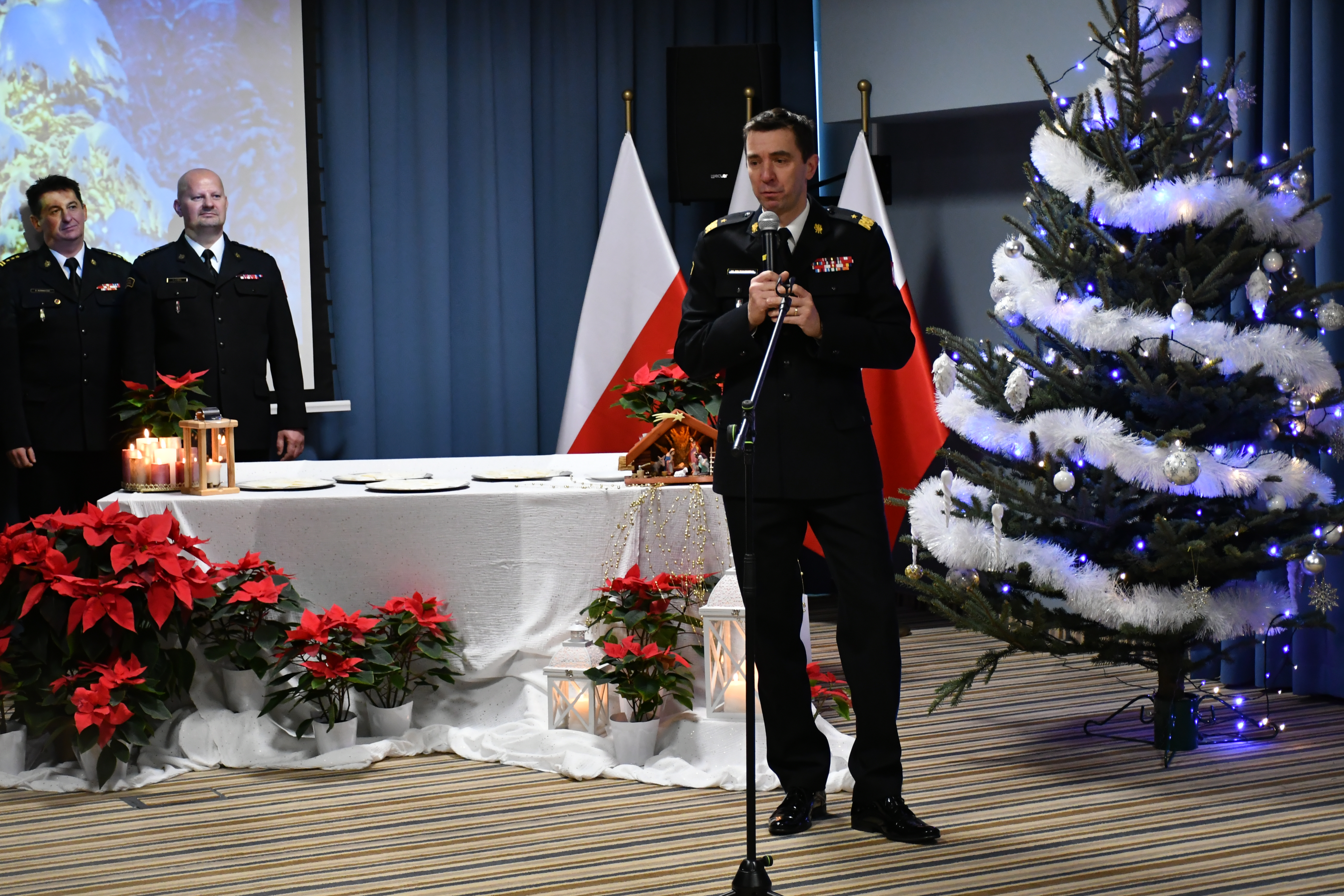 Mazowiecki Komendant Wojewódzki PSP nadbryg. Jarosław Piotrowski w imieniu własnym oraz swoich Zastępców życzył wszystkim zgromadzonym zdrowych i spędzonym w rodzinnej atmosferze Świąt Bożego Narodzenia oraz szczęśliwego Nowego Roku. Podziękował również zebranym za ich pełną poświęcenia codzienną pracę i niezawodność w realizacji zadań stawianych w misji pomocy drugiemu człowiekowi.