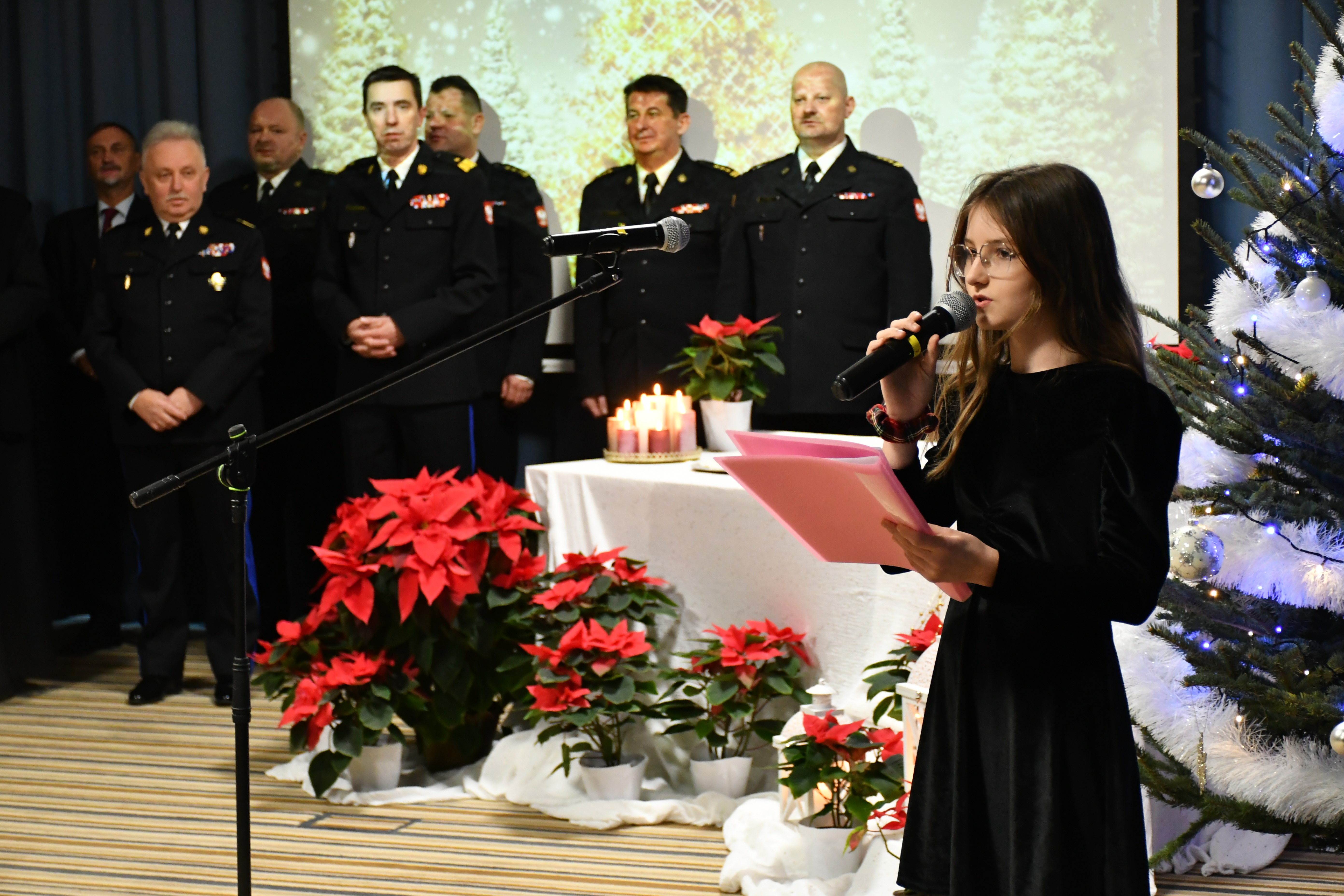 Opłatkowe spotkanie rozpoczęło się od wspólnego kolędowania, które poprowadziła córka funkcjonariusza naszej Komendy – Antonina Bobrowska. Tosia śpiewała tradycyjne polskie kolędy, wprowadzając wszystkich w świąteczny nastrój.