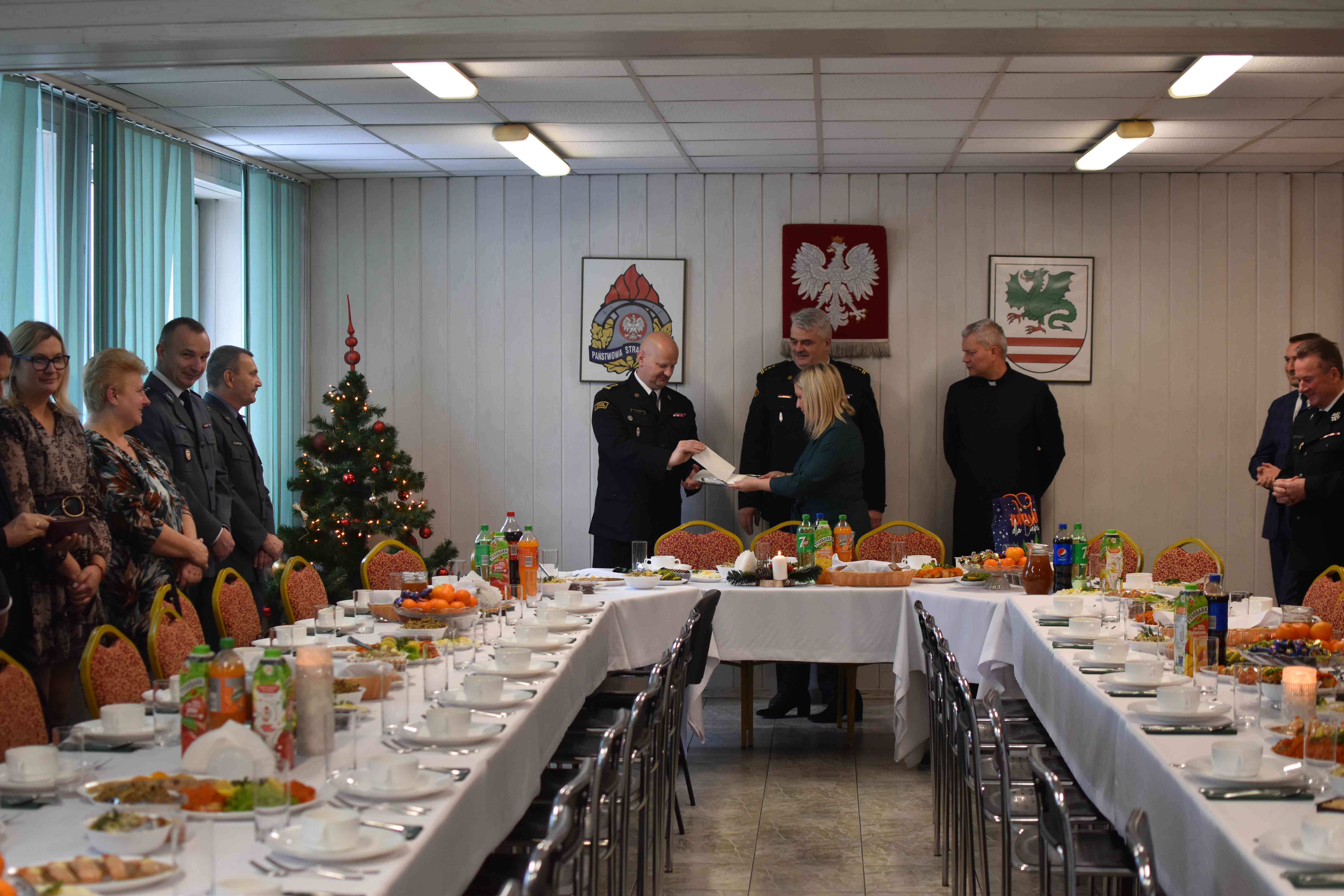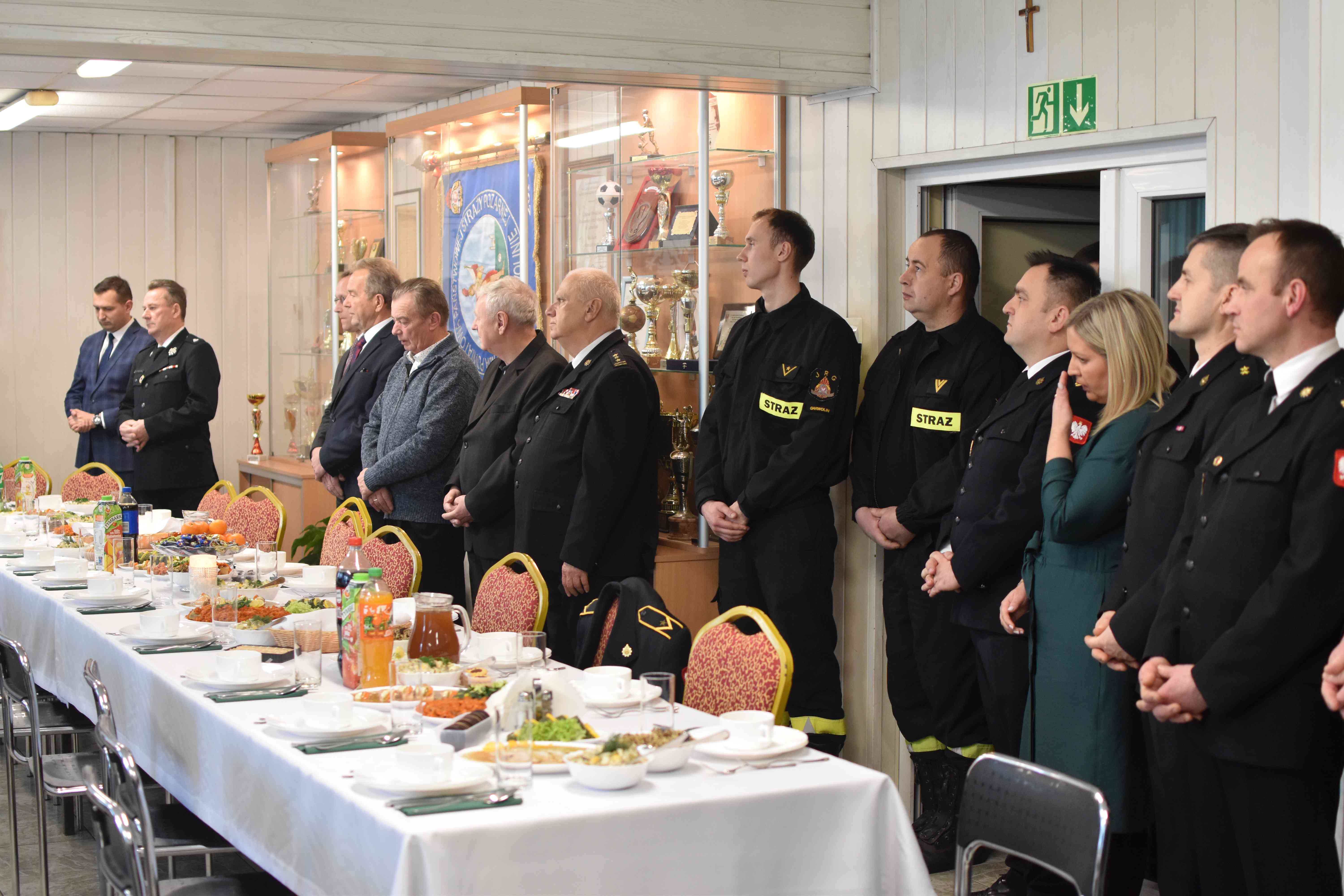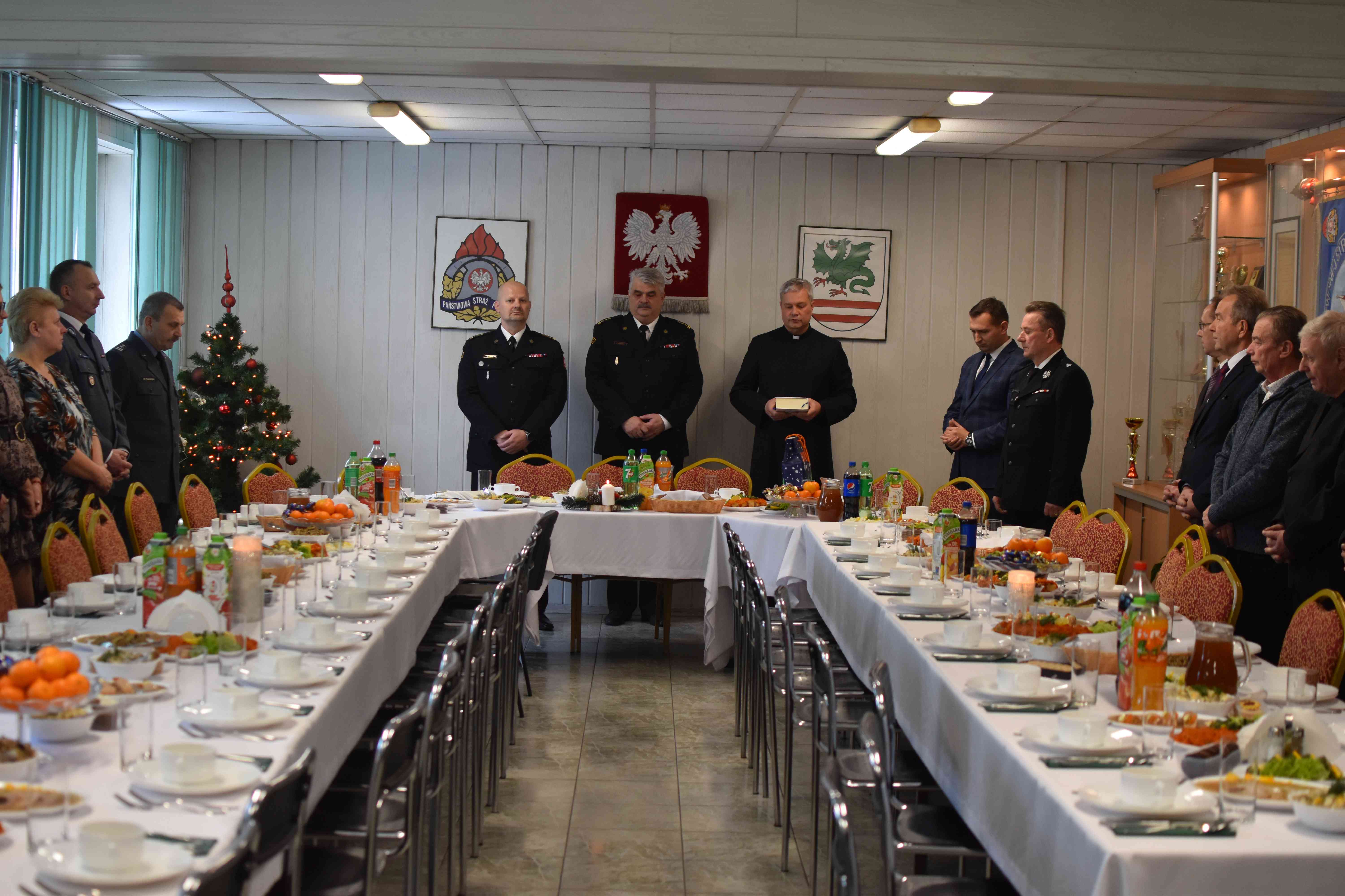 Następnie odczytano fragment Ewangelii o narodzeniu Jezusa, po czym wspólnie odśpiewano kolędę. Zaproszeni goście w swoich przemówieniach życzyli zarówno zdrowia, szczęścia osobistego, rodzinnego, jak i tego bardzo potrzebnego w strażackiej służbie społeczeństwu. W dalszej części spotkania uczestnicy podzielili się opłatkiem i składali sobie najserdeczniejsze życzenia świąteczne.