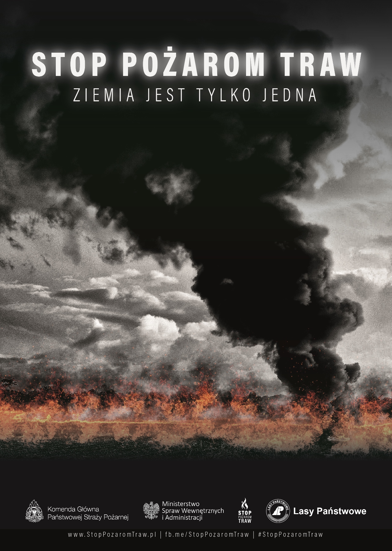 Grafika przedstawiająca drzewo na łące. Polowa drzewa jest zielona, a druga polowa w trakcie pożaru. Biały napis: Stop Pożarom Traw. Ziemia jest tylko jedna. Na dole białe logotypy patronów akcji