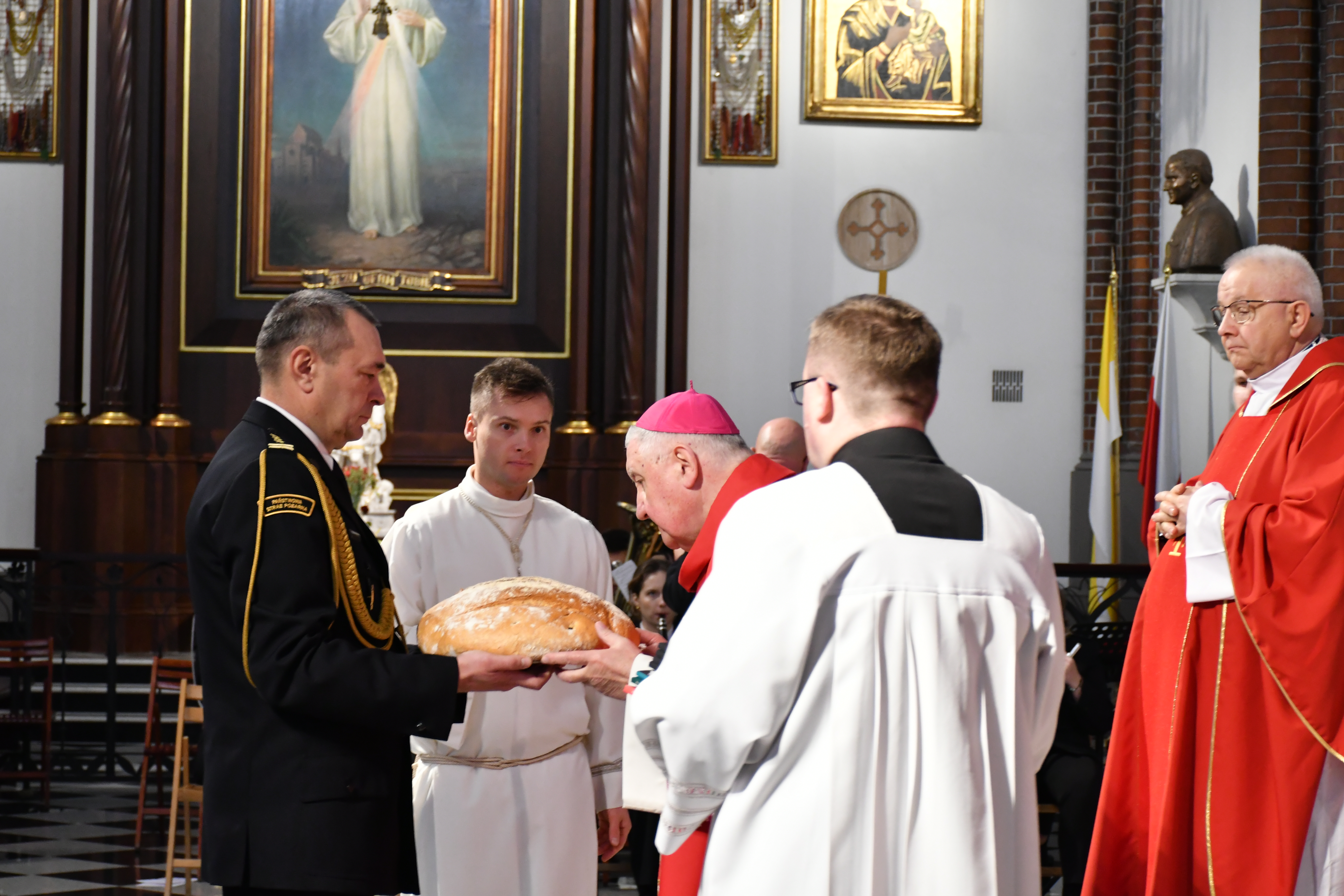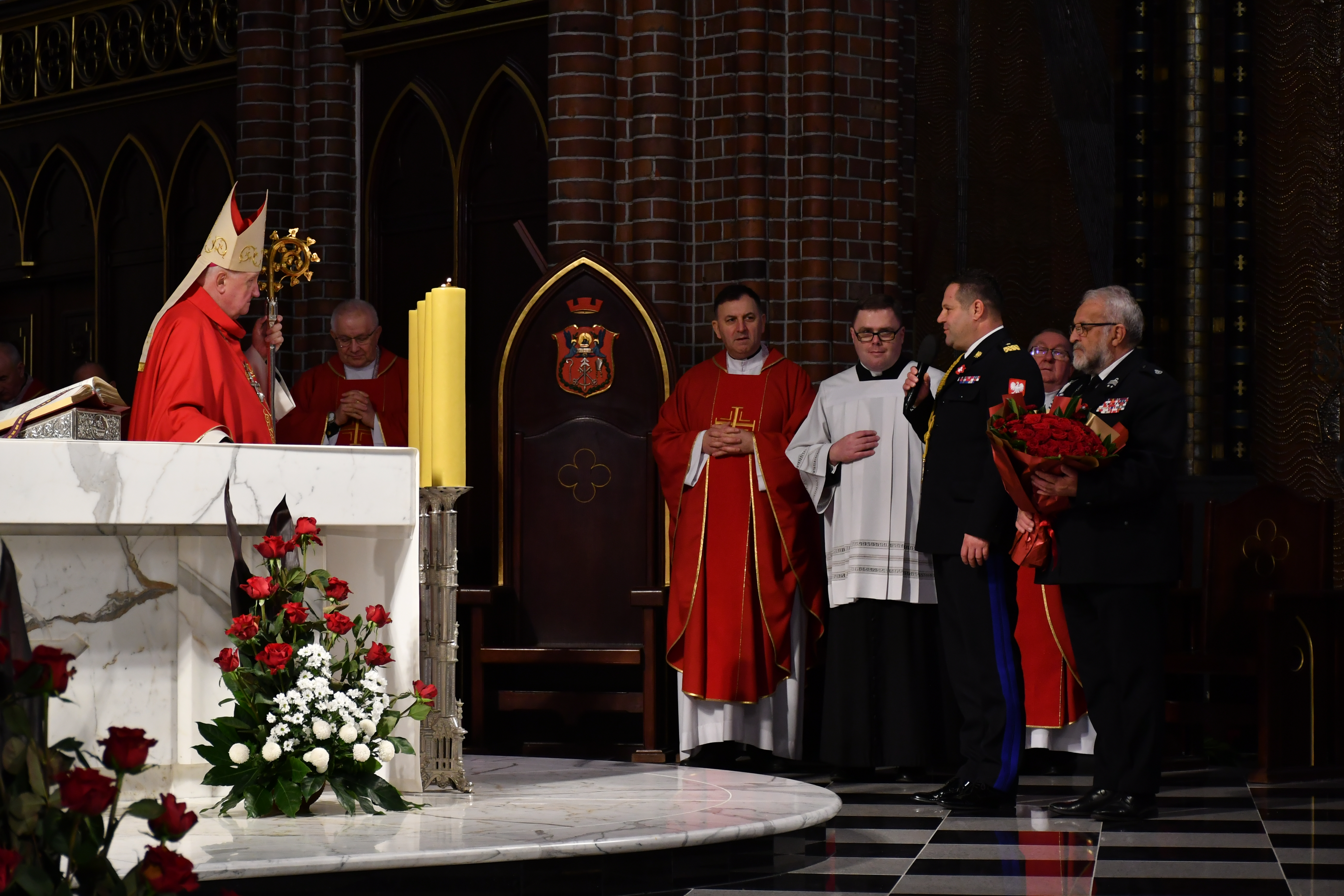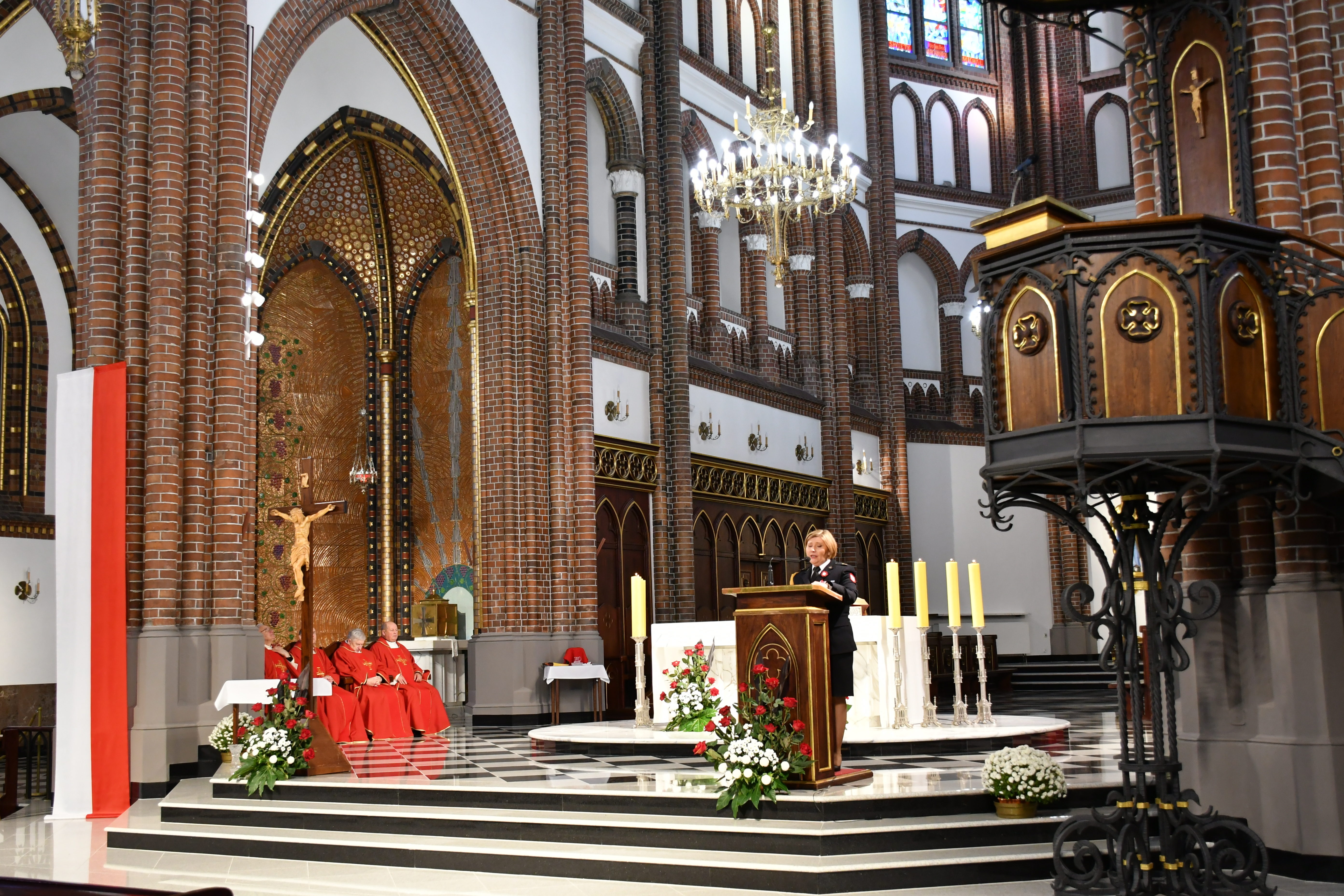 Msza Święta, którą koncelebrował ks. bp. Romuald Kamiński, rozpoczęła się odśpiewaniem hymnu państwowego RP "Mazurka Dąbrowskiego". W 107. rocznicę odzyskania przez Polskę niepodległości symbolicznie złożono na ołtarzu chleb, polskie kwiaty, a także wino, wodę i hostię białą.