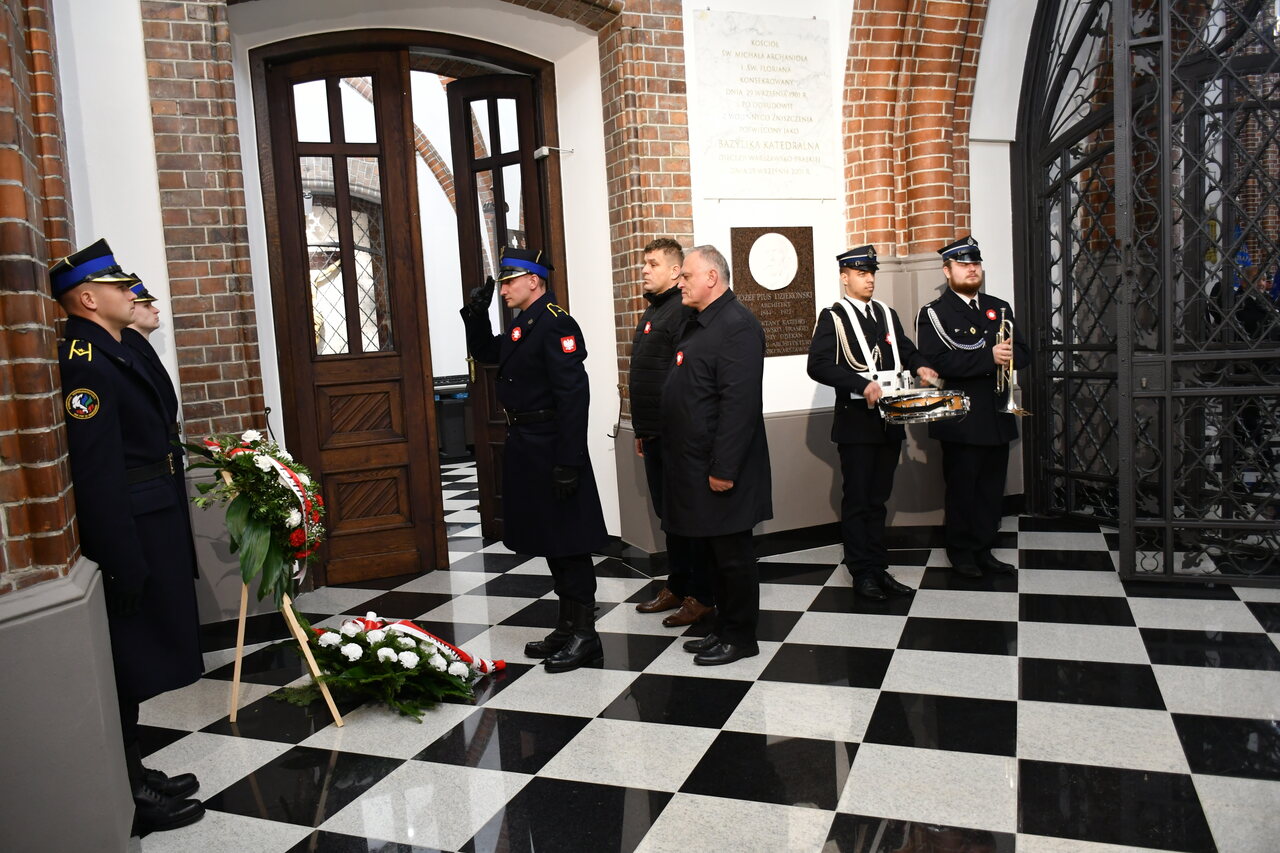 Po Mszy Świętej nastąpiło uroczyste złożenie wieńców przy tablicy upamiętniającej strażaków poległych w walkach o niepodległość Ojczyzny oraz tych, którzy zginęli w akcjach ratowniczo-gaśniczych.