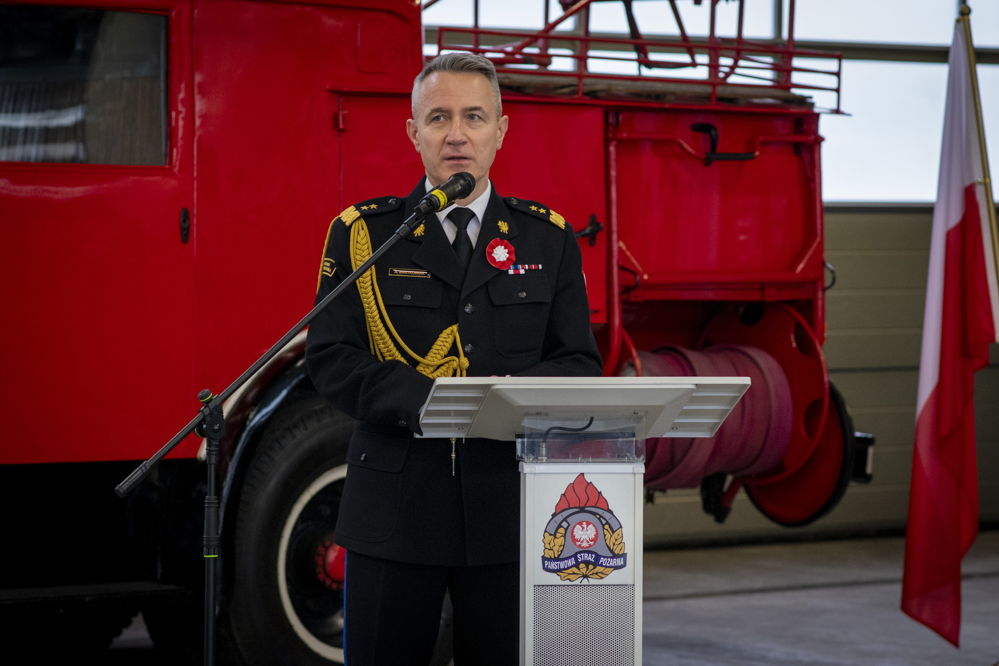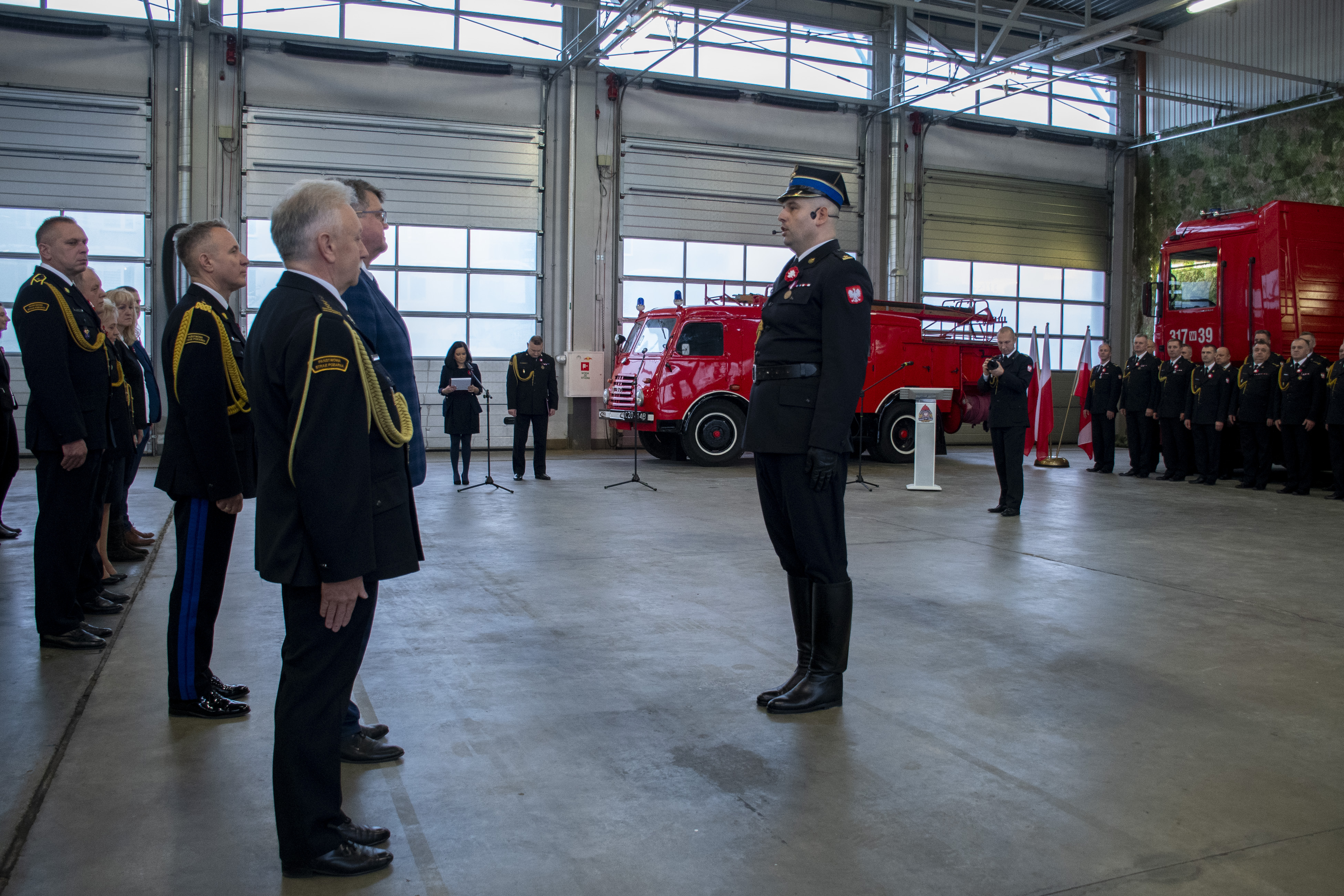 Następnie Mazowiecki Komendant Wojewódzki PSP st. bryg. Jarosław Piotrowski powitał przybyłych gości, strażaków, pracowników cywilnych oraz podczas wystąpienia powiedział:  „W tym uroczystym dniu pamiętajmy, że swój udział w procesie odzyskiwania niepodległości mieli również strażacy ogniowi. To oni również dbali o zachowanie tożsamości narodu, języka, kultury i wiary podczas codziennej służby. To dzisiaj niepodległość, wolność pozwala nam stanąć na uroczystej zbiórce i podziękować, wyróżnić za codzienny trud służby. (…) Ten rok i poprzednie lata to okres w którym Polski Strażak wspierał działania związane z pandemią, niósł pomoc ludności ukraińskiej, wspierał ukraińskich strażaków, wspierał działania gaśnicze strażaków w Europy. W tym uroczystym dniu gdy wspólnie celebrujemy Narodowe Święto Niepodległości gratuluję wszystkim awansowanym, wyróżnionym, odznaczonym oraz życzę dalszych wyróżnień. Pragnę również podziękować moim strażakom i pracownikom cywilnym za codzienny trud służby oraz postawę, która daje poczucie bezpieczeństwa mieszkańcom ziemi mazowieckiej. Jestem pewien, że mieszkańcy tej ziemi, ziemi mazowieckie,j są z Was dumni za to co robicie na co dzień w służbie.”