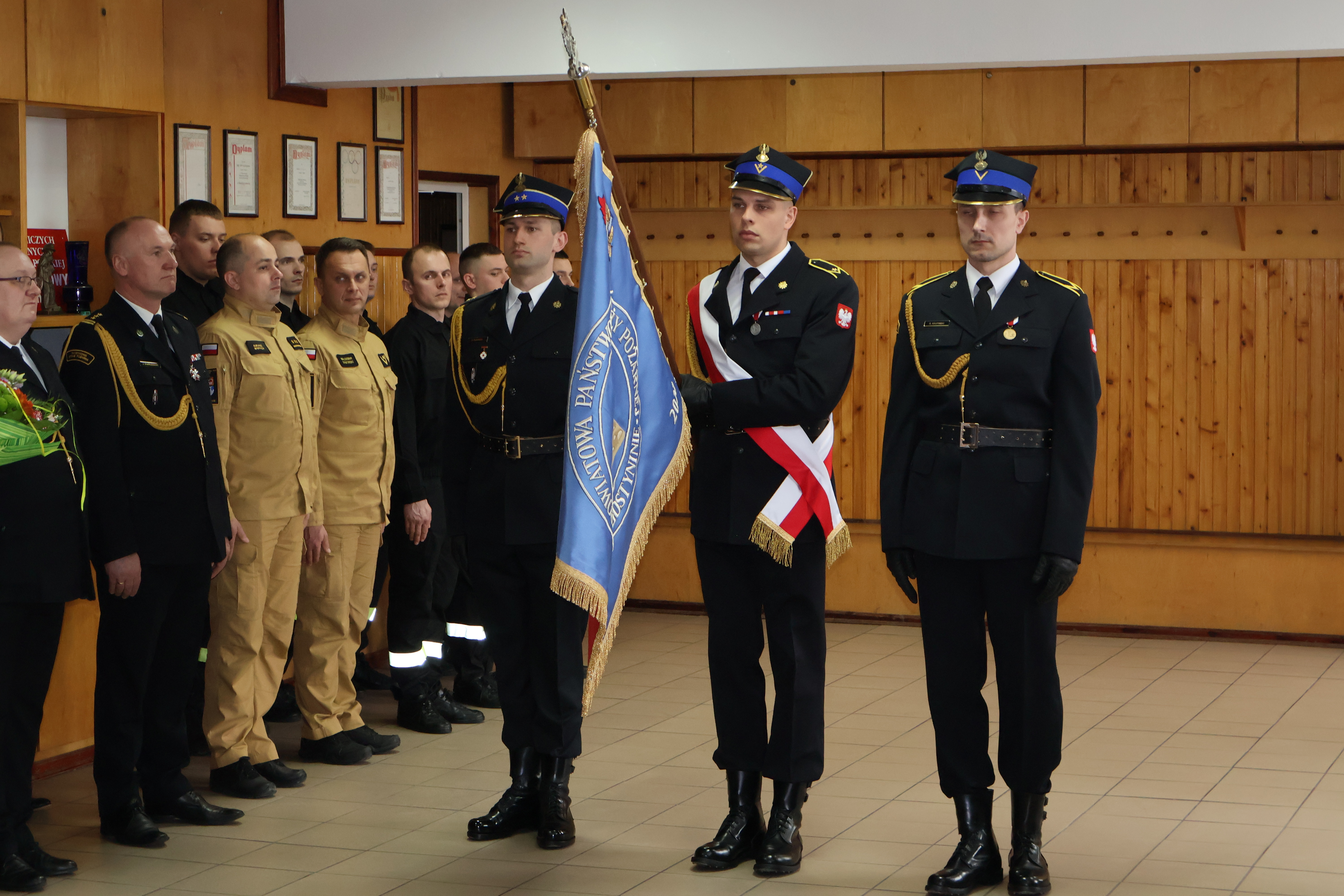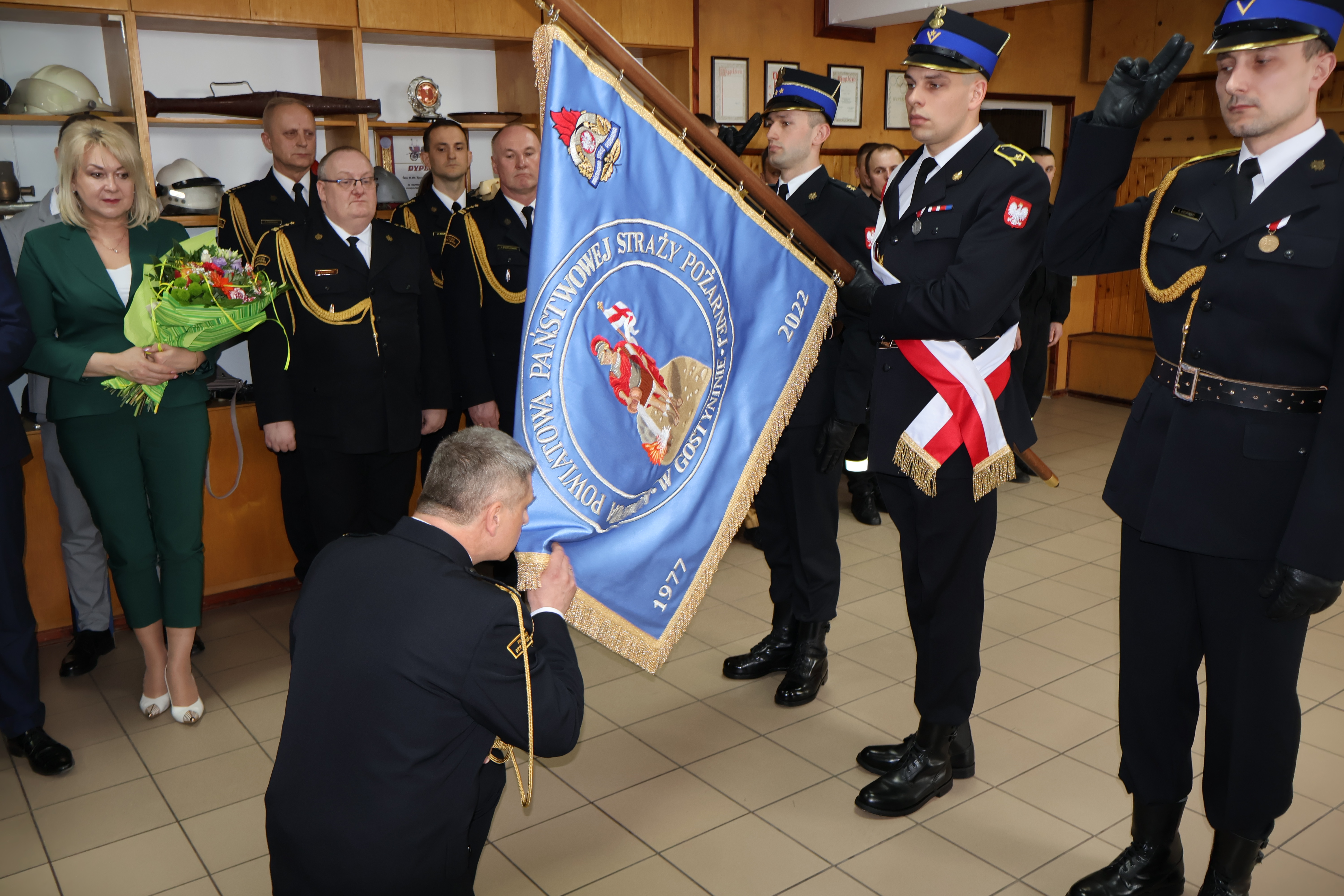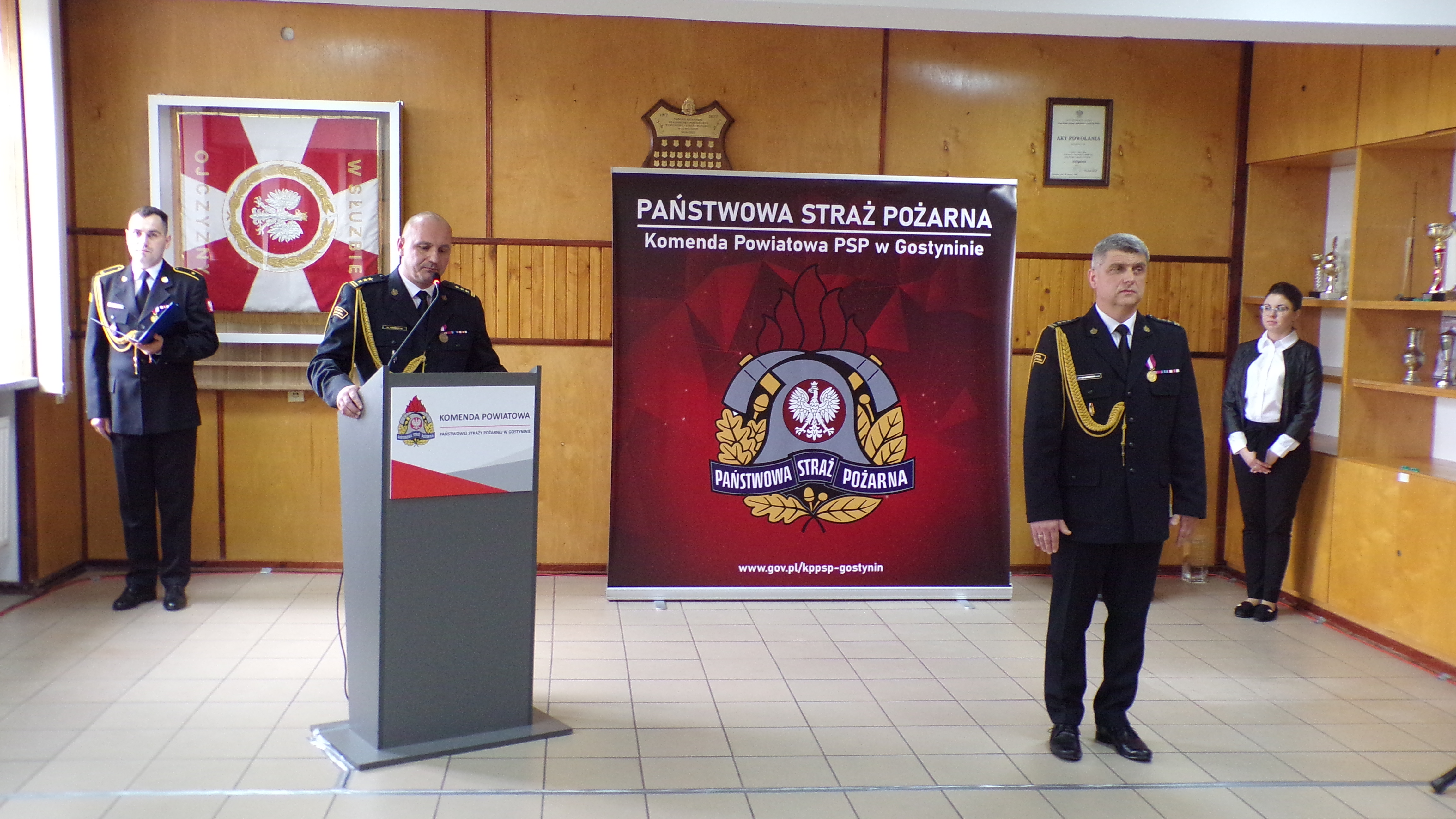 Uroczysta zbiórka rozpoczęła się złożeniem przez dowódcę uroczystości meldunku, który przyjął st. bryg. Maciej Bieńczyk Zastępca Mazowieckiego Komendanta Wojewódzkiego PSP. Następnie wprowadzony został sztandar Komendy Powiatowej PSP w Gostyninie oraz odegrano hymn państwowy.