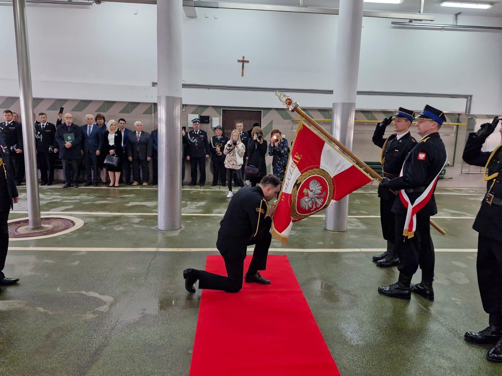 Punktem kulminacyjnym było odczytanie aktu powołania st. bryg. Leszka Falbowskiego, który symbolicznie przywitał się ze sztandarem Komendy Powiatowej PSP w Ostrowi Mazowieckiej, a następnie złożył meldunek o przyjęciu obowiązków.