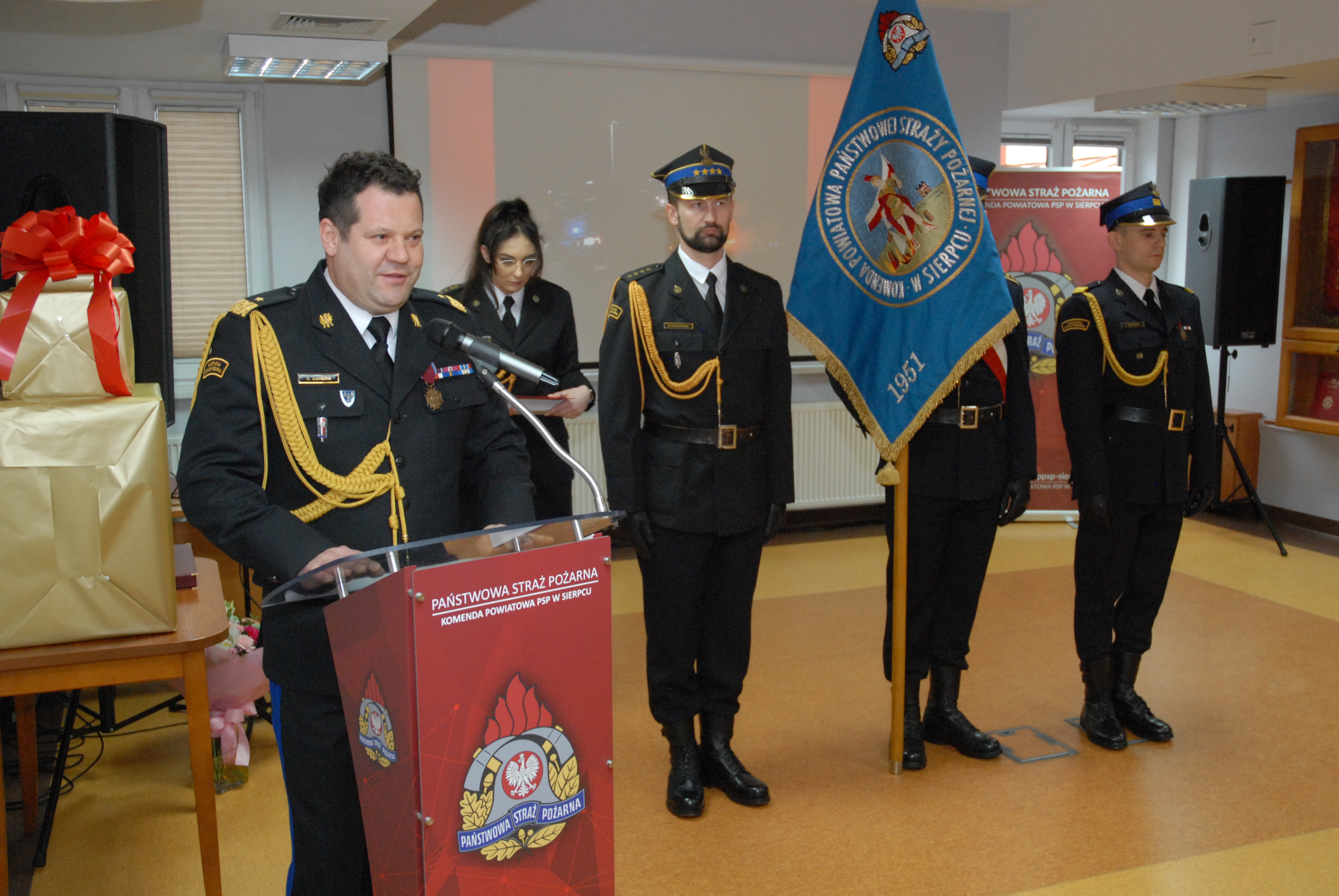 za blisko 35 lat służby w garnizonie mazowieckim oraz włożony wkład w zapewnienie bezpieczeństwa na terenie powiatu sierpeckiego oraz województwa mazowieckiego. Następnie pogratulował st. bryg. Pawłowi Sekulskiemu, któremu wręczył akt powierzenia obowiązków na stanowisku Komendanta Powiatowego PSP w Sierpcu, składając jednocześnie obu komendantom życzenia dalszych sukcesów w służbie oraz życiu prywatnym.