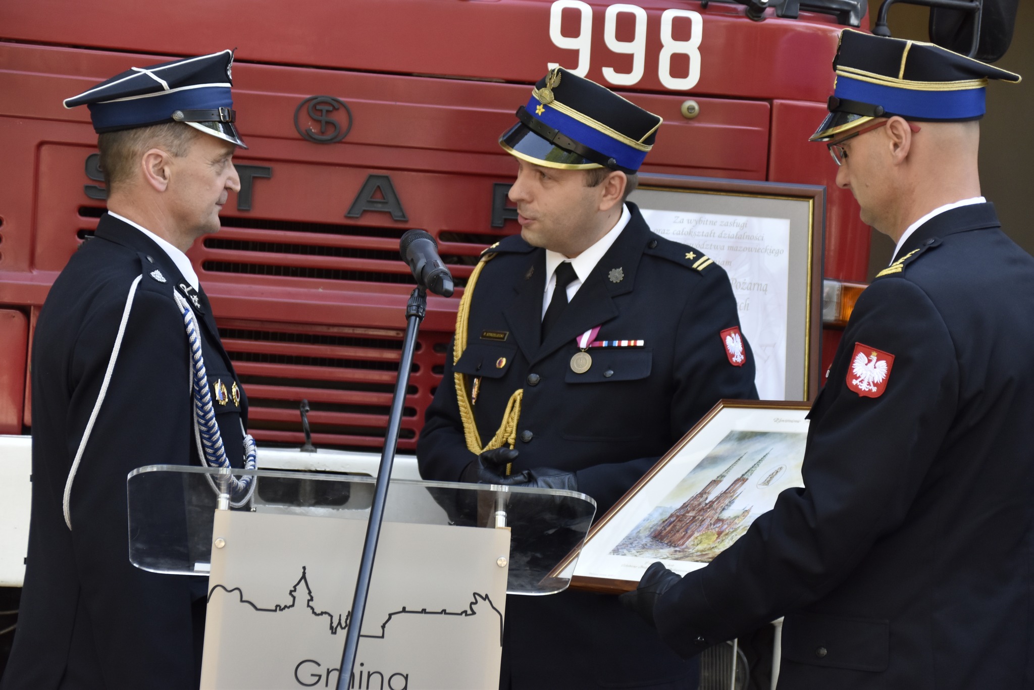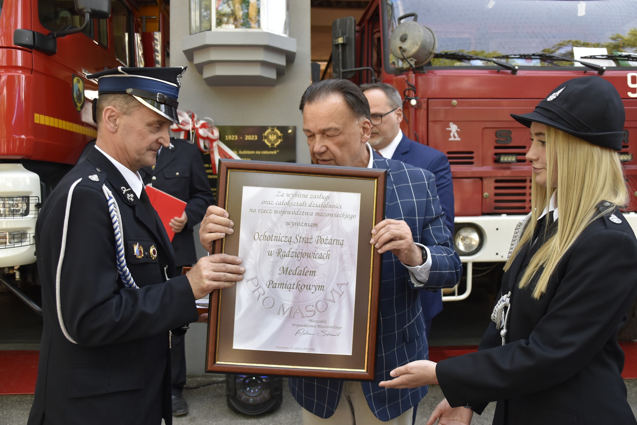 W dalszej kolejności, przedstawiciel Mazowieckiego Komendanta Wojewódzkiego PSP mł. bryg. Piotr Strzelecki z okazji 100-lecia jednostki w Radziejowicach wręczył Prezesowi OSP Wyróżnienie Honorowe - pamiątkowy obraz przedstawiający Katedrę św. Michała Archanioła i św. Floriana w Warszawie, nazywaną „Świątynią mazowieckich strażaków”.